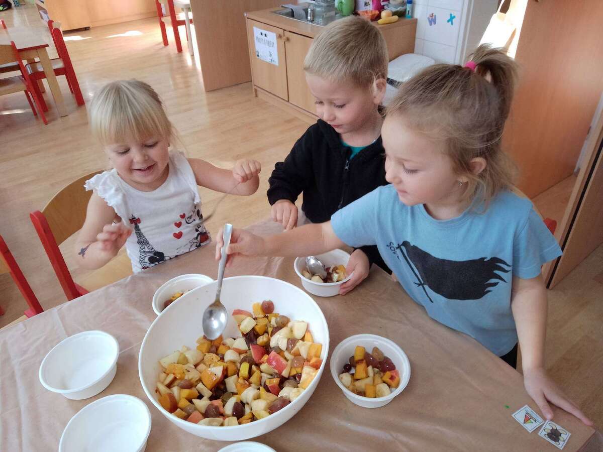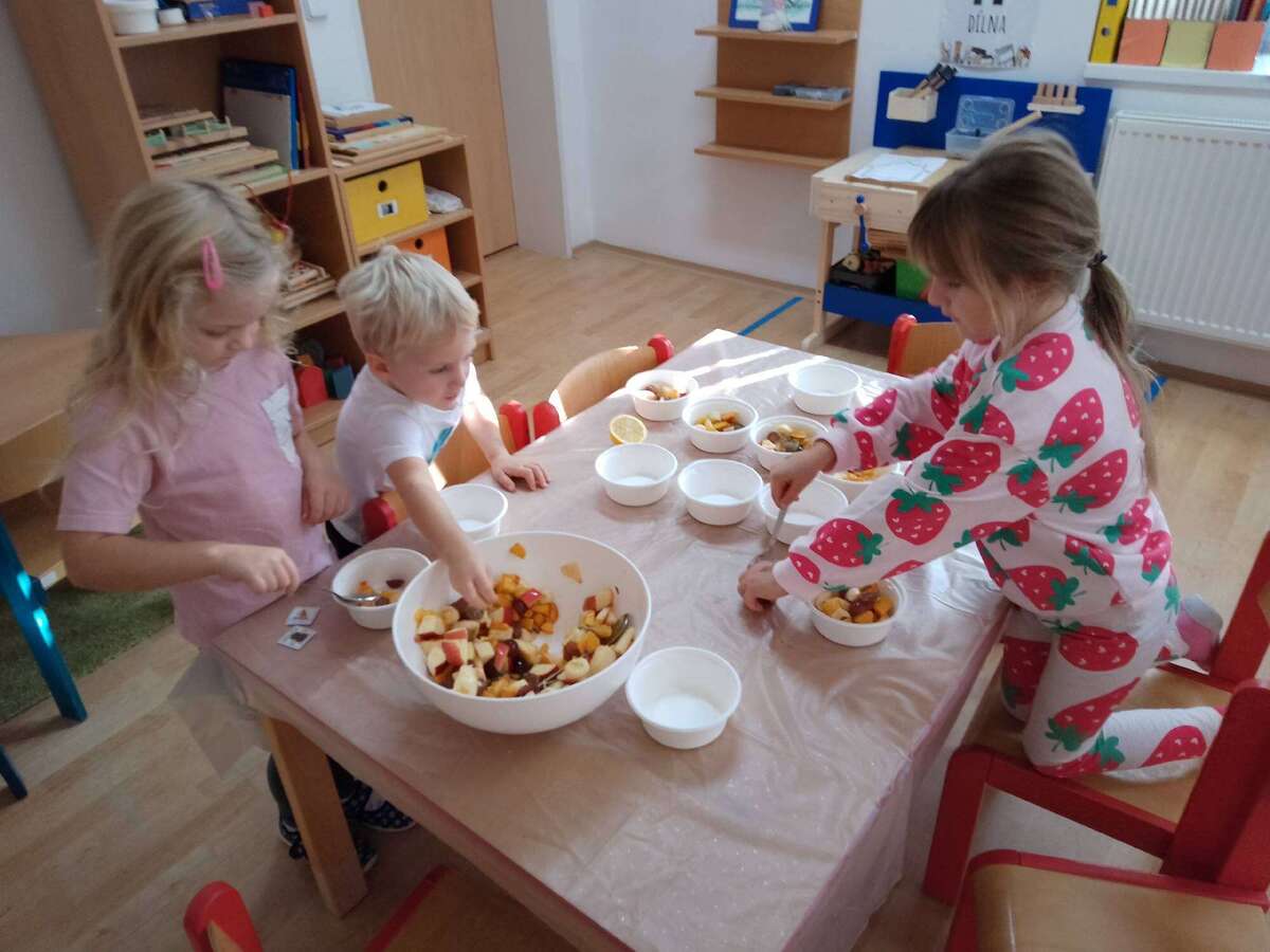 Děti ovoce umyly, nakrájely a promíchaly do salátu, který poté s radostí nabídly svým rodičům. Celá akce proběhla v příjemné a přátelské atmosféře.