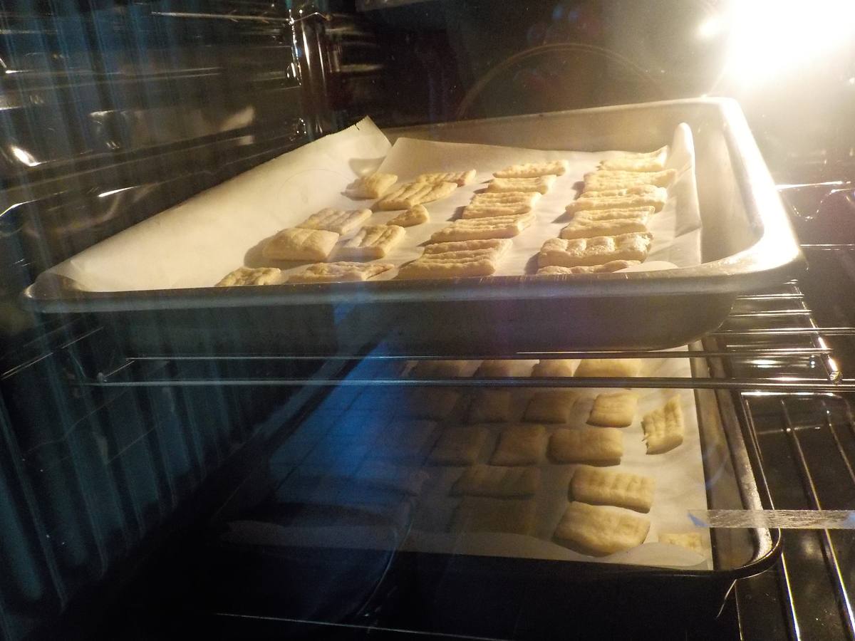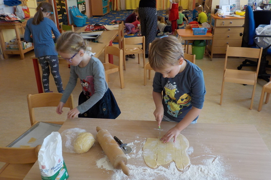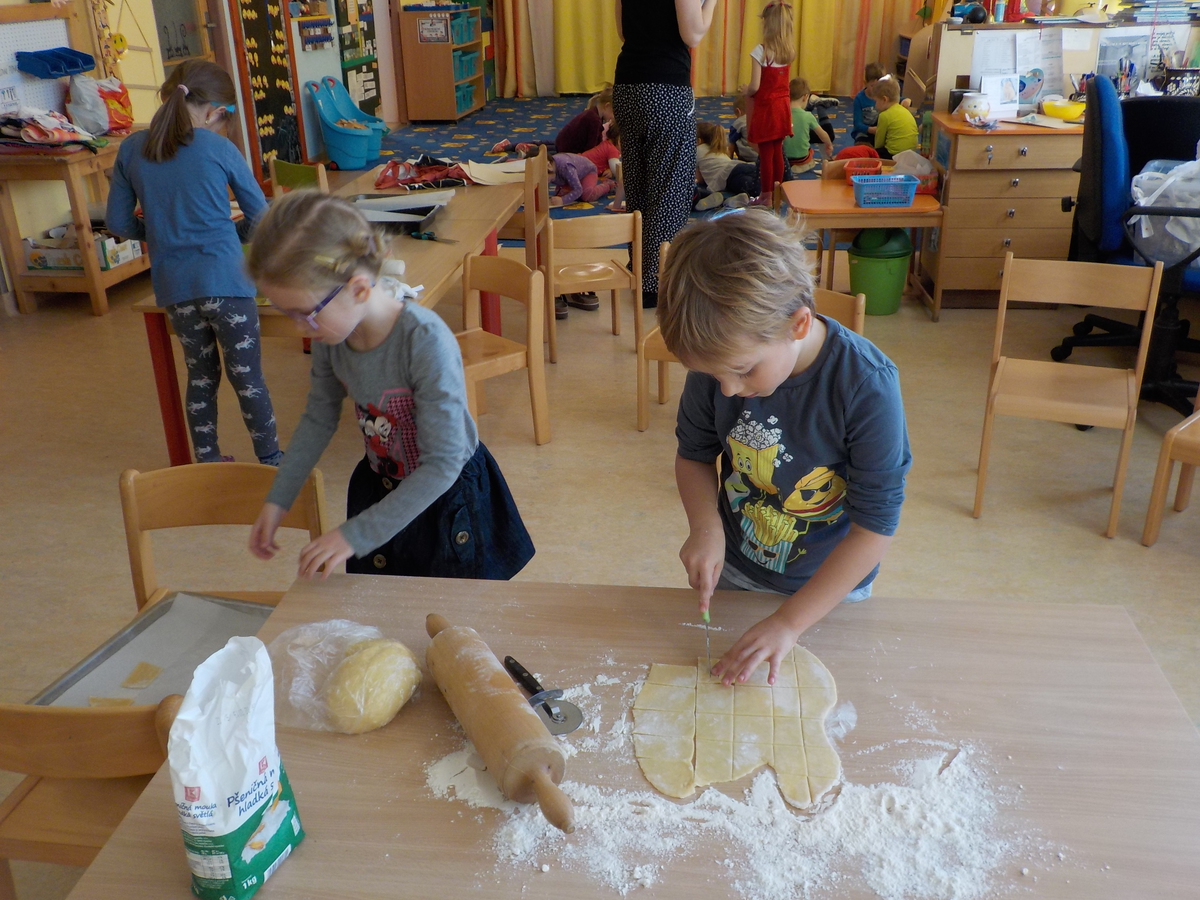 Potom přišel na řadu váleček. S těstem se moc hezky pracovalo a za chvíli již děti dávaly na plech malé obdélníčky těsta, které uprostřed jemně třikrát nařízly. A šup s plechem do trouby.