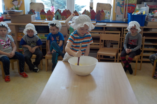 Po přečtení receptu jsme se pustili do přípravy těsta. Děti vážily, rozklepávaly vajíčka, oddělovaly bílky od žloutků, přelévaly, přesypávaly a mísily, až nám vzniklo krásné hladké těsto, které jsme dali na hodinu odpočinout do lednice.