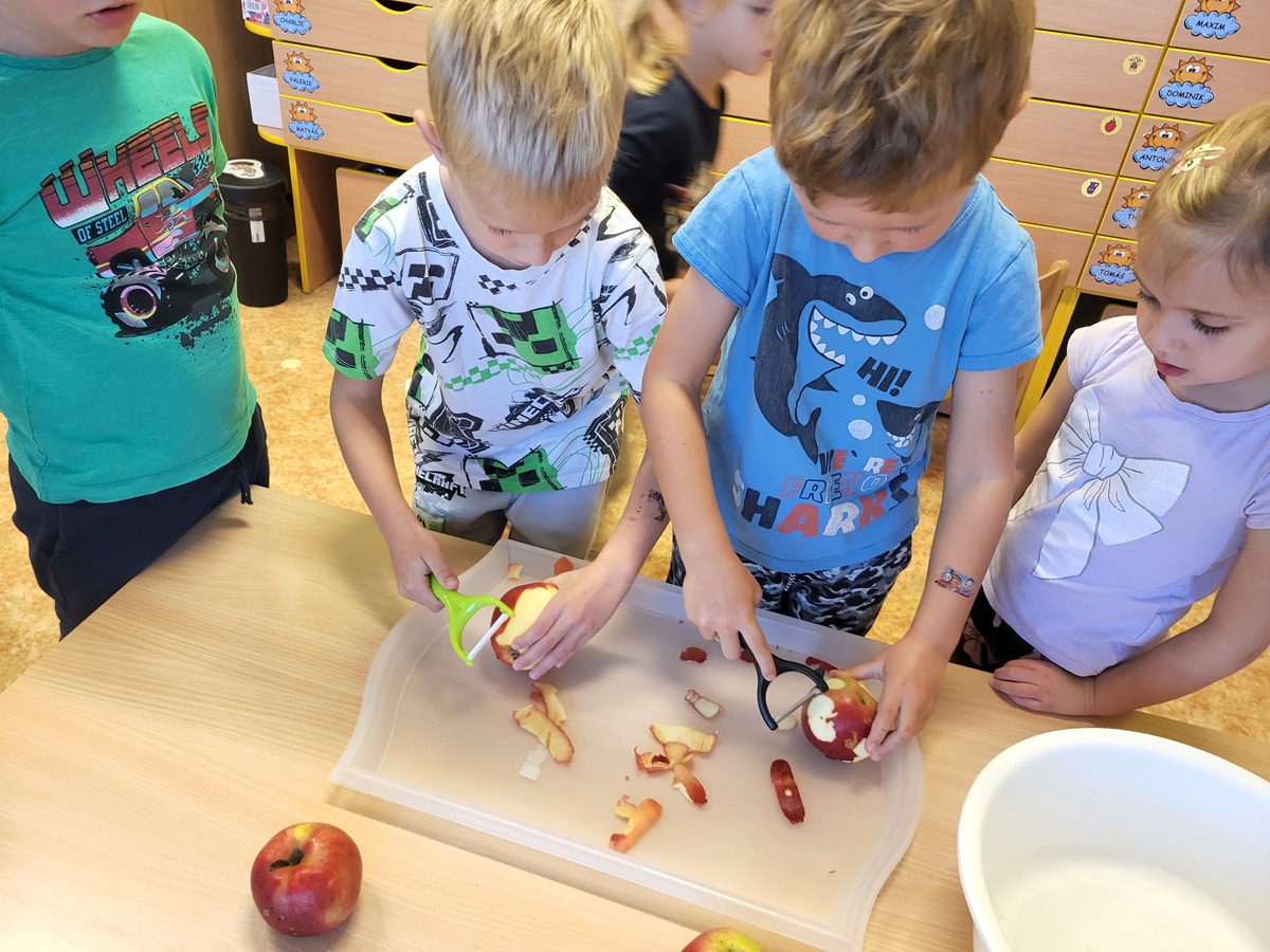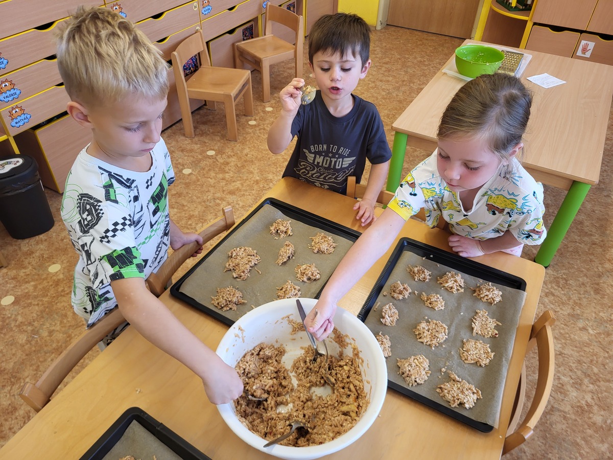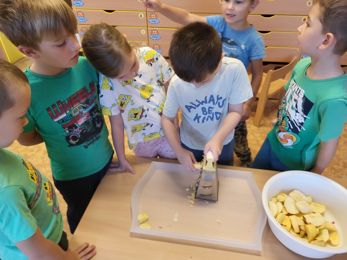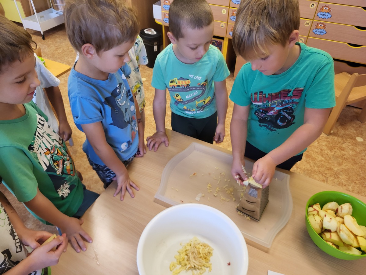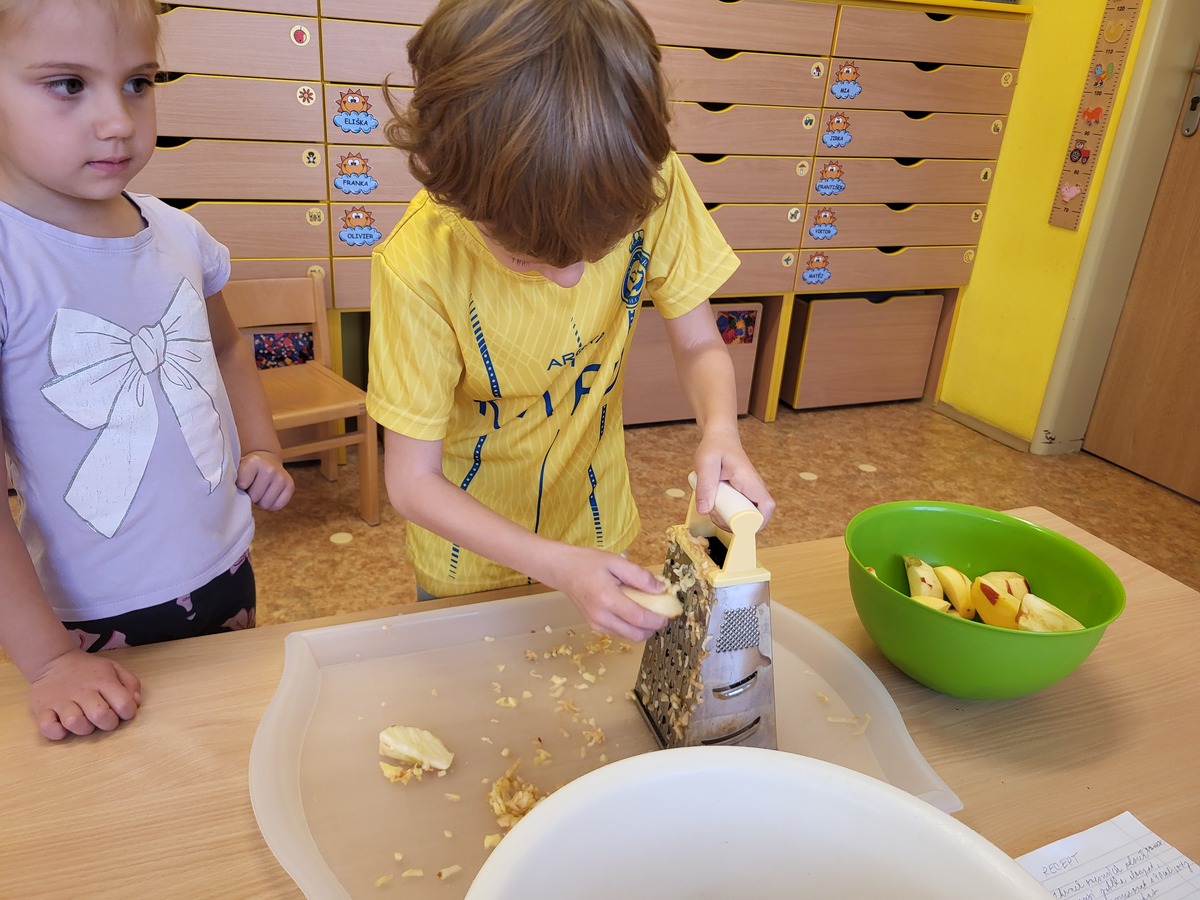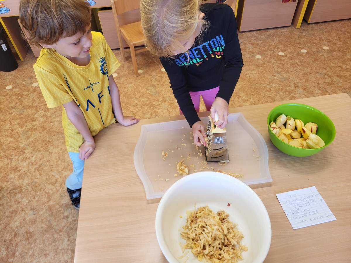 Pozvali jsme rodiče na společné setkání a proto jsme se rozhodli připravit pohoštění - Jablíčkové sušenky. Jablíčka jsme si zkoušeli loupat, krájet a strouhat. Podle receptu jsme přiv´dávali další ingredience a potom už jsme se jen těšili, až se sušenky upečou a budeme je moci ochutnat.