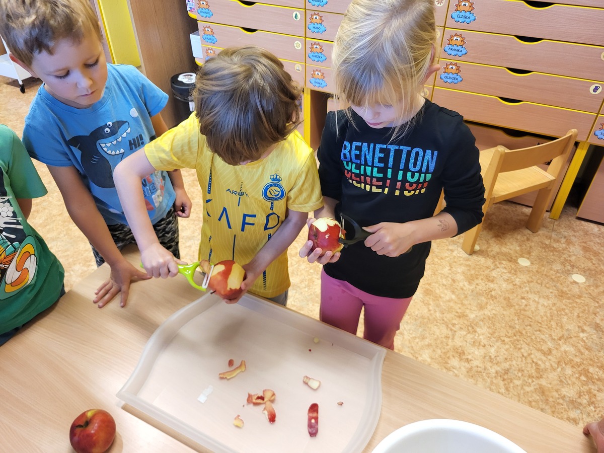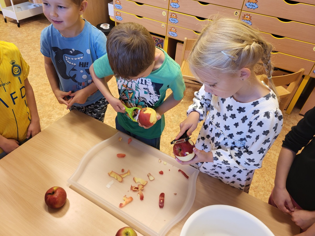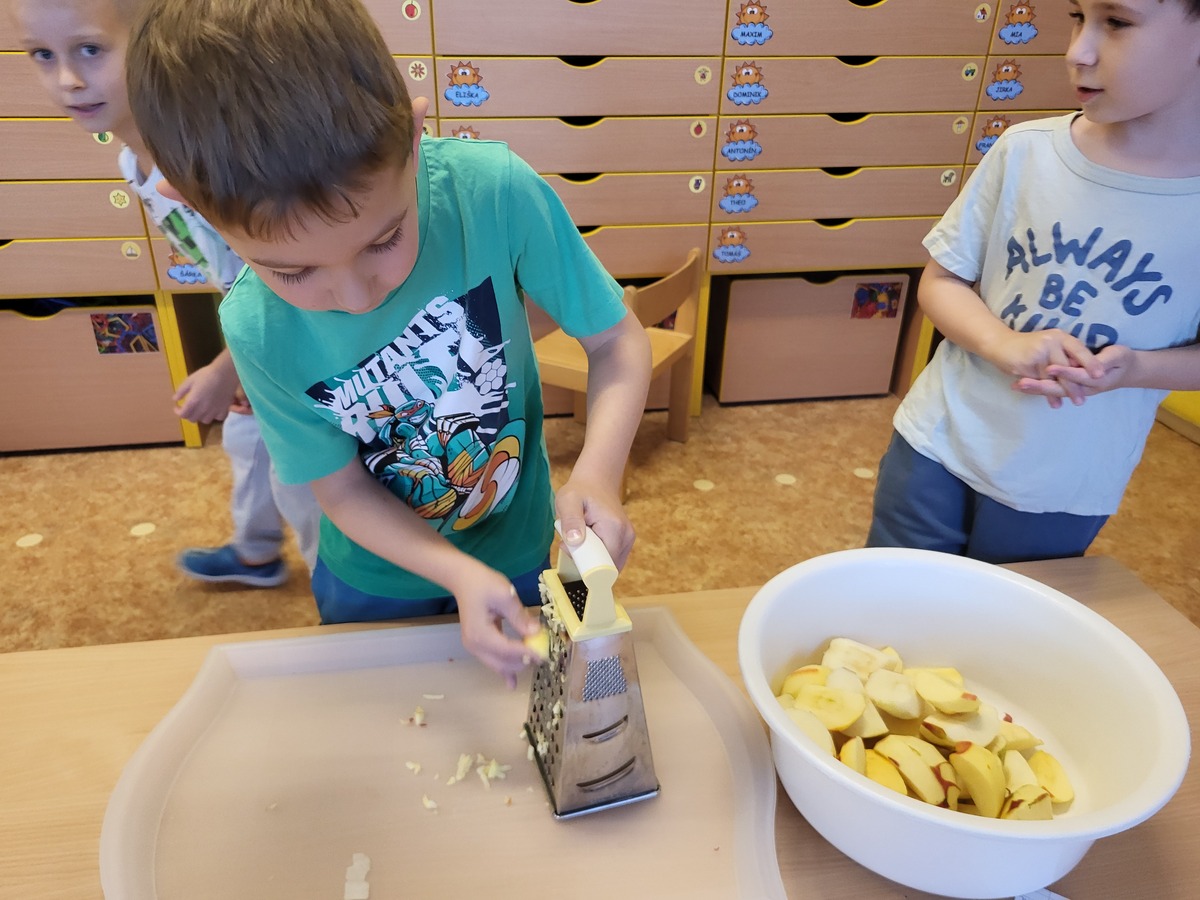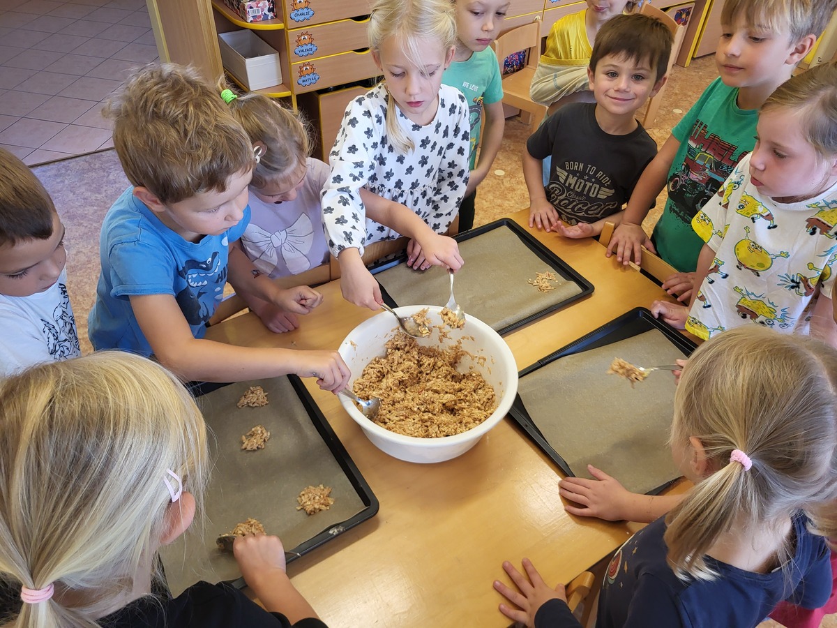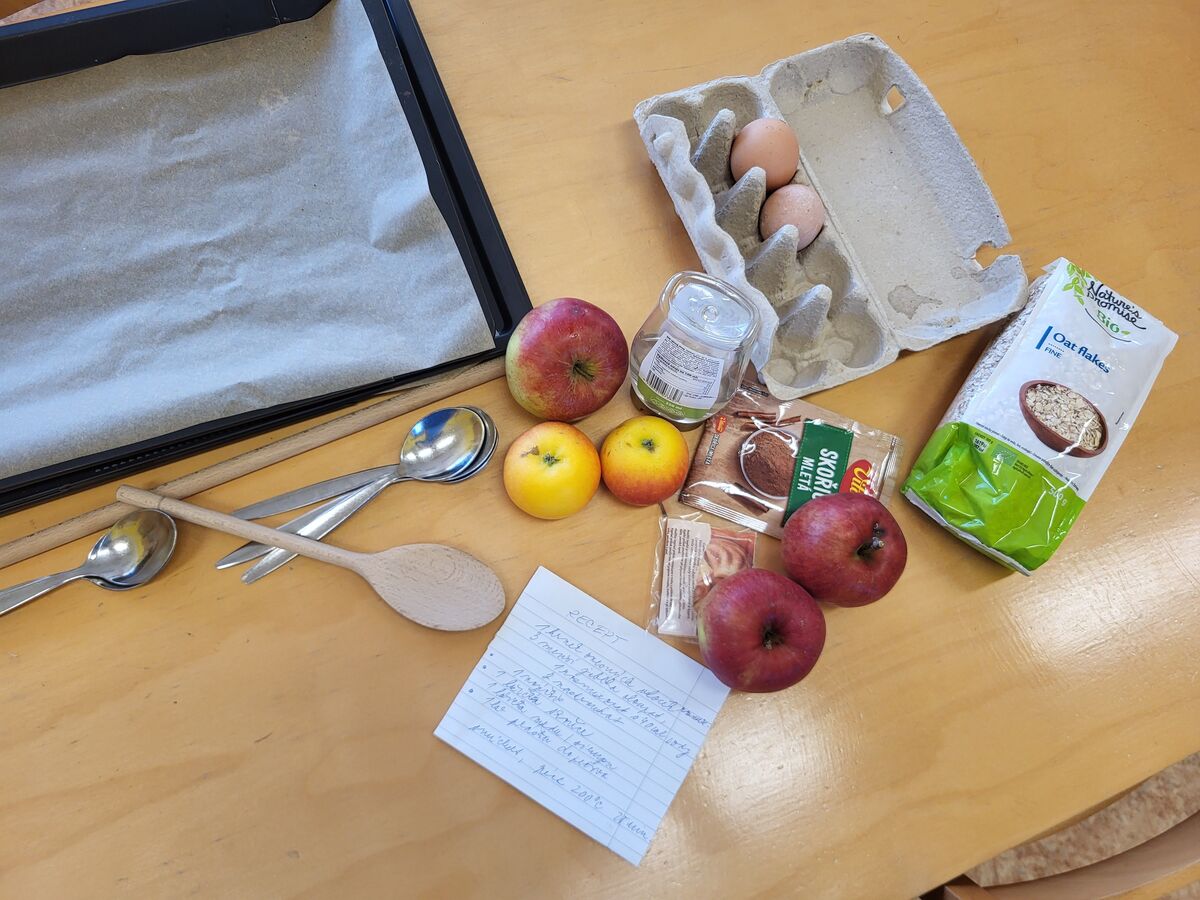 Pozvali jsme rodiče na společné setkání a proto jsme se rozhodli připravit pohoštění - Jablíčkové sušenky. Jablíčka jsme si zkoušeli loupat, krájet a strouhat. Podle receptu jsme přiv´dávali další ingredience a potom už jsme se jen těšili, až se sušenky upečou a budeme je moci ochutnat.