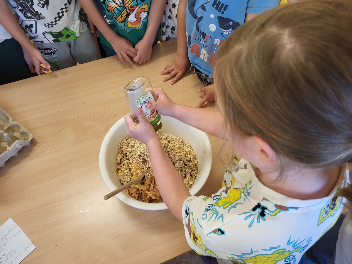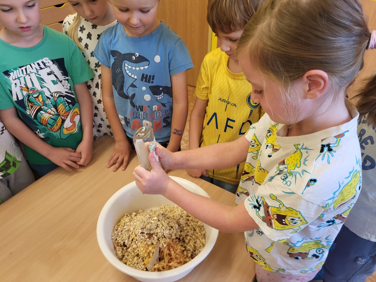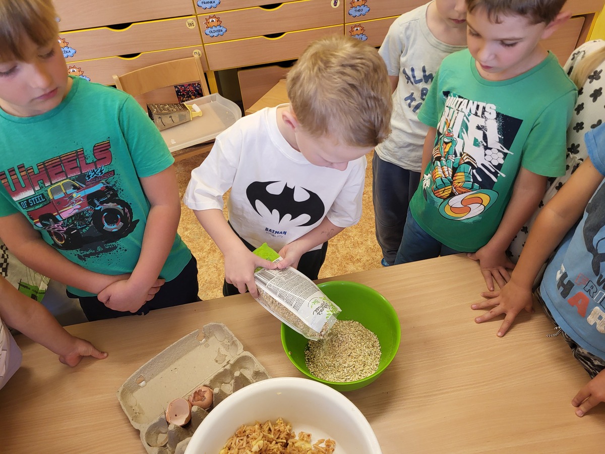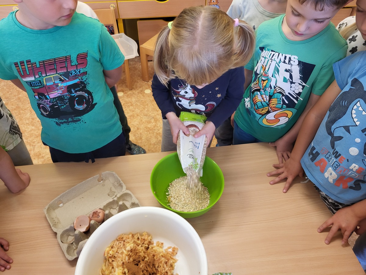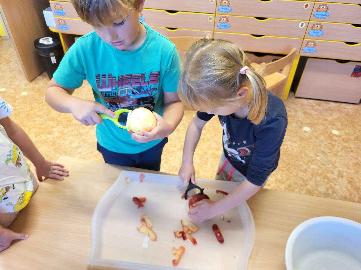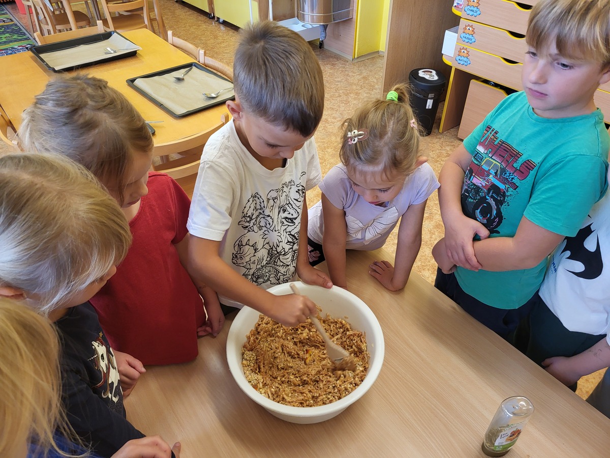 Pozvali jsme rodiče na společné setkání a proto jsme se rozhodli připravit pohoštění - Jablíčkové sušenky. Jablíčka jsme si zkoušeli loupat, krájet a strouhat. Podle receptu jsme přiv´dávali další ingredience a potom už jsme se jen těšili, až se sušenky upečou a budeme je moci ochutnat.
