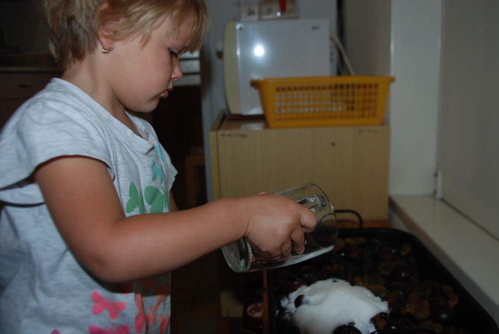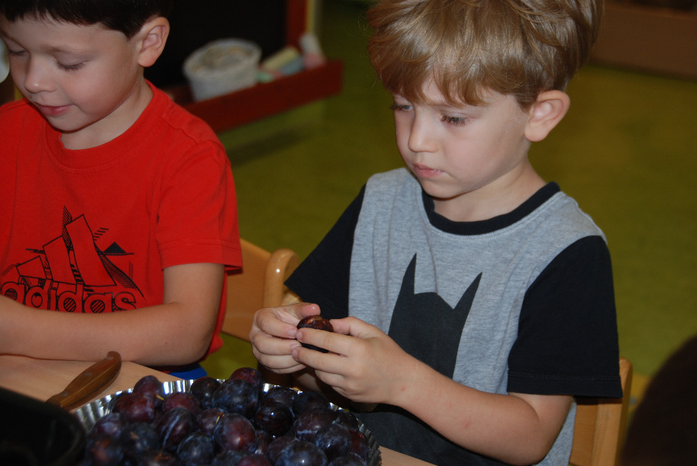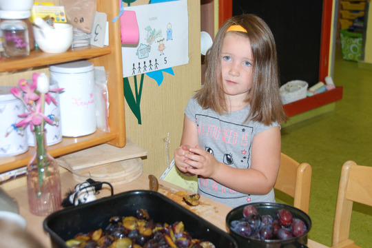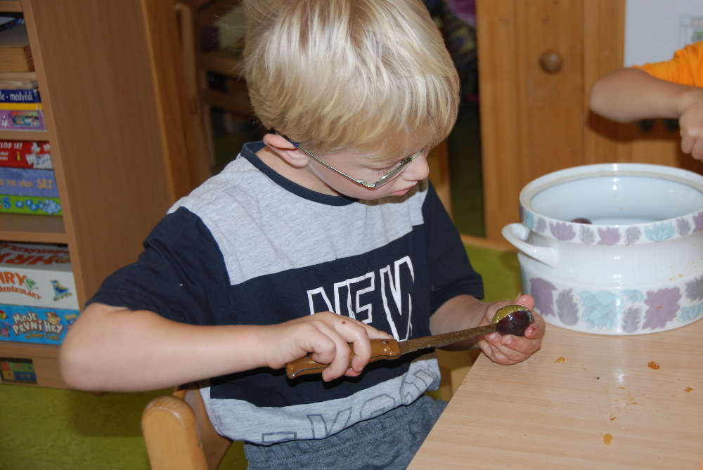 A je tady podzim, i když na podzimní rovnodennost si ještě chvíli musíme počkat. Nicméně, čas podzimních plodů se naplnil a začíná sběr jablek, hrušek a švestek. Ty v naší aleji dozrávají právě teď. A tak jsme na ně vyrazili, otrhaly ze stromu, posbírali ze země, umyli, zbacili pecek a upekli. Třída kuřátek na povidla (a že těch skleniček bylo), třída Koťátek zase sušila švestky v sušičce. No a již je chystáme na naše farmářské trhy, které budou 27.9. o svatováclavské pouti.