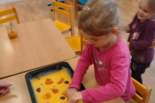 Minulý týden se Hvězdičky učily o ovoci,pojmenovávaly, ochutnávaly marmeládu, kompot,mošt i přesnídávku.Také děti napadlo ,že by si daly sladkou odměnu .Upekli jsme ovocnou bublaninu. Mňam ta byla dobrá .
