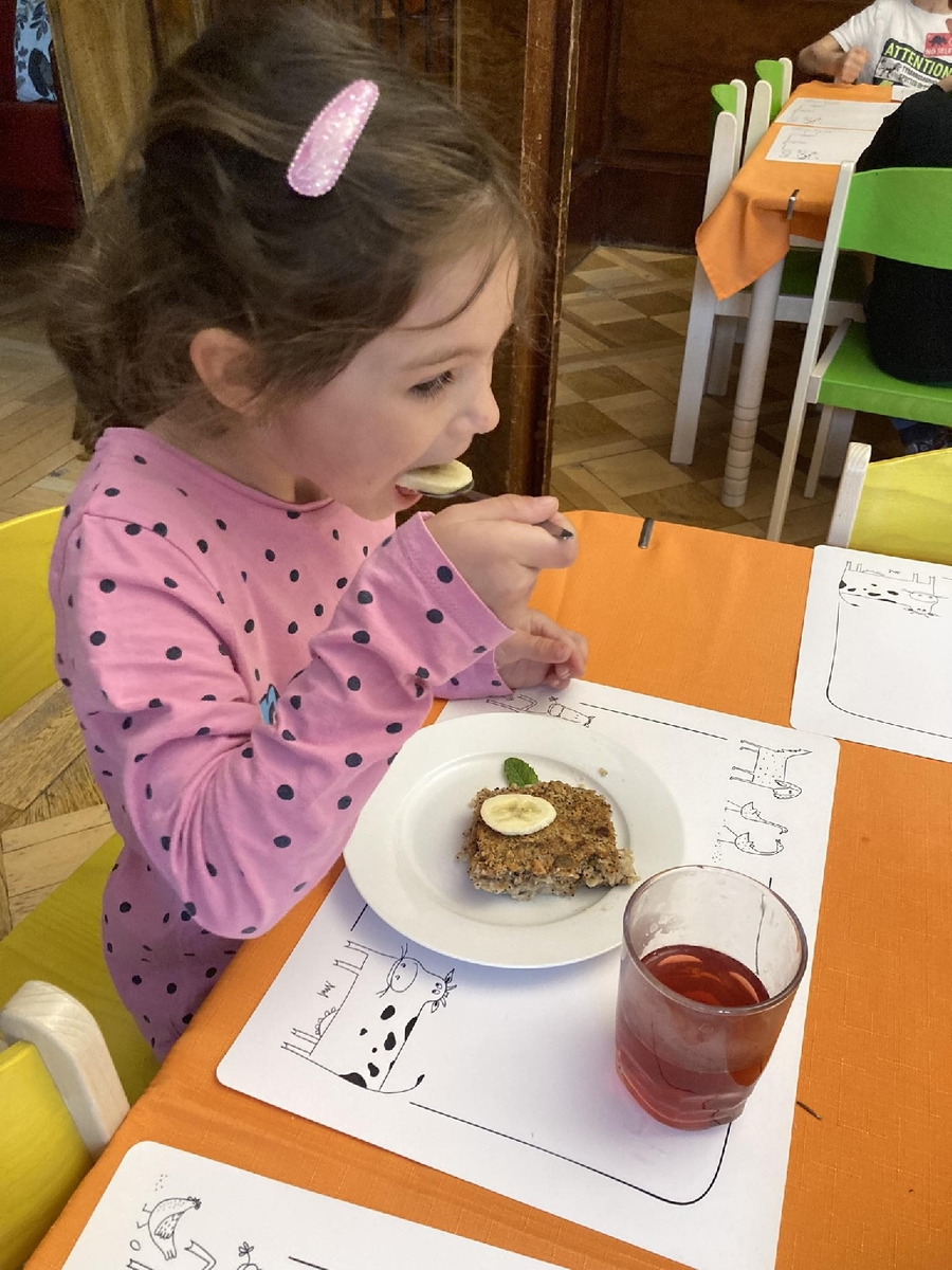 Naše paní kuchařka si dnes pro nás připravila netradiční kaši - zapečená kaše s ovocem, mákem a ořechy. S dětmi jsem vyzkoušeli naše mlsné jazýčky a hledali jsme jaké různé druhy ořechů najdeme v kaši. Byly tam pistacie, plátky mandlí a dětem to moc chutnalo !