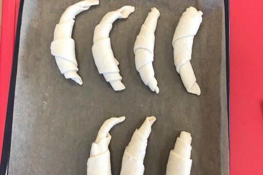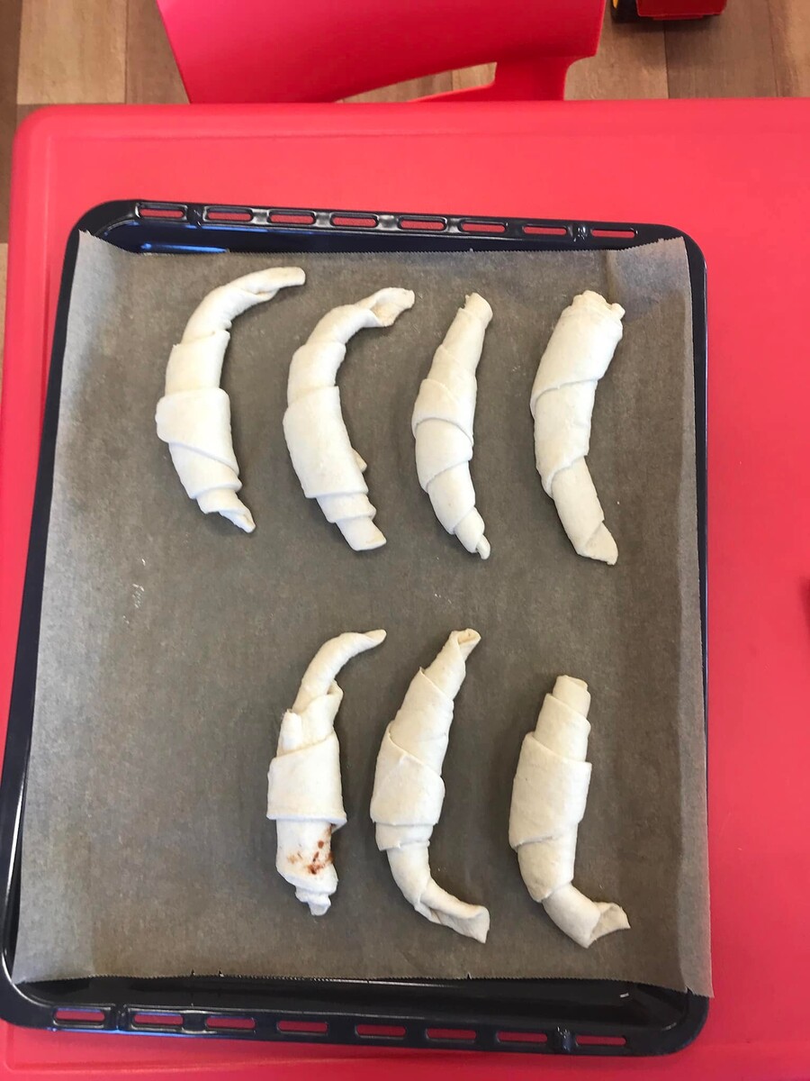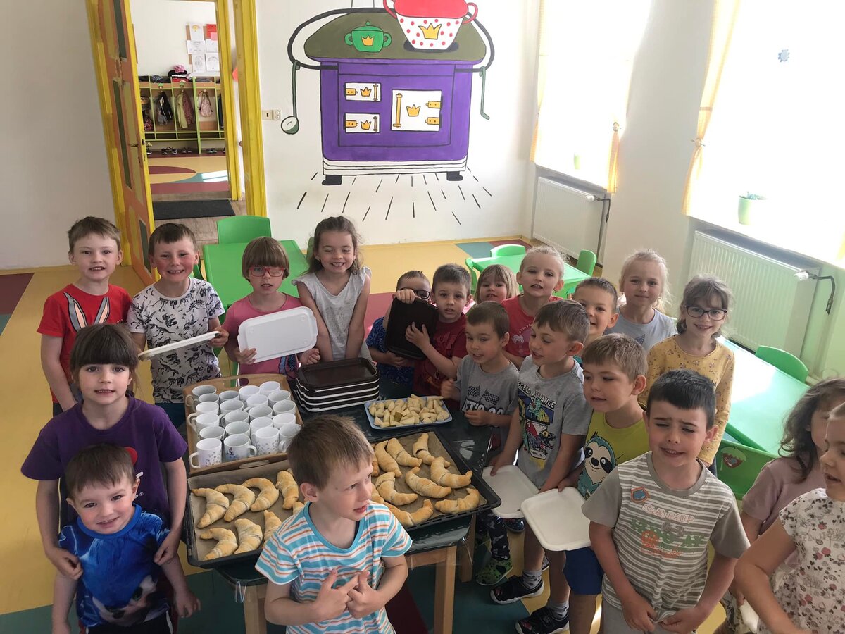 V týdenním tématu poznáváme Evropu, jsme se zastavili i ve Francii a upekli si croissant. Děti si rozválely těsto, následně vykrájely trojúhelníčky, které potřely marmeládou a zabalily. Paní kuchařka nám pak croissanty upekla a dala na svačinku. To byla mňamka!