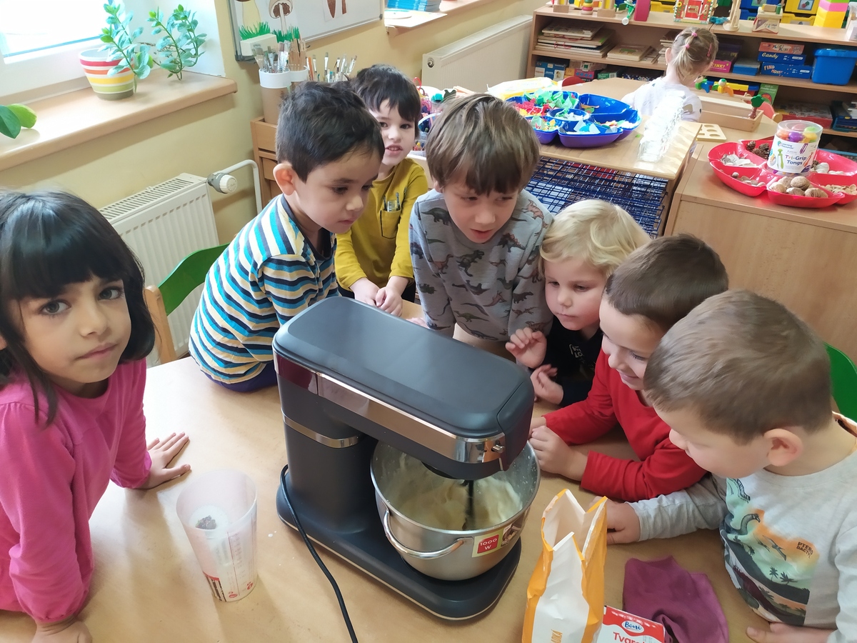 Včera dopoledne děti pekly čokoládové muffiny z tvarohového těsta a ovesné sušenky. Jedna skupinka měla těsto na sušenky připravené od paní kuchařky a děti tvarovaly sušenky na plech. V druhé skupině děti odměřovaly ingredience, pozorovaly míchání těsta a plnily košíčky na muffinky. Práce je moc bavila. Po upečení proběhla ochutnávka, na kterou se děti moc těšily.