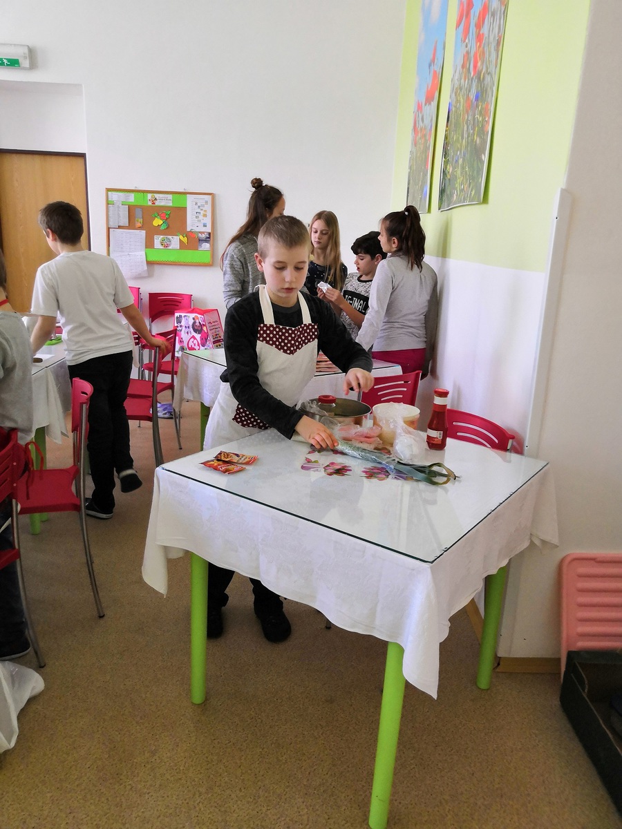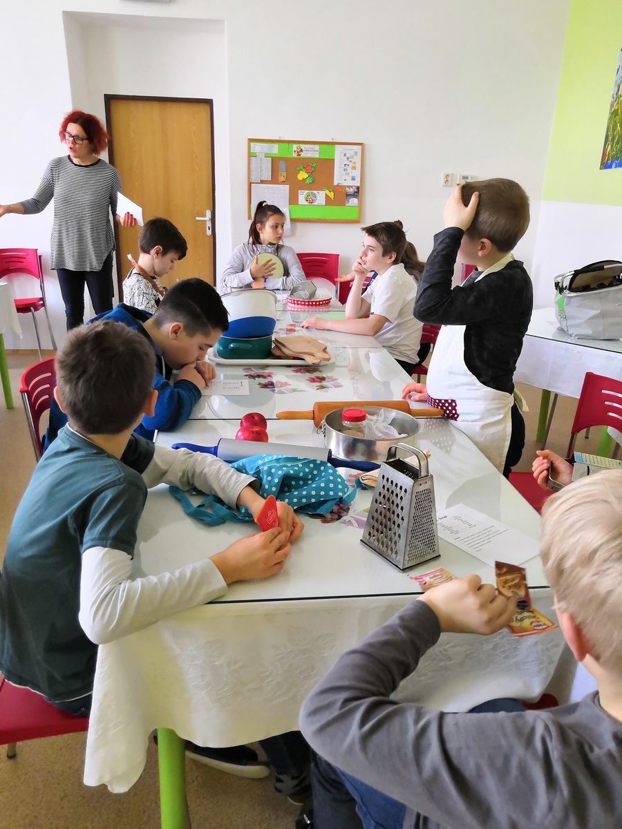 Pátý a čtvrtý ročník naší školy pekl výborný štrůdl s jablky a jahodami a šneky se šunkou a sýrem.