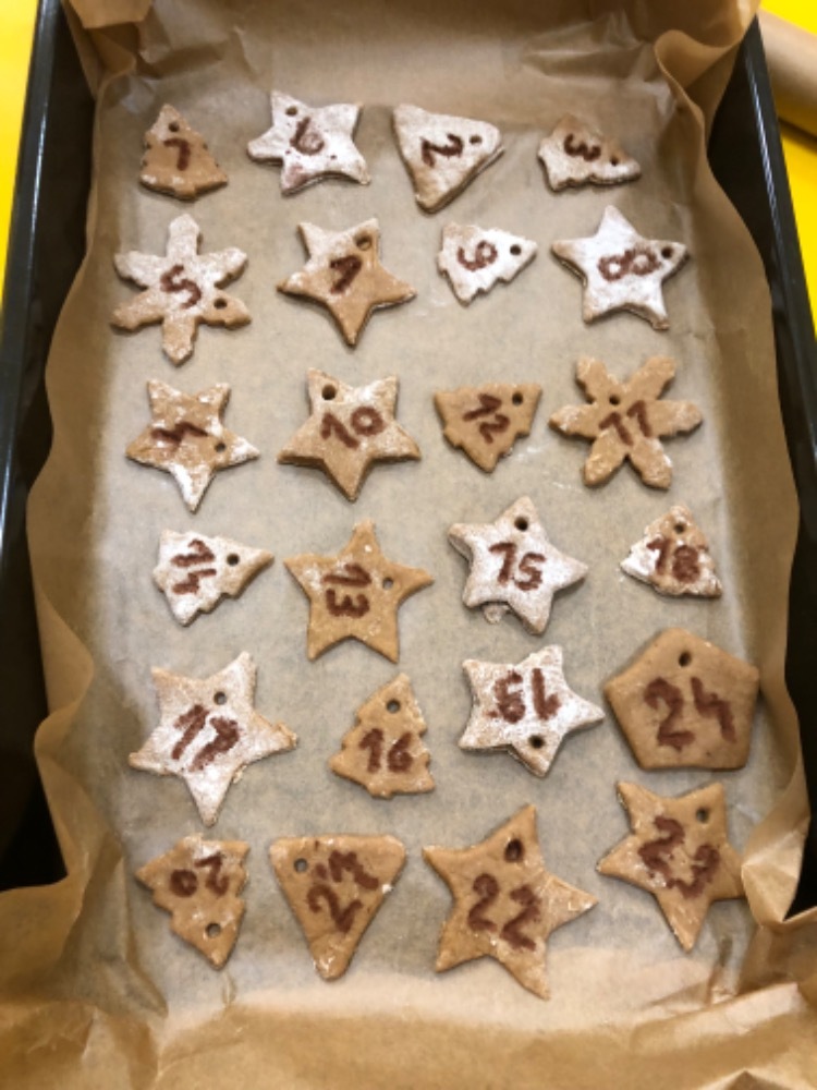 Inspirací k upečení adventního perníčkového kalendáře nám byl adventní kalendář, který jsme si objednali od Skutečně zdravé školy. S dětmi jsme společně navážili ingredience a pak přišla ta nejoblíbenější část - hnětení těsta. Po vyválení si každý vykrojil několik kousků perníčků a paní učitelka na perníčky vyryla čísla a vysypala kakaem. A pak už jsme si jen užívali vůni linoucí se ze školní kuchyně. Po vychladnutí jsme seřadili perníčky podle čísel a zavěsili je na ozdobný podklad.