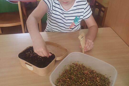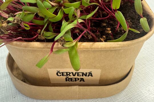 V březnu jsme si s dětmi zkusili vypěstovat microgreens – čočku a červenou řepu. Ukázali jsme si, jak připravit hlínu, nasypat semínka a povídali si o tom, co by tak k růstu mohli ještě potřebovat – vodu a sluníčko. Děti pravidelně zalévaly a kontrolovaly, jak se semínkům daří, vypěstované výhonky ostříhaly a s chutí si s nimi posypaly chléb s máslem nebo lučinou.