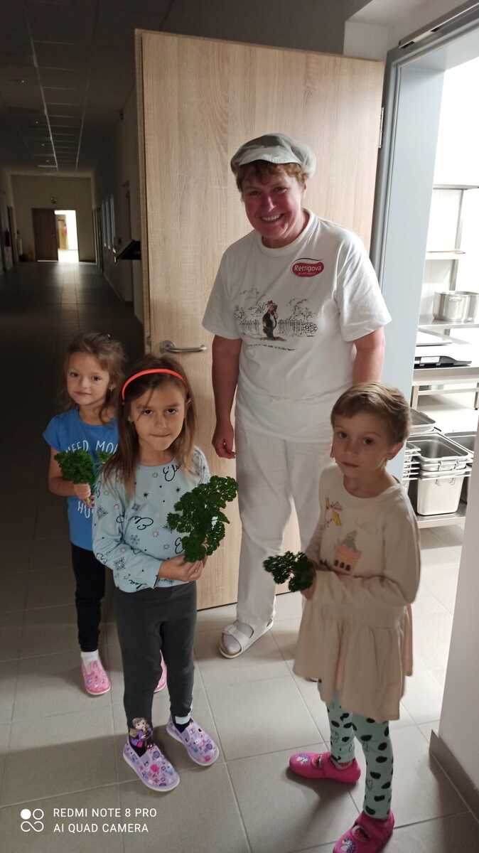 z minizahrádky jsme sklidili petrželku, kterou jsme předali paní kuchařce a ta nám ji dala do polévky a na brambory.