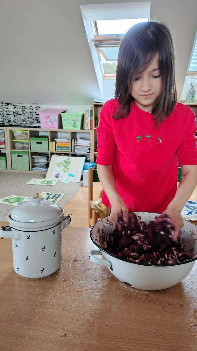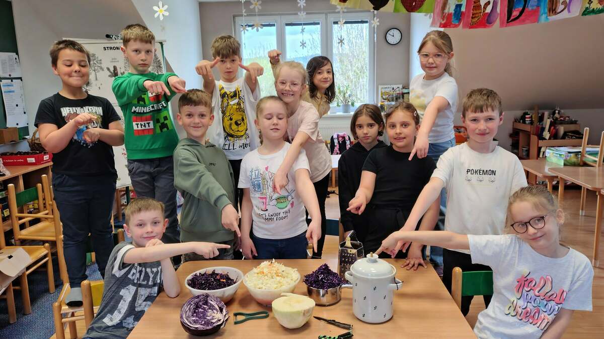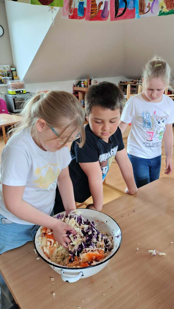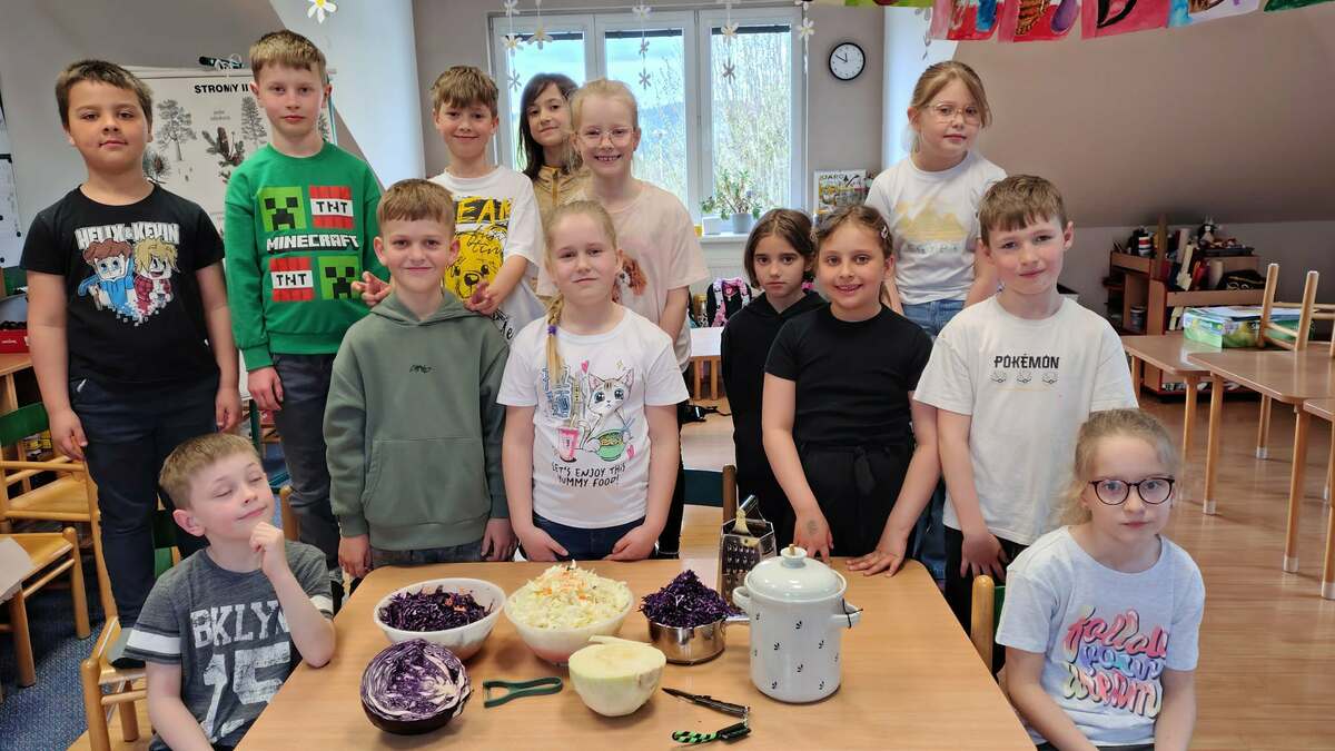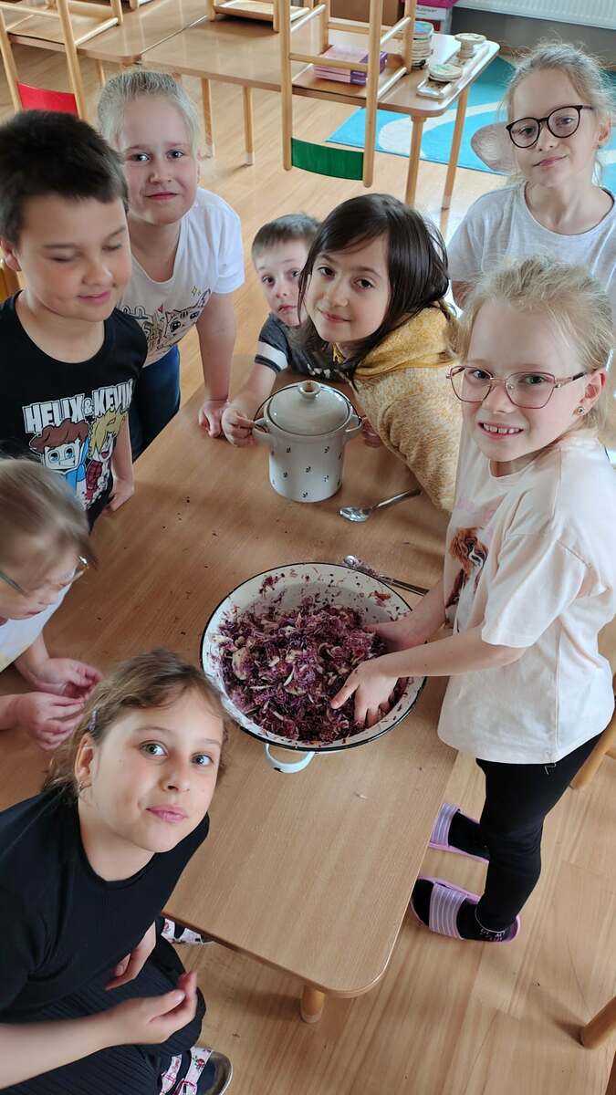 Salátový bar vnímáme jako „učebnu pod širým nebem“ Toto přirovnání se nám velice líbí. Proto se naši žáci se svými učiteli zapojili do projektu a každá třída si pro své tvoření vybrala jeden měsíc. 1a2 třída si pro svoji prezentaci vybrala duben, kdy je ještě výběz zeleniny trochu omezen. Pickles je proto dobrou volbou. Kvašená zelenina je zdroj přírodních probiotik, který můžeme mít doma po celý rok . Fermentovaná zelenina, nebo pickles, by měla být běžnou součástí našeho jídelníčku především v zimě, poskytuje totiž většinově nedostatkový vitamín C. Navíc se hodí jako příloha či doplněk prakticky k jakémukoliv jídlu. Nejmladší žáci se svého úkolu zhostili na výbornou a společně s paní učitelku ostatním odprezentovali svůj vitamínový poklad.