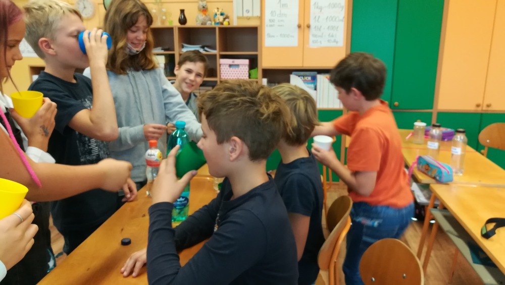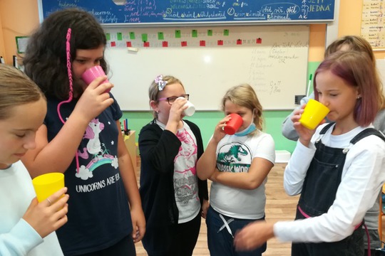 Projekt Pijeme kohoutkovou: každodenní otázky a odpovědi na téma VODA, společná diskuse na toto téma napříč vyučovacími předměty, zkoumání čistoty vody, ochutnávka kohoutkové z různých zdrojů a hodnocení, výtvarný projekt, vzdělávací videa.