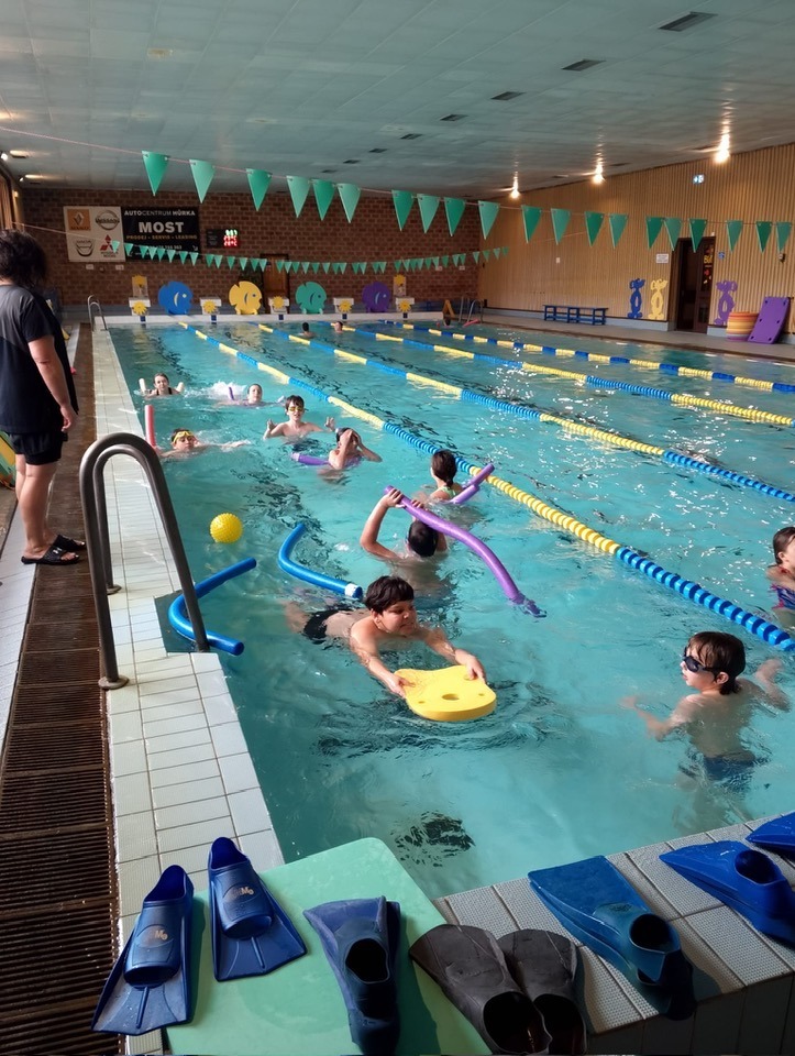 Plavání 4.–5. třídy. Během plaveckého výcviku udělali všichni žáci velký pokrok. Děti se postupně zdokonalovaly v technice i jistotě ve vodě a dnes už všichni zvládají plavat bez pásku.