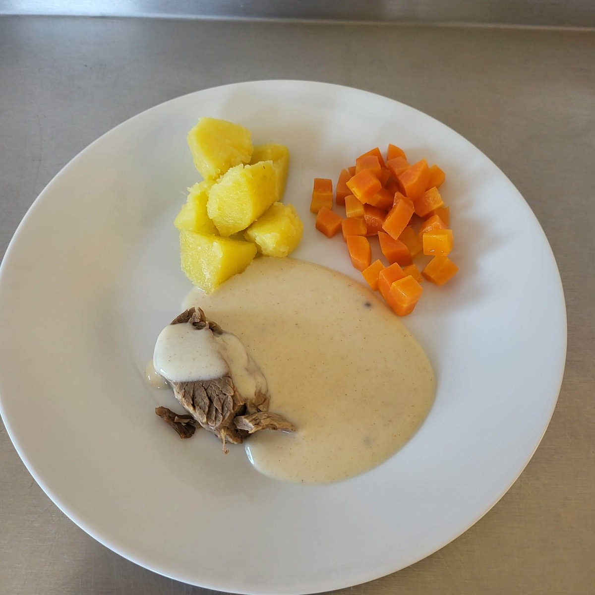 Australské vařené hovězí, dušenou mrkev, jemně hořčičnou omáčkou a vařený brambor