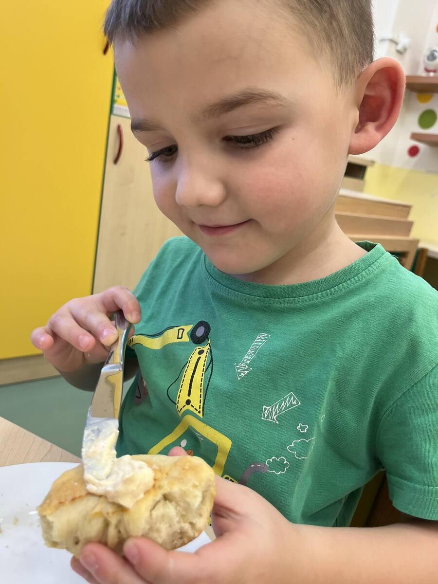 Paní kuchařka nám dnes připravila výborné obzvlášť vypečené rohlíčky deluxe. Samozřejmě nechyběla ani pomazánka tvarohovo- mrkvová, kdy tvaroh je od našeho dodavatele rodinná farma Děčany a mrkev má původ dokonce ve Veltěžích. Podporujeme naše Smíšky v oblasti samostatnosti a sebeobslužnosti. Každé dítě má možnost namazat si dle své chutě.