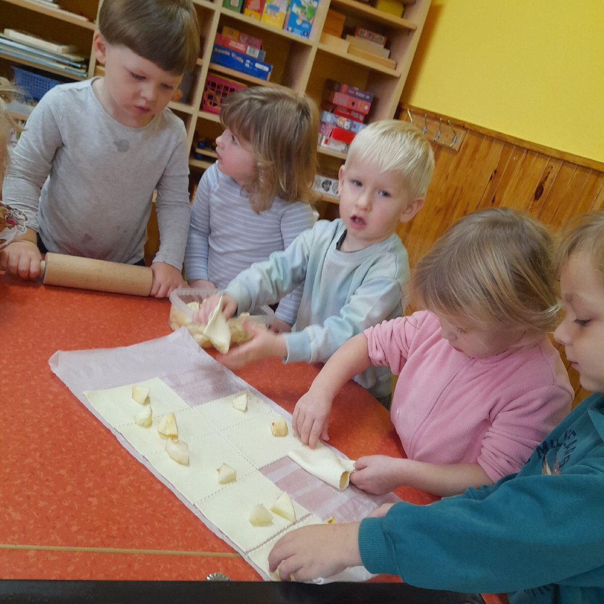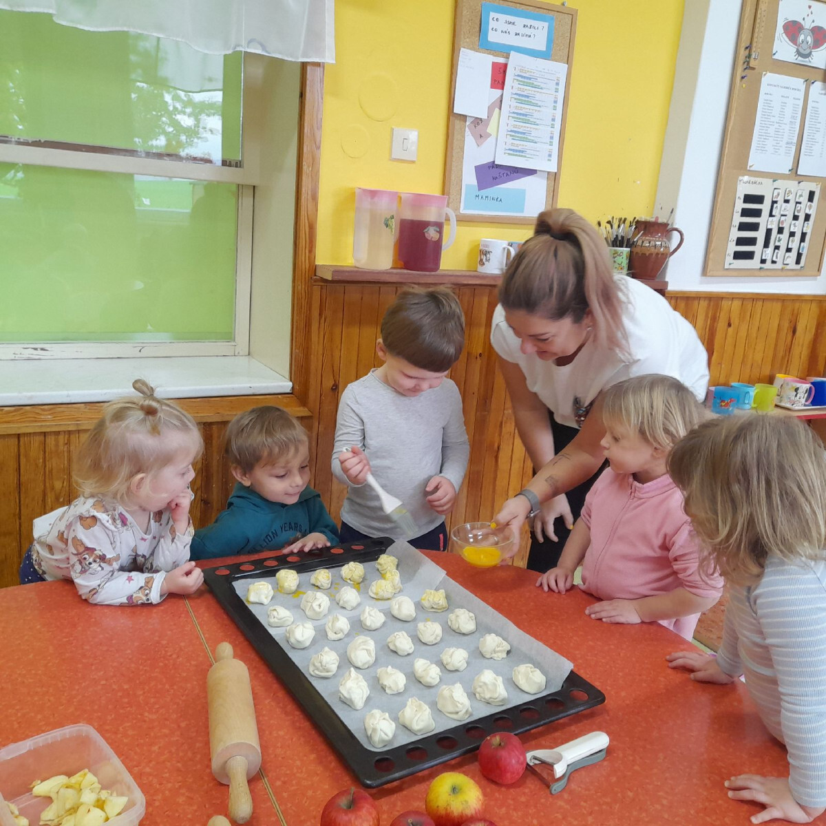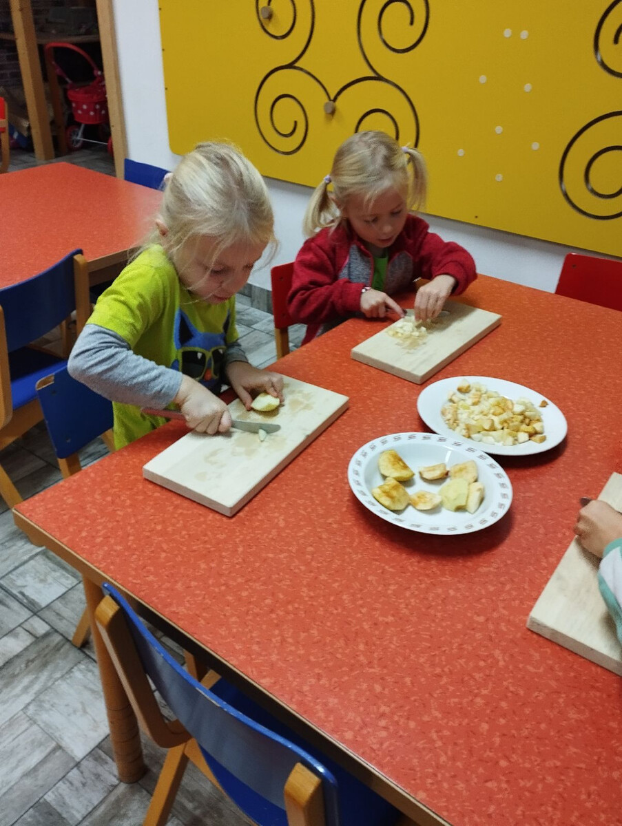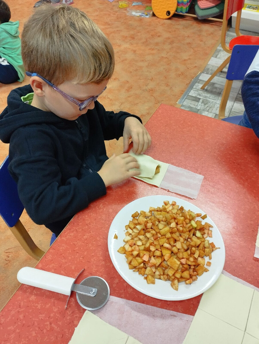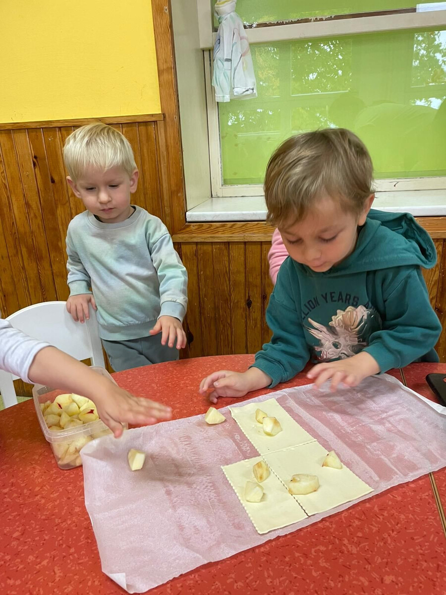 V mateřské škole ve Chlenech se podzim nesl ve znamení jablek a voňavého pečení. Třída nejmenších Berušek i předškoláci ze třídy Včeličkek se pustili do přípravy koláčků z listového těsta plněných jablky a zdobených semínky.