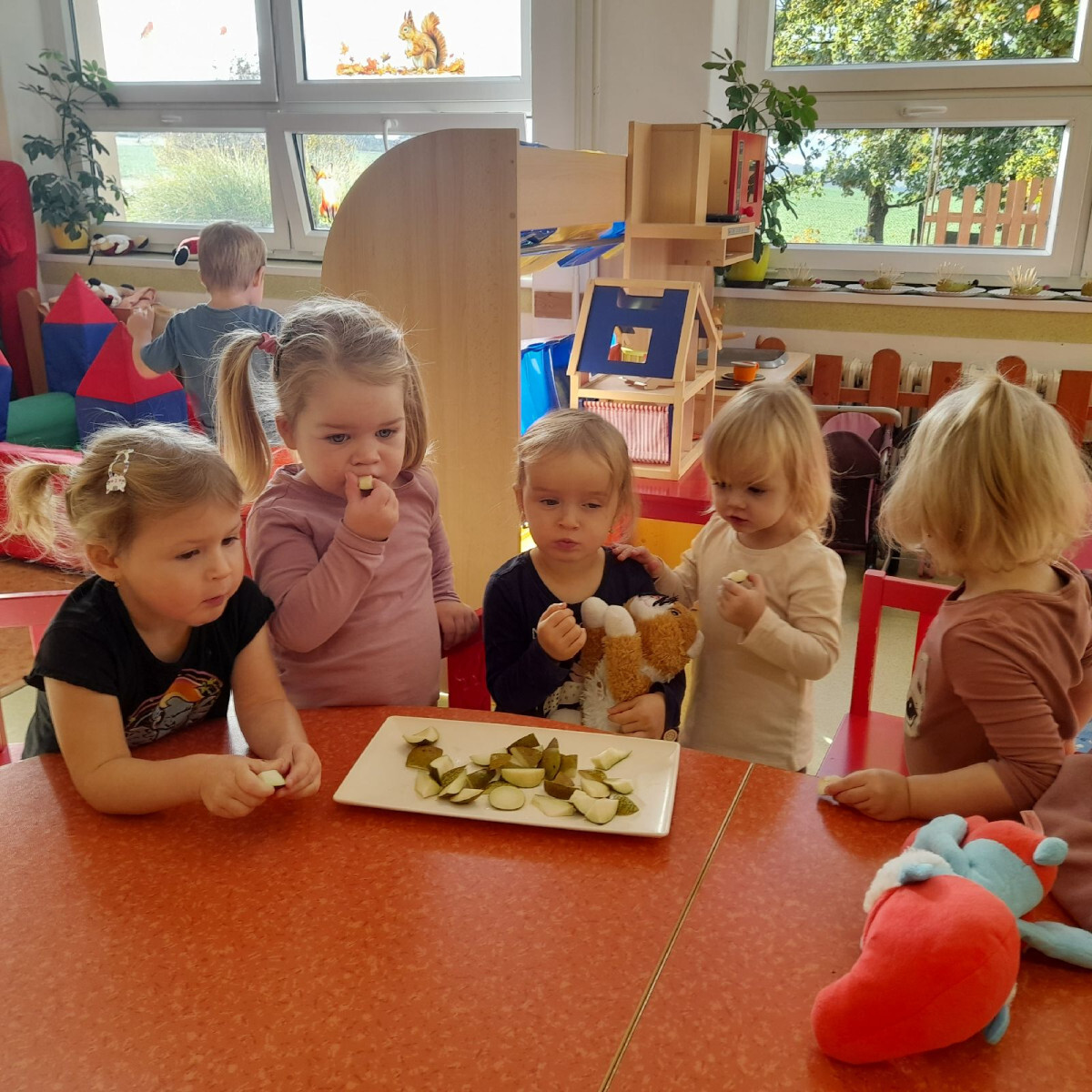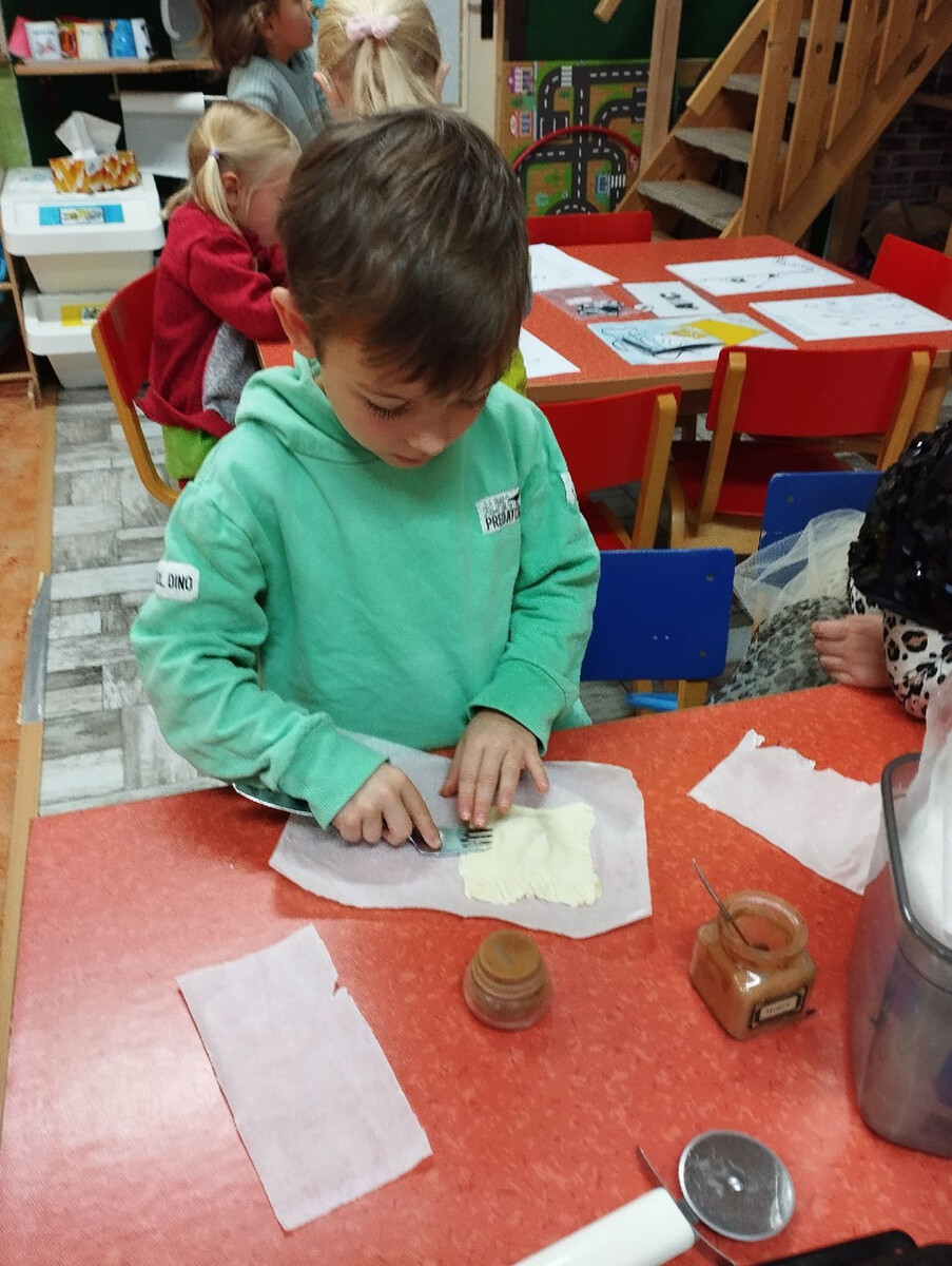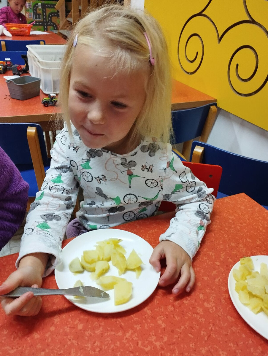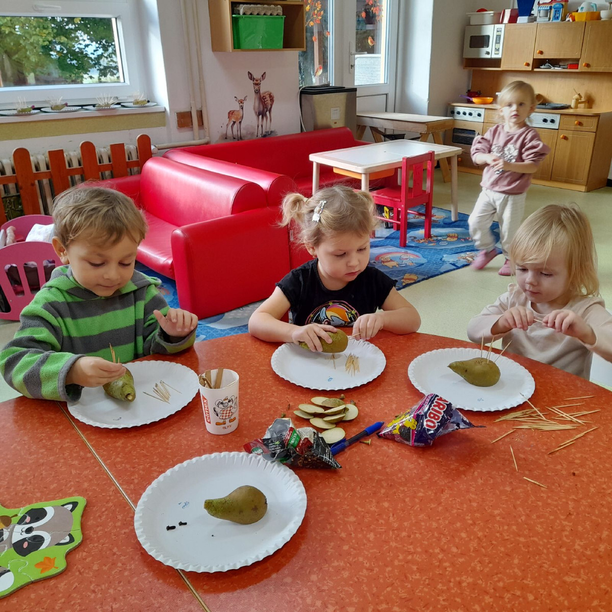 Podzimní téma ale nekončilo jen u pečení. Děti měly možnost ochutnat různé způsoby zpracování jablek – křížaly, čerstvý mošt, přesnídávku i ovocné sušené želé ve tvaru hada. Díky těmto aktivitám si nejen pochutnaly, ale také poznaly, kolik podob může mít obyčejné jablko a kolik práce se za jeho zpracováním skrývá.
