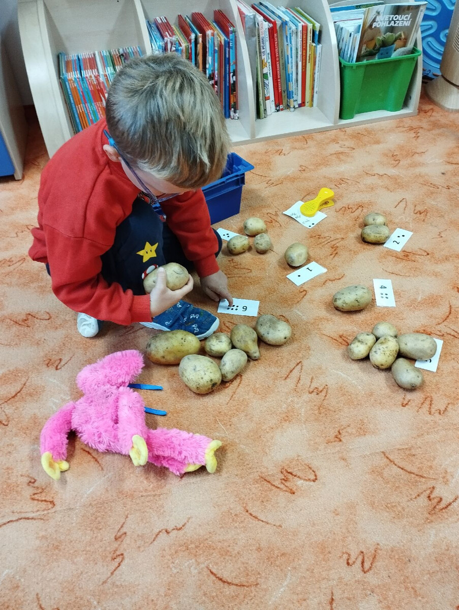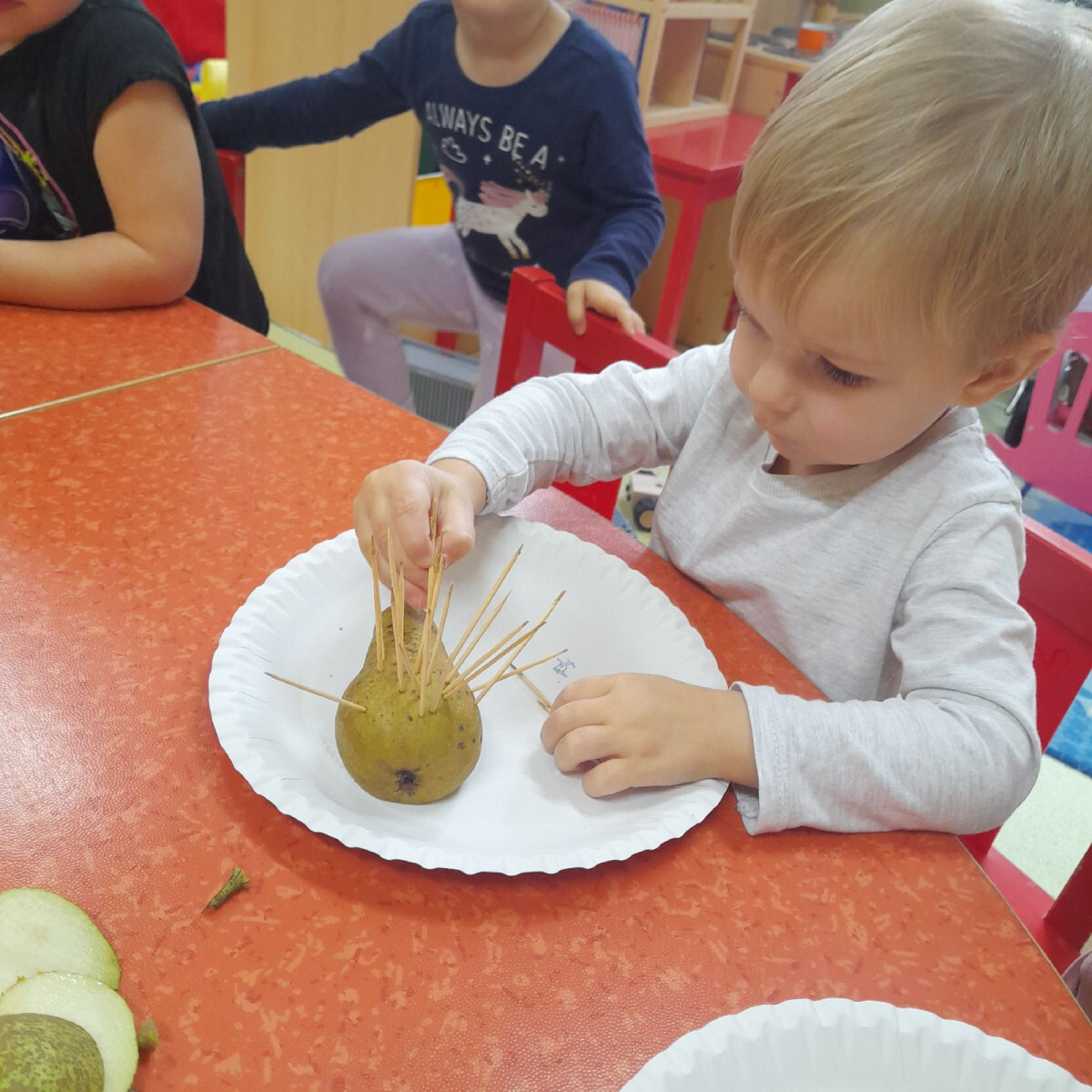 Aktivita třídy Berušek navíc pokračovala tvořením – děti vyráběly ježka z hrušky, kterého dozdobily podle vlastní fantazie. I tato činnost podpořila jejich jemnou motoriku, kreativitu a radost z podzimních plodů.