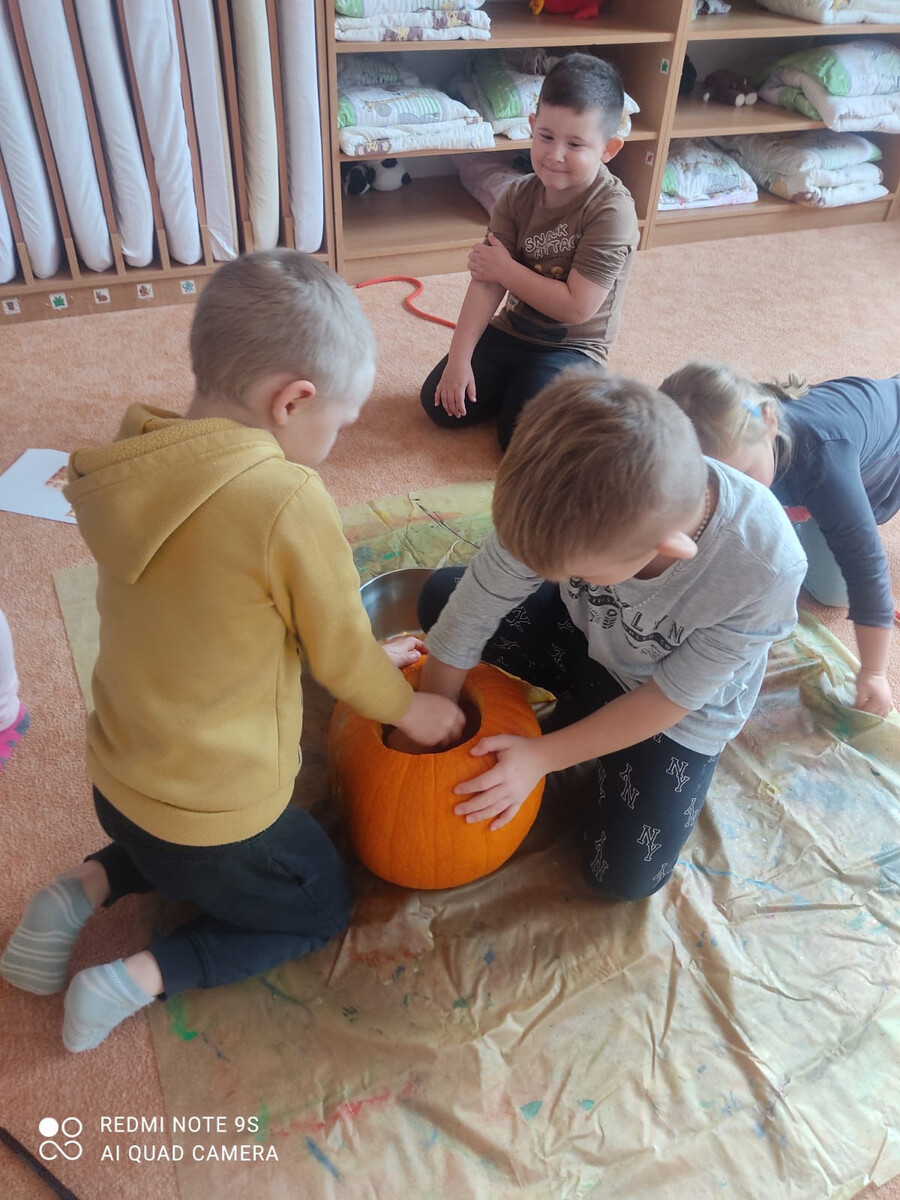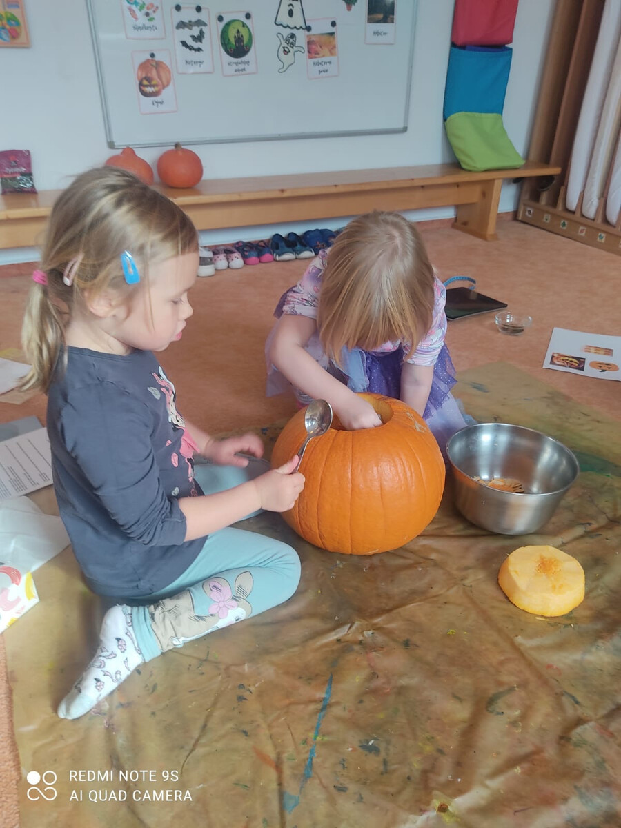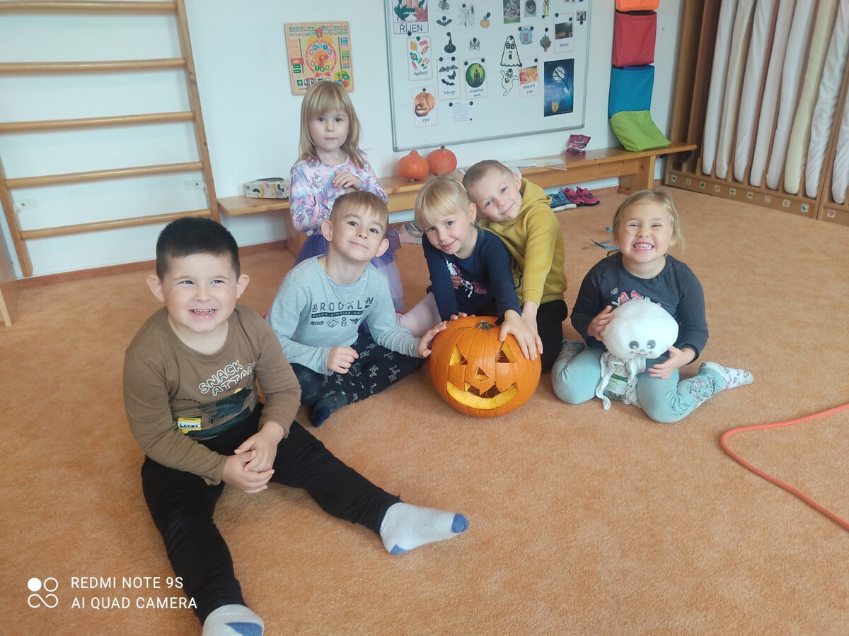V říjnu u nás proběhlo tradiční dýňování. Děti společně vydlabaly dýni, vyrobily veselý podzimní svícen a krásně jím ozdobily vchod do školky. Povídali jsme si také o tom, jak dýně roste, k čemu ji můžeme využít v kuchyni i proč je zdravá. Některé dýně si děti dokonce vypěstovaly na naší školní zahrádce, a tak měly možnost vidět celý proces „od semínka až po dekoraci“. Děti si dýňový den užily a zase o kousek víc porozuměly tomu, odkud jídlo pochází.
