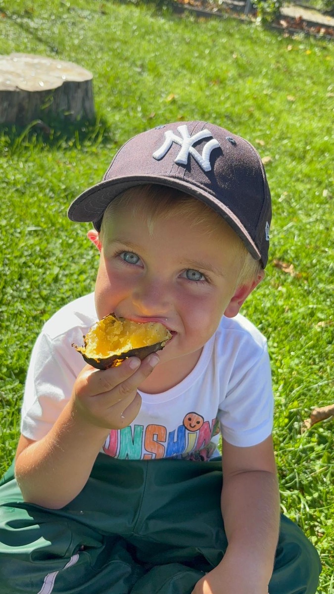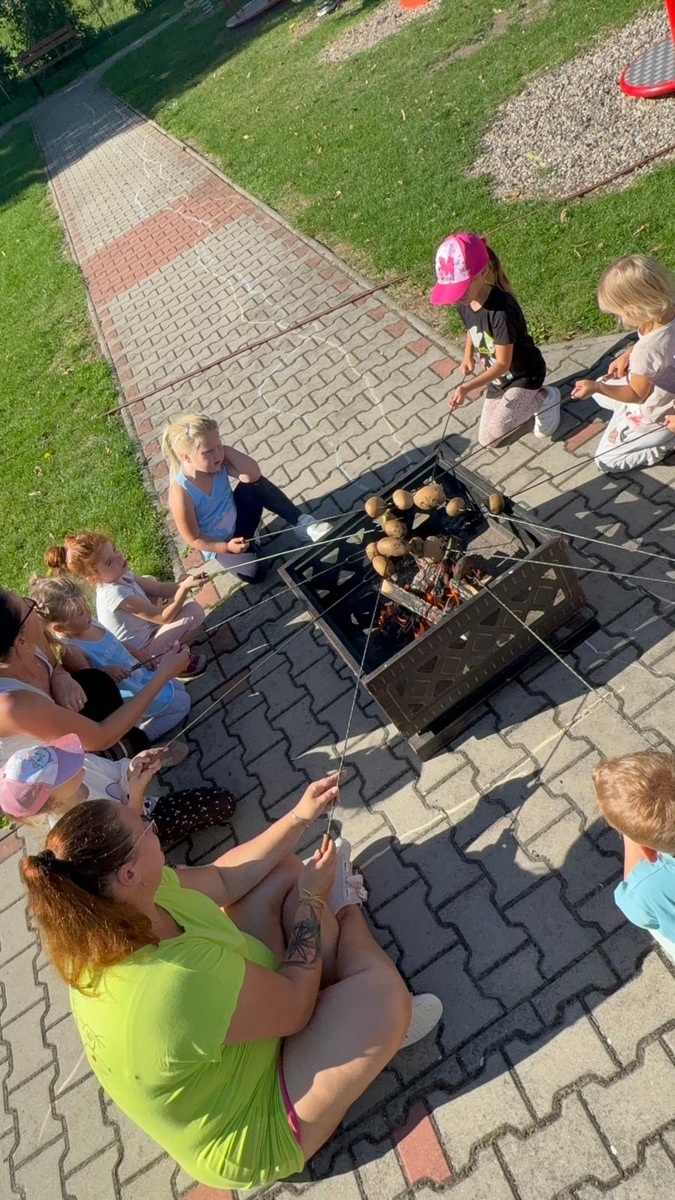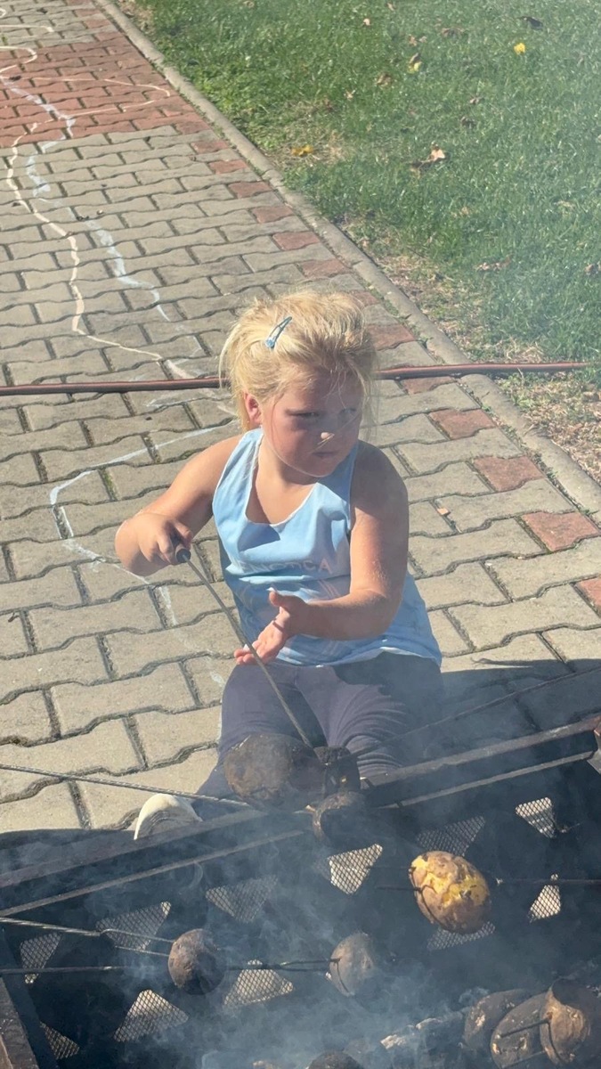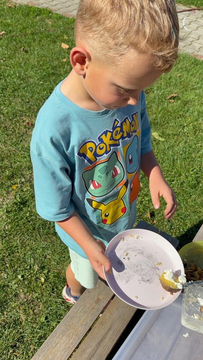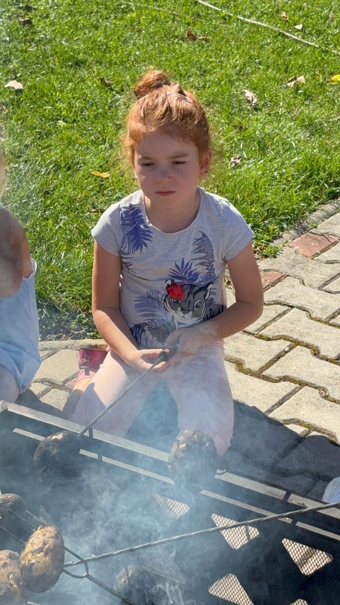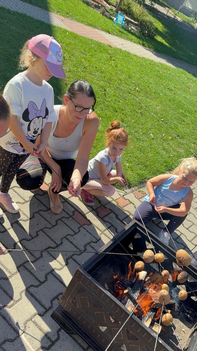 Dnes si děti v rámci tradičního českého podzimního pokrmu opekly lokální - vlastní brambory. Ty nám paní kuchařka obohatila o farmářský tvaroh. Venku nám chutná nejvíce.