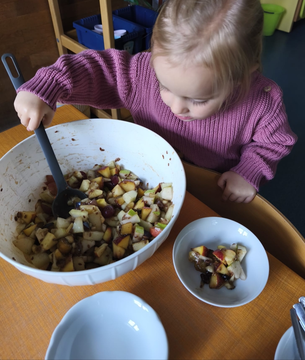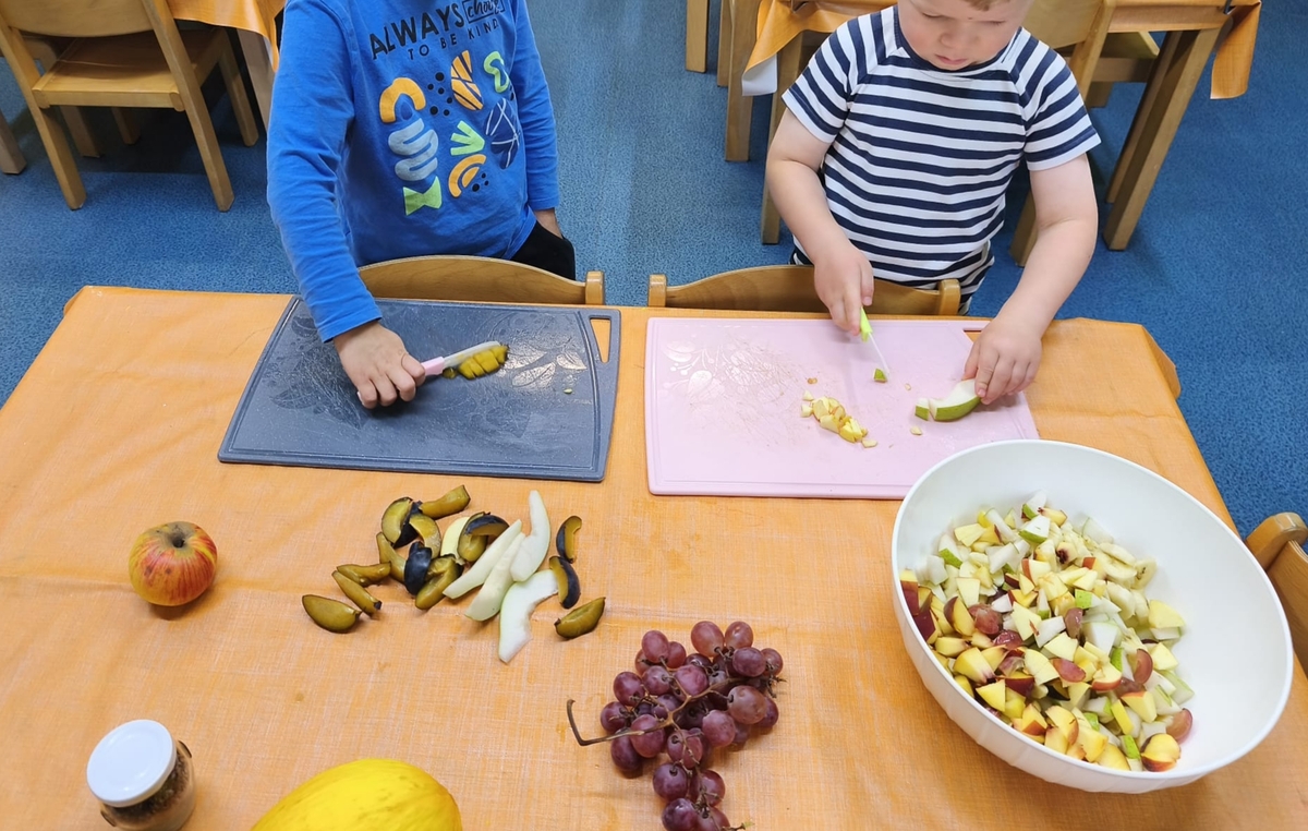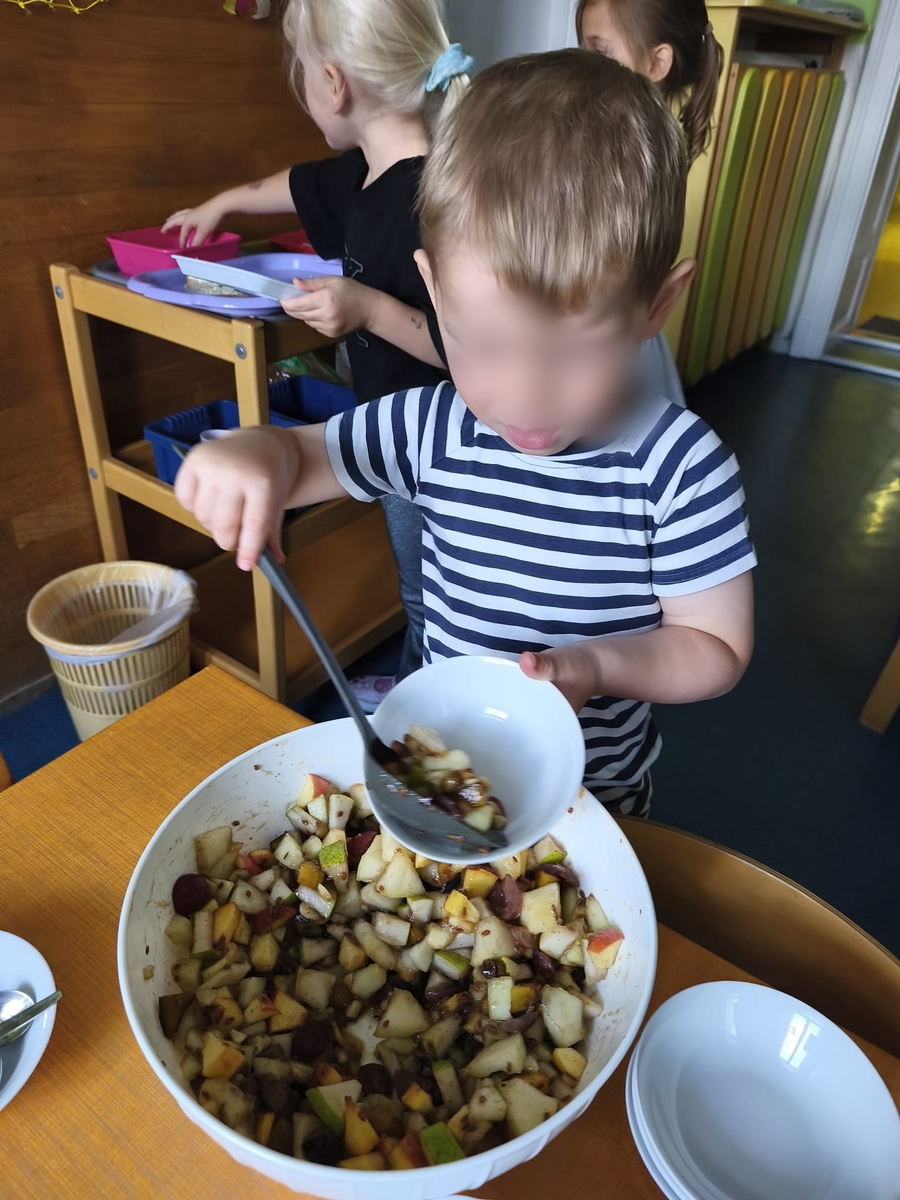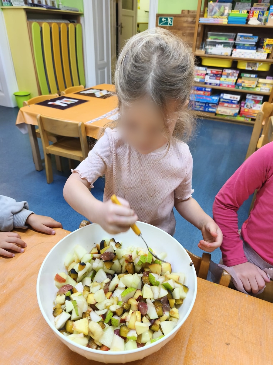 Protože jsme chtěli využít všech darů podzimu, sklidili jsme plody našich zahrádek, jak té školkové, tak těch domácích a z různých druhů ovoce jsme si udělali podzimní ovocný salát. Jablíčka, hrušky a švestky jsme pečlivě omyli a nakrájeli na kousky. Přidali jsme rozinky, různá semínka a posypali skořicí. To byla vůně! ...a taky velká mňamka.