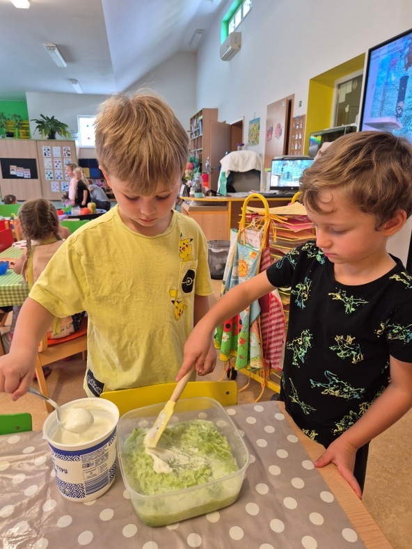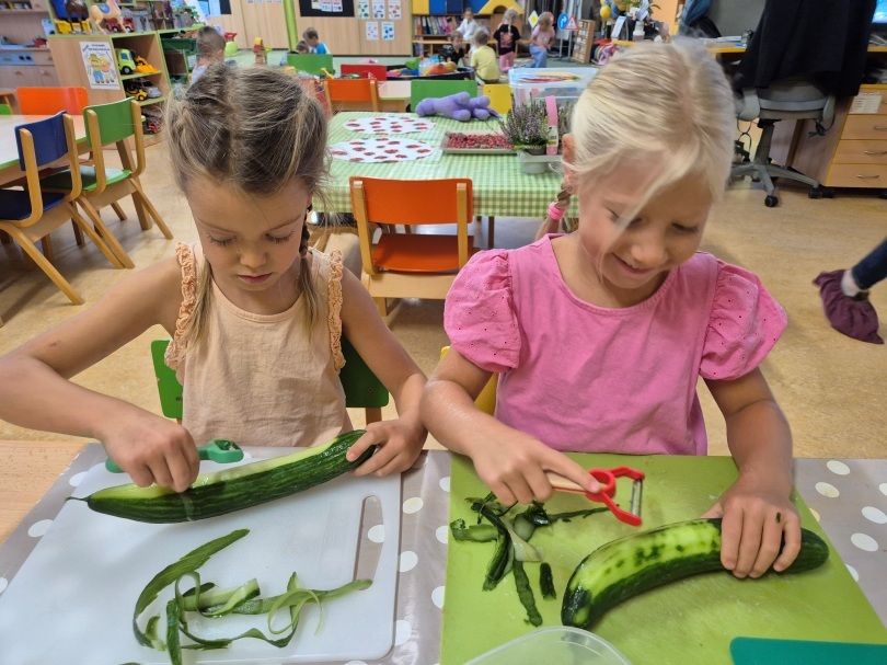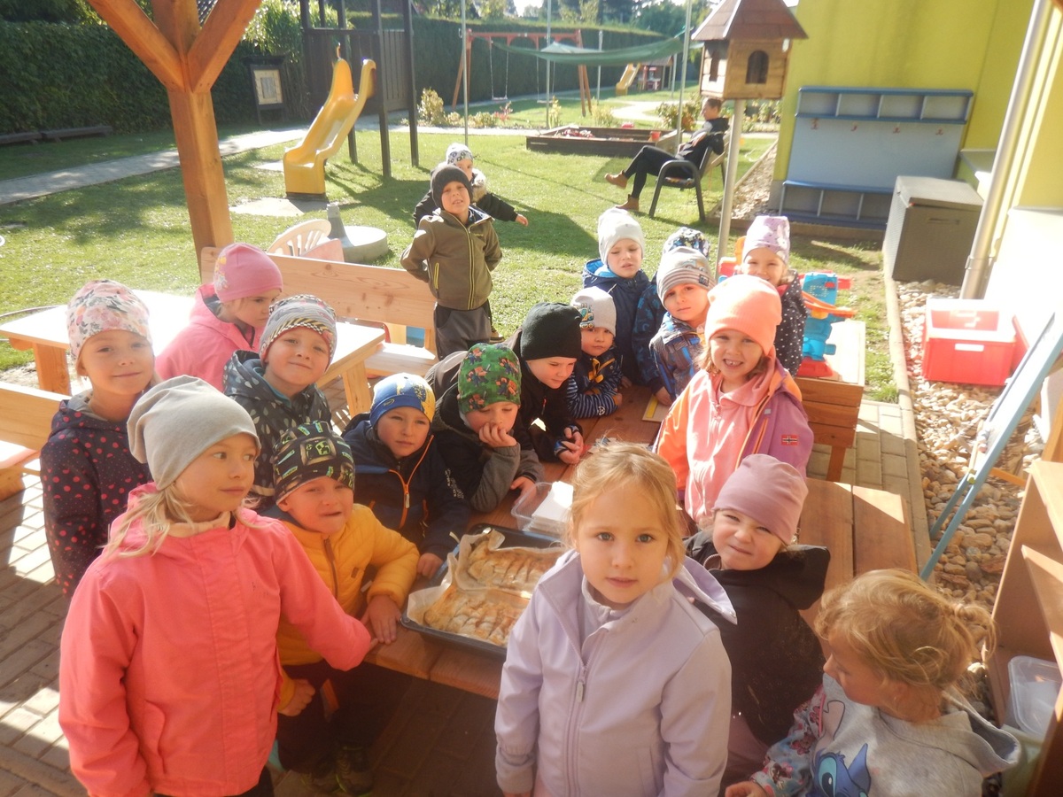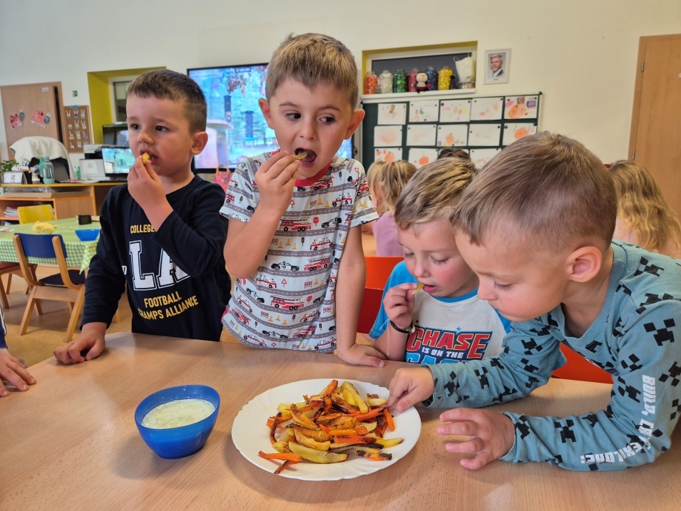 Berušky si v rámci tématu „Plody podzimu“ přinesly do třídy mnoho plodů a využily je k různým aktivitám. Pečení bylo jednou z nich. Nejdříve si vyzkoušely přípravu i pečení jablečného štrůdlu a následně i pečených batát, brambor a mrkví v podobě zdravých hranolek. Jako první se seznámily se zdravými ingrediencemi a za pomoci bezpečných dětských škrabek a nožů připravily vše potřebné. Škrabaly, krájely, ochucovaly a na závěr samozřejmě i ochutnávaly J. Nezapomněly si ani připravit zdravé tzatziki z okurek a bílého jogurtu. To vše za bezpečné asistence paní učitelek.