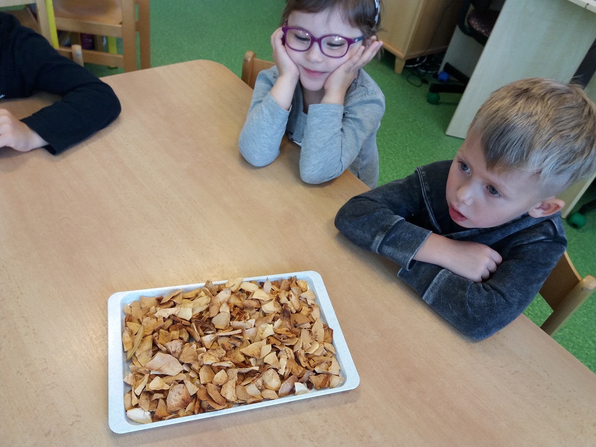V rámci podzimního projektu Ovoce a zelenina si děti z MŠ sami vyráběli křížaly z různých druhů jablek posbíraných na školní zahradě. Paní kuchařky je ochotně usušily a děti ochutnávaly další den při dopolední svačině.