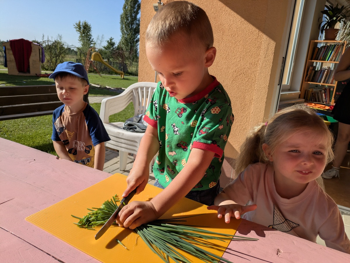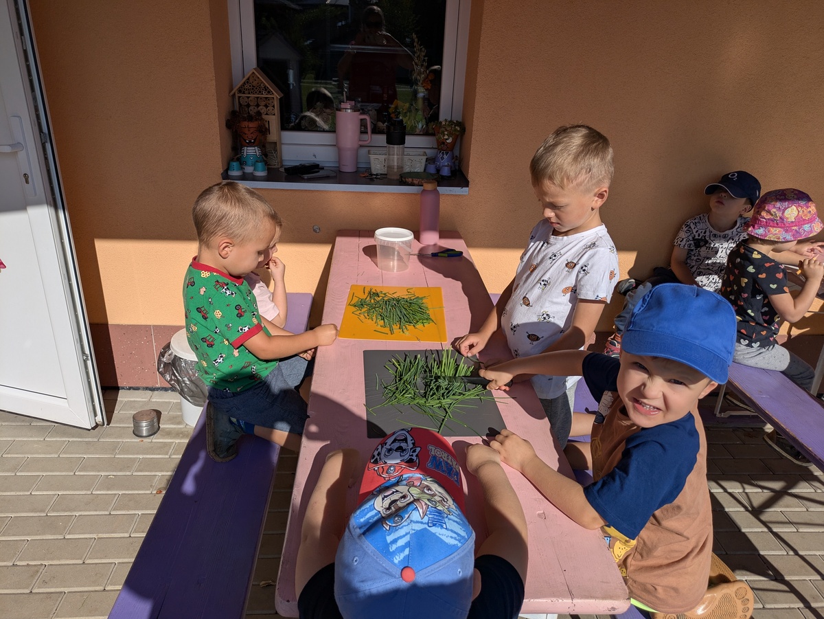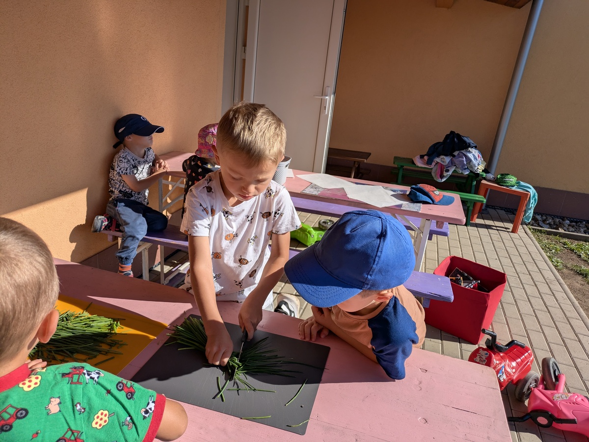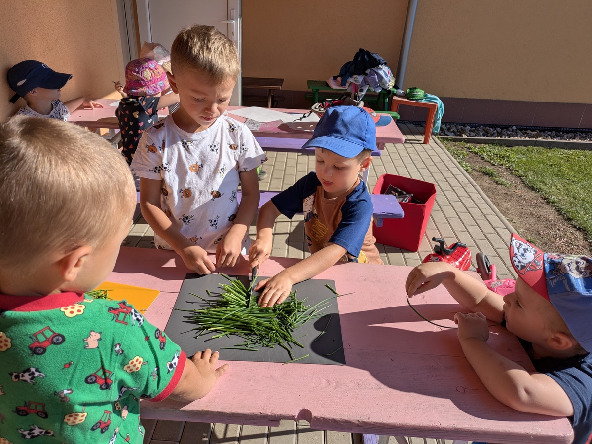 I na podzim máme na naší zahrádce plno práce! Děti ze třídy Motýlků se s vervou pustily do podzimní sklizně pažitky. Nejprve na záhonku ostříhaly poslední a nejlepší trsy. Poté jsme si celou naši "kuchyňku" přestěhovali ven a pažitku jsme s nadšením a velkou pečlivostí krájeli u stolečku na malé kousíčky. Tato voňavá, čerstvě sklizená pažitka nyní poputuje rovnou do mrazáku. Díky tomu si budeme moci čerstvé bylinky přidávat do polévek a chutných pomazánek po celou zimu! Byla to skvělá hodina zahradničení a venkovního vaření v jednom!