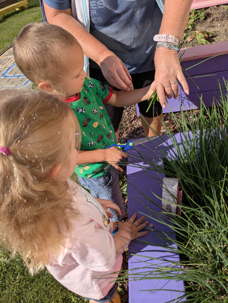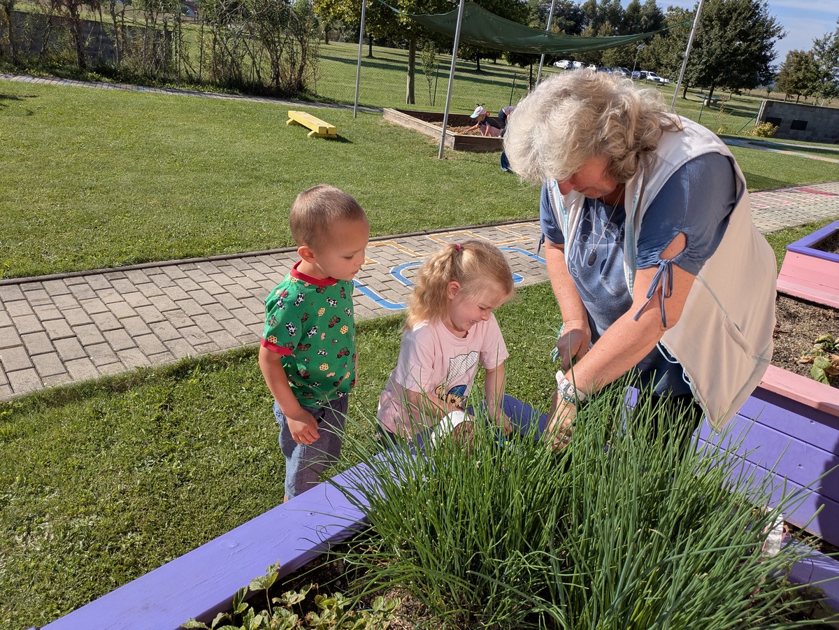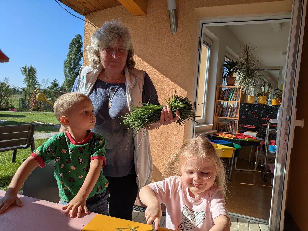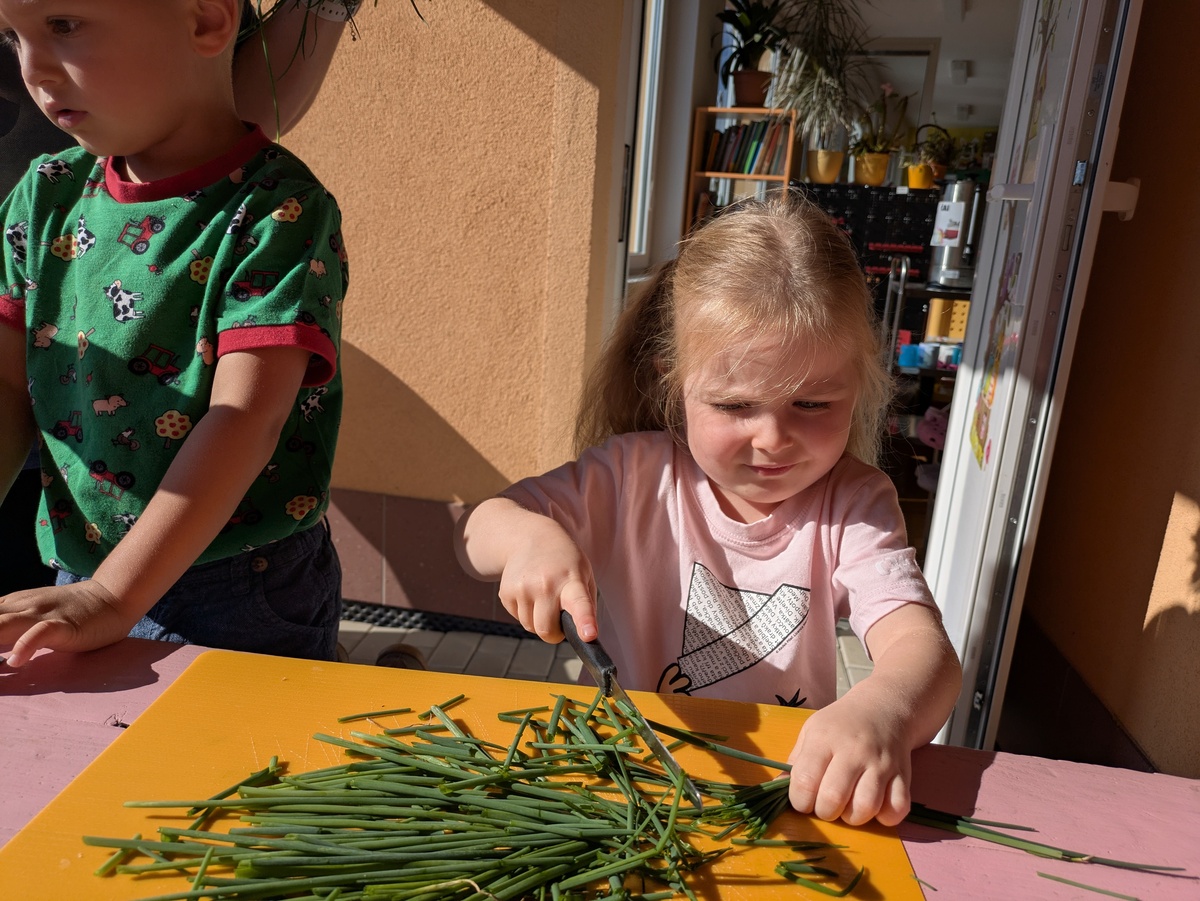 I na podzim máme na naší zahrádce plno práce! Děti ze třídy Motýlků se s vervou pustily do podzimní sklizně pažitky. Nejprve na záhonku ostříhaly poslední a nejlepší trsy. Poté jsme si celou naši "kuchyňku" přestěhovali ven a pažitku jsme s nadšením a velkou pečlivostí krájeli u stolečku na malé kousíčky. Tato voňavá, čerstvě sklizená pažitka nyní poputuje rovnou do mrazáku. Díky tomu si budeme moci čerstvé bylinky přidávat do polévek a chutných pomazánek po celou zimu! Byla to skvělá hodina zahradničení a venkovního vaření v jednom!