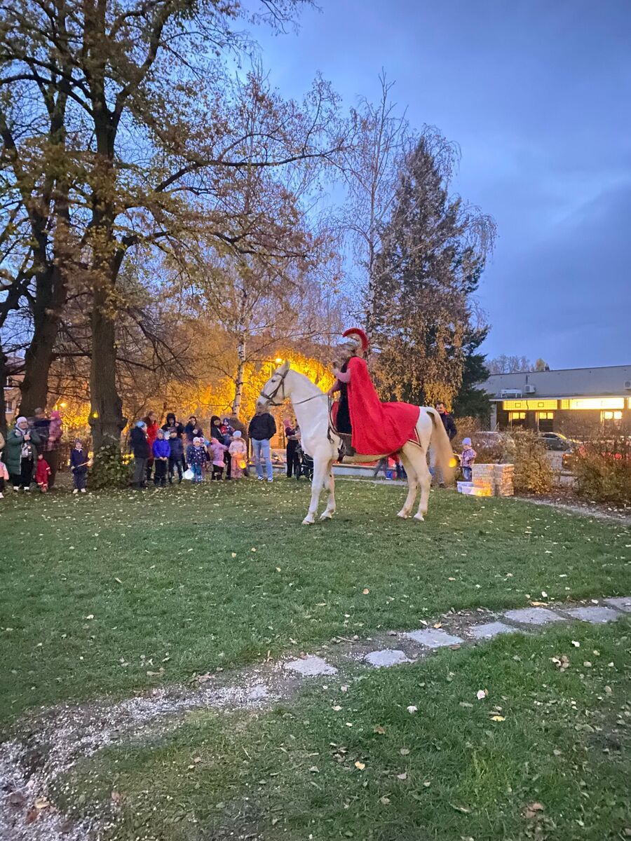 Paní učitelky připravily pro děti úkoly inspirované svatým Martinem. Průvod s lampiony kolem školky tak získal slavnostní atmosféru, kterou završil příjezd svatého Martina na živém bílém koni.