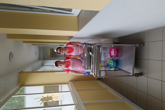 A jak se dostane jídlo až na jejich stolečky? Děti si prohlédnou, jak to vypadá v zákulisí kuchyněk u jednotlivých tříd. Kdo jim chystá přesnídávky a svačinky na kuchyňku u třídy, kdo myje nádobí, kdo jim doveze polévku a jak se na talíře servíruje hlavní chod.