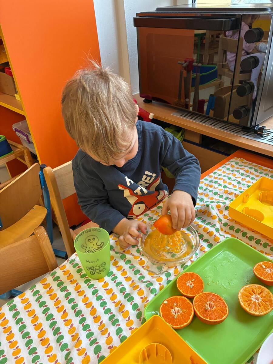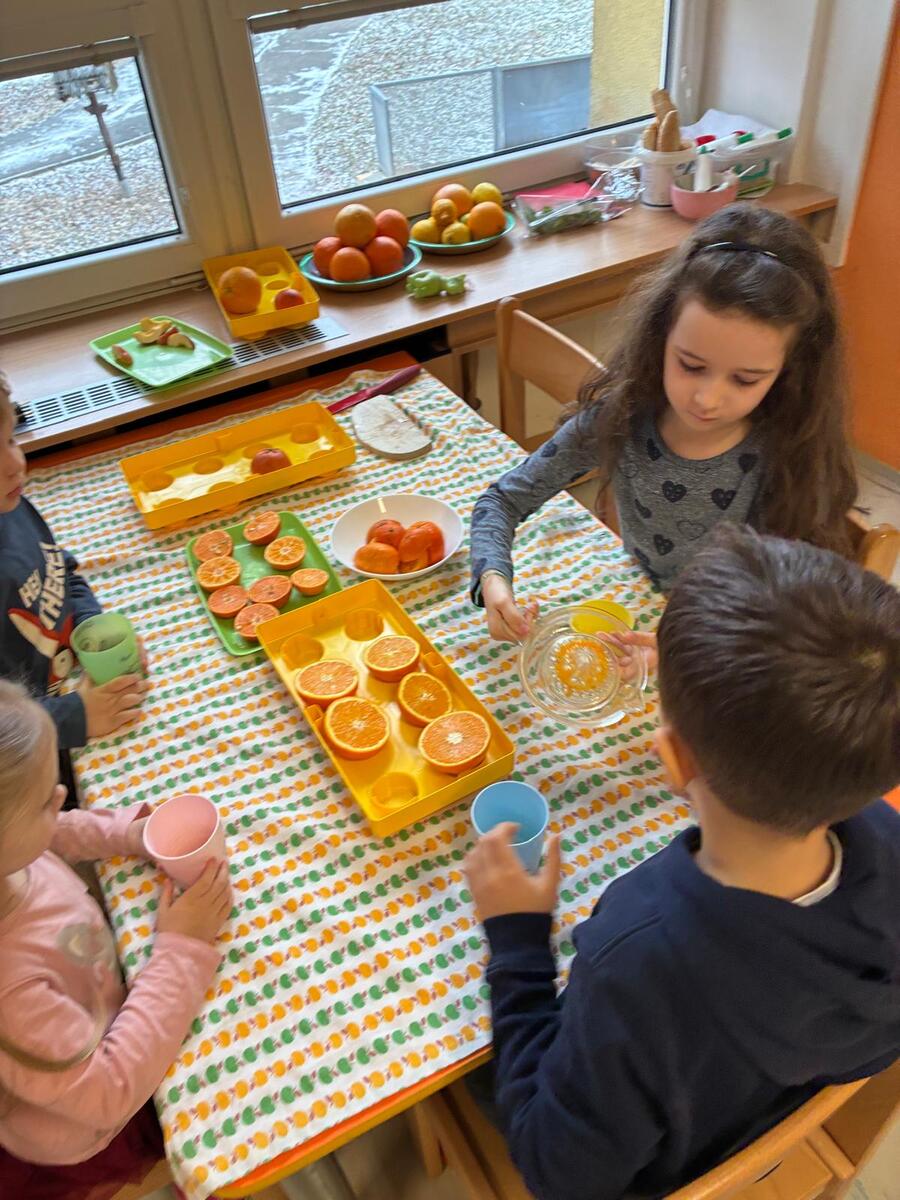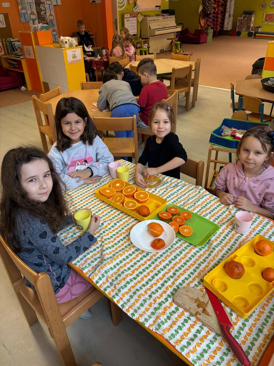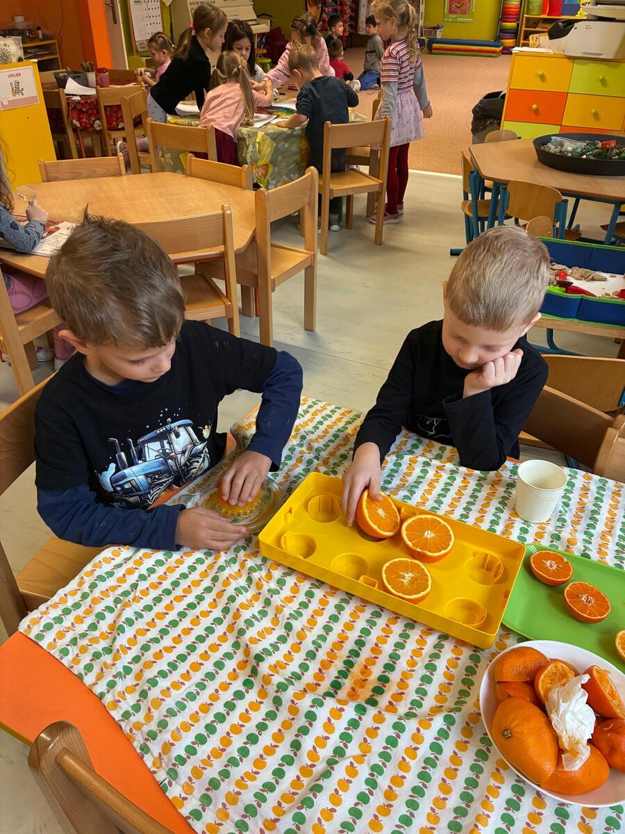 Únor je obdobím, kdy je potřeba dodat tělu vitamíny, abychom přivítali jaro ve zdraví. V rámci našeho oblíbeného centra aktivit Domácnost jsme se tedy rozhodli připravit si vitamínovou bombu plnou přírodní energie. Cílem bylo nejen ochutnat něco zdravého, ale také rozvíjet jemnou motoriku, osvojit si základní pracovní postupy a učit se spolupracovat s ostatními. Děti si nejprve pomeranče prohlédly, zkoumaly jejich barvu, tvar a vůni a také si povídaly o tom, odkud ovoce pochází a proč je důležité pro naše zdraví. Všechny děti, které se účastily, měly možnost samostatně si manuální odšťavňování vyzkoušet, střídaly se, pomáhaly si a učily se trpělivosti. Společná ochutnávka lahodného nápoje byla pak příjemnou tečkou celé aktivity.