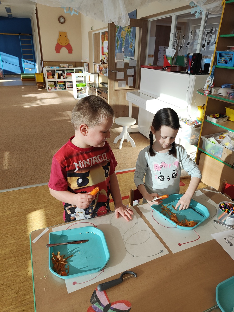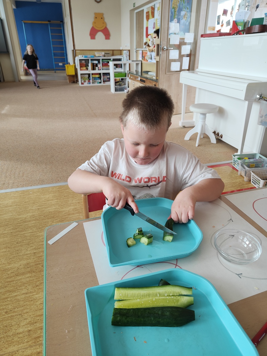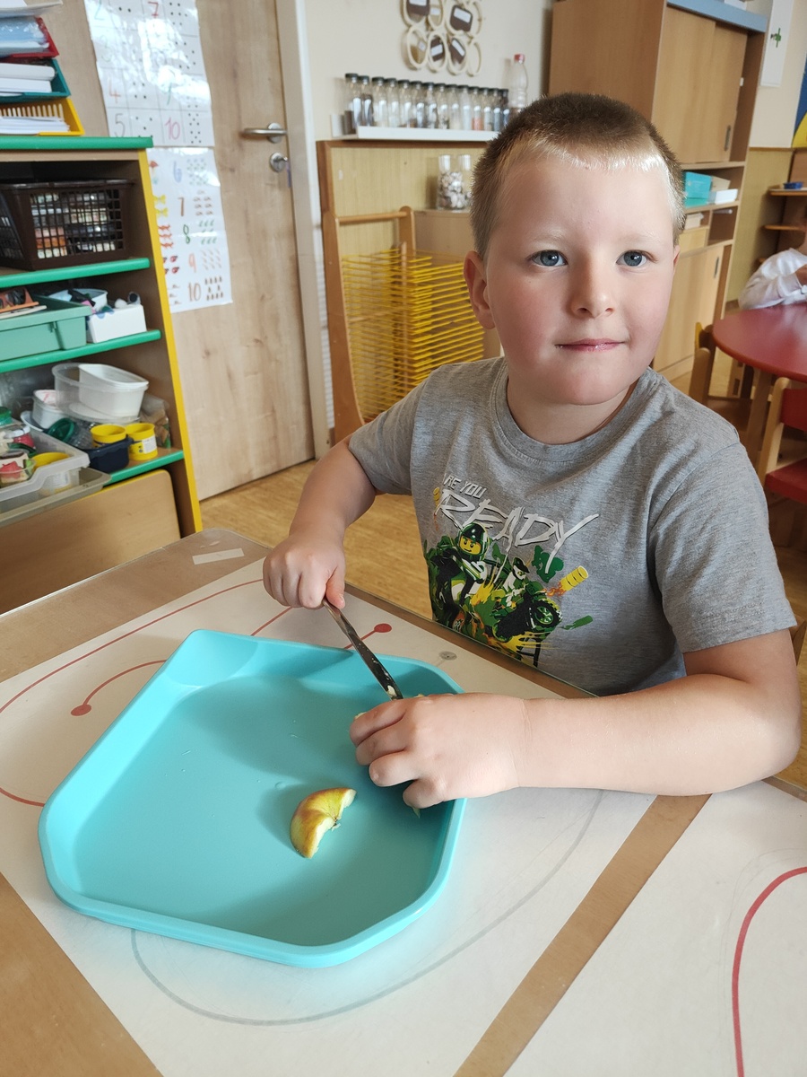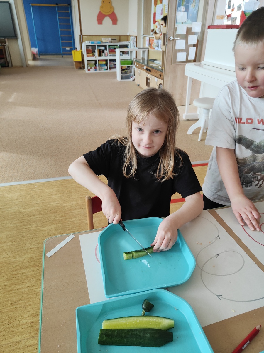 V rámci rozvoje praktických dovedností a podpory zodpovědného přístupu k bezpečnému zacházení s nástroji jsme v naší třídě realizovali řadu řízených činností zaměřených na práci s kuchyňským nožem. Cílem nebylo pouze naučit děti techniku krájení, ale především posílit jejich vnitřní sebekontrolu, soustředění a uvědomělé dodržování bezpečnostních pravidel.