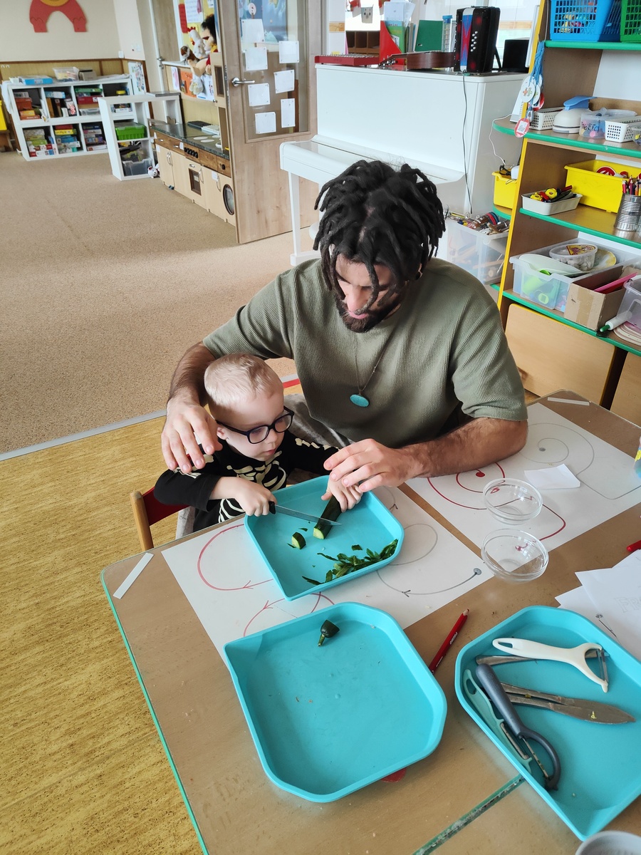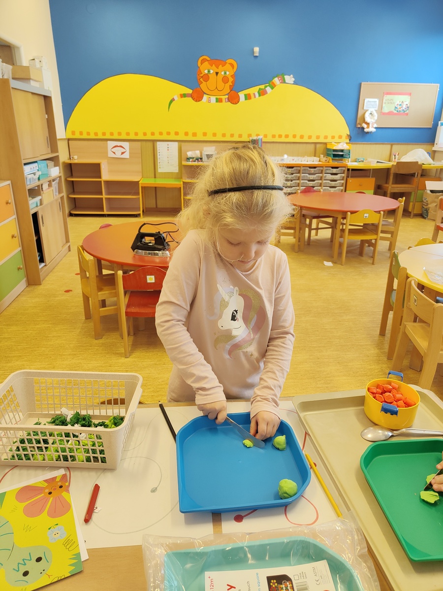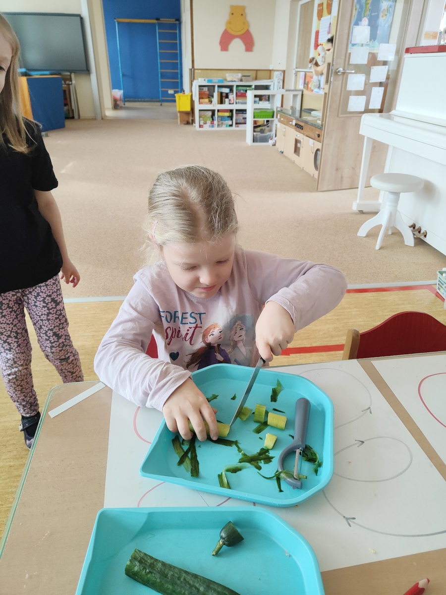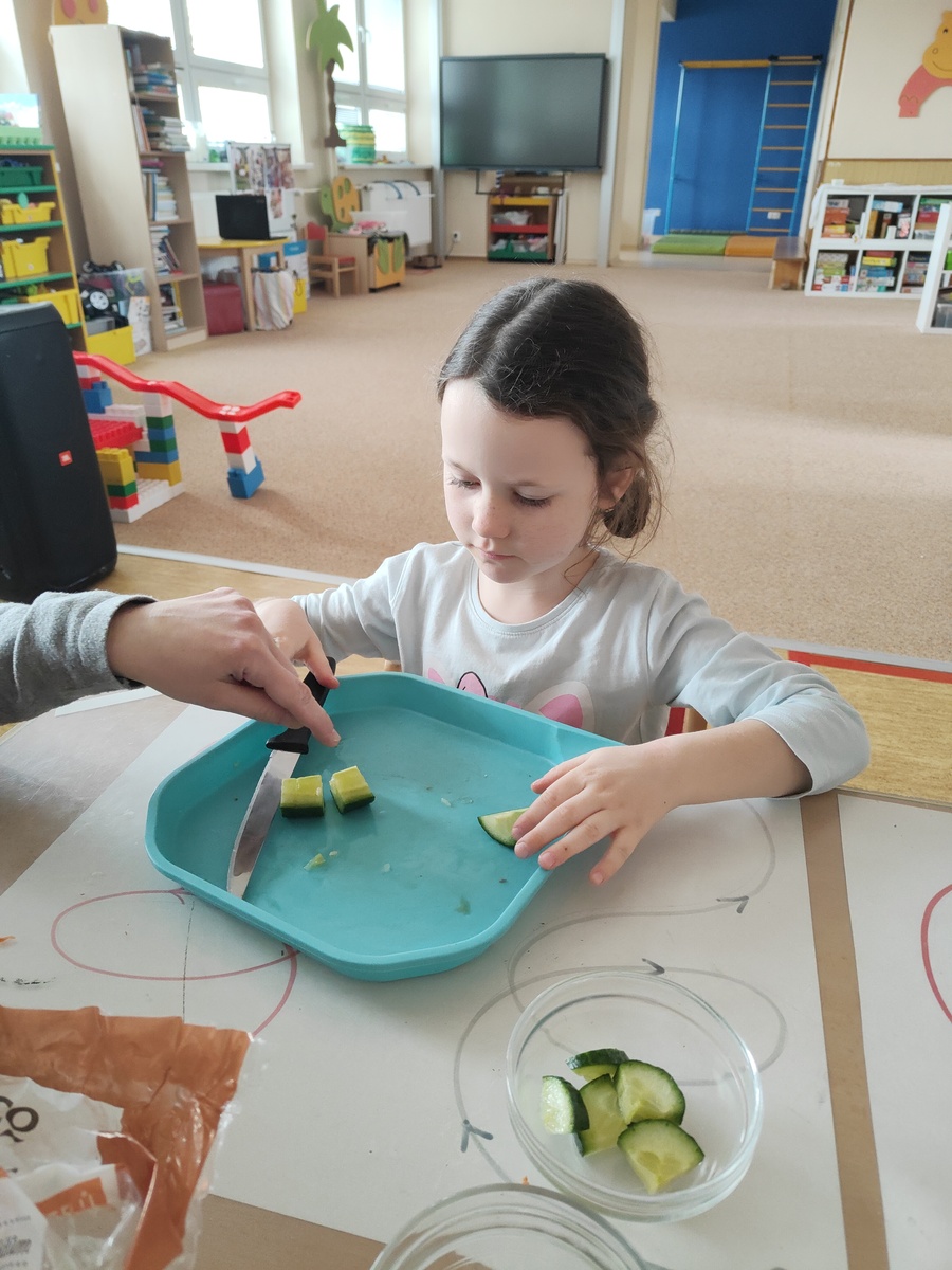 V rámci rozvoje praktických dovedností a podpory zodpovědného přístupu k bezpečnému zacházení s nástroji jsme v naší třídě realizovali řadu řízených činností zaměřených na práci s kuchyňským nožem. Cílem nebylo pouze naučit děti techniku krájení, ale především posílit jejich vnitřní sebekontrolu, soustředění a uvědomělé dodržování bezpečnostních pravidel.