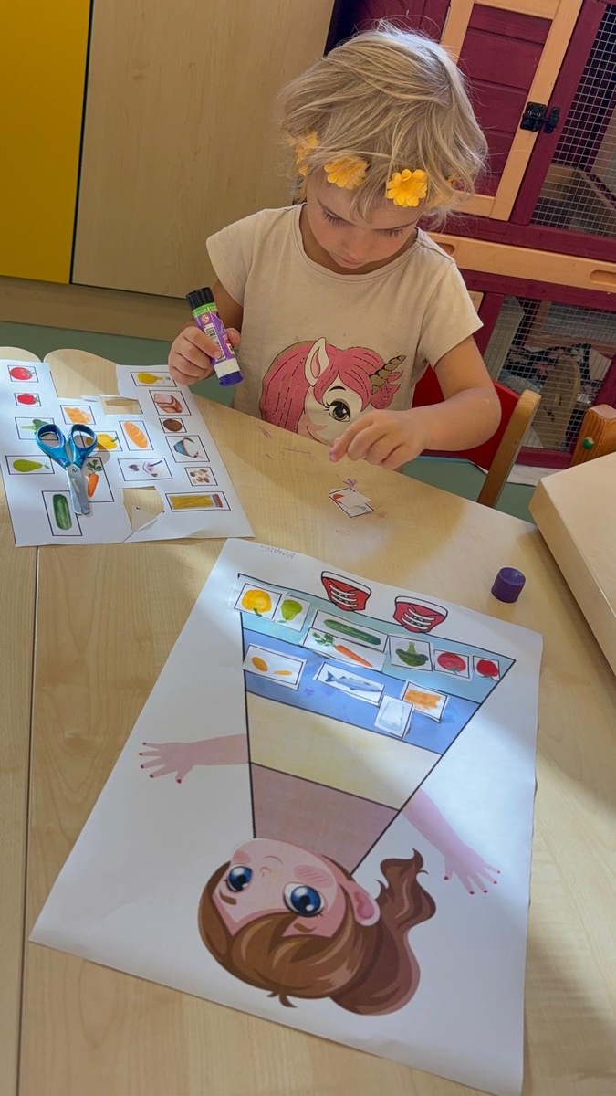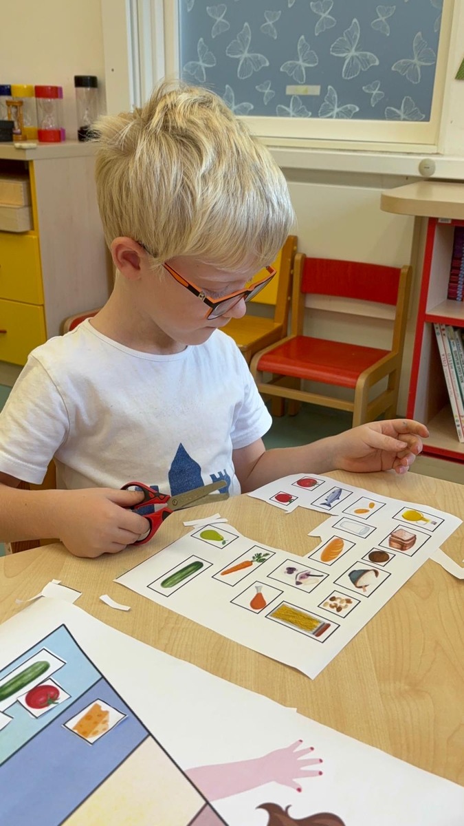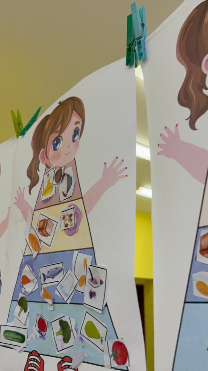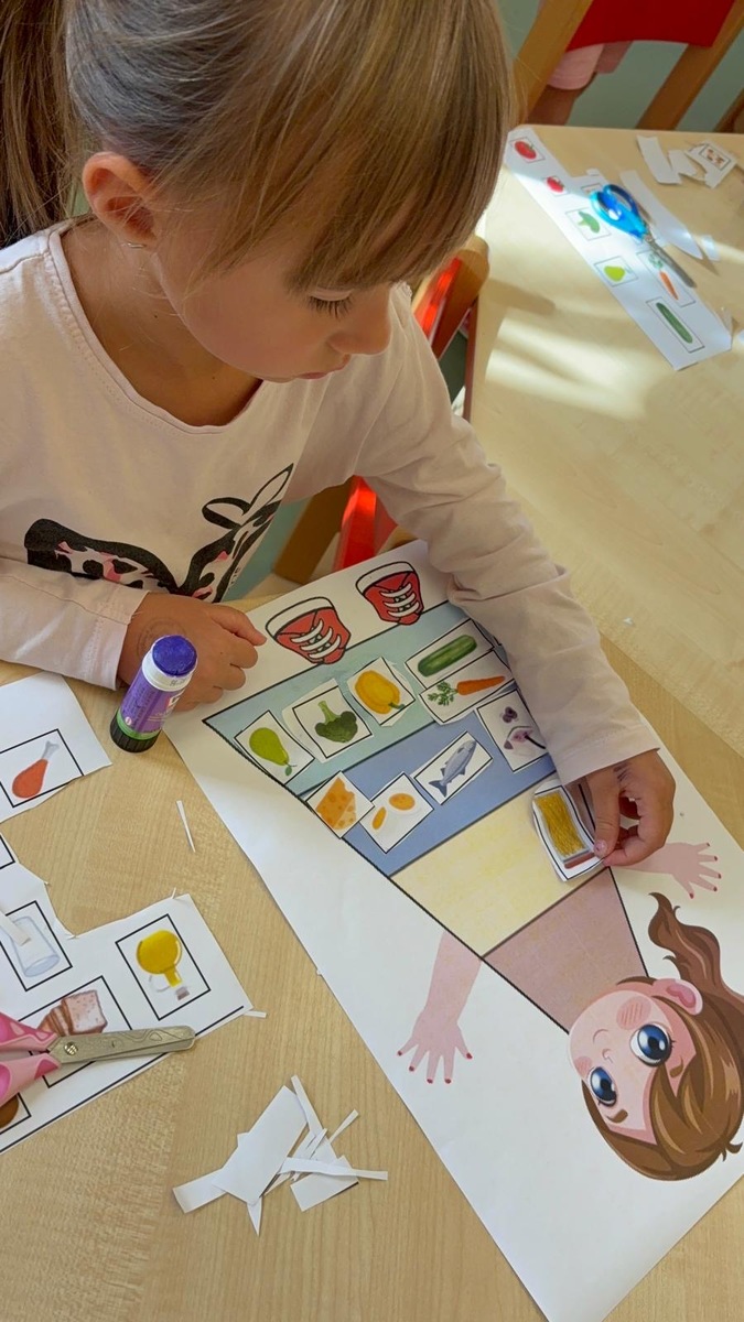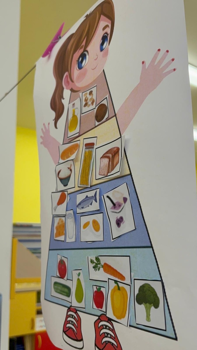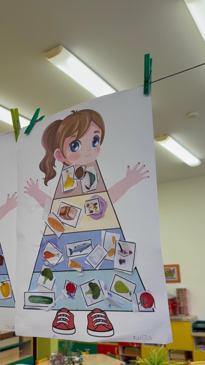 VZDĚLÁVÁME SE Tvoříme potravinovou pyramidu Dnes si děti povídaly o zdravém stravování. Stříhaly obrázky potravin a společně je lepily do potravinové pyramidy. Učily se rozlišovat jednotlivé skupiny potravin – sacharidy, bílkoviny, tuky, ovoce a zeleninu. Díky této aktivitě si děti uvědomily, které potraviny nám dodávají energii a proč je důležité jíst pestře a vyváženě.