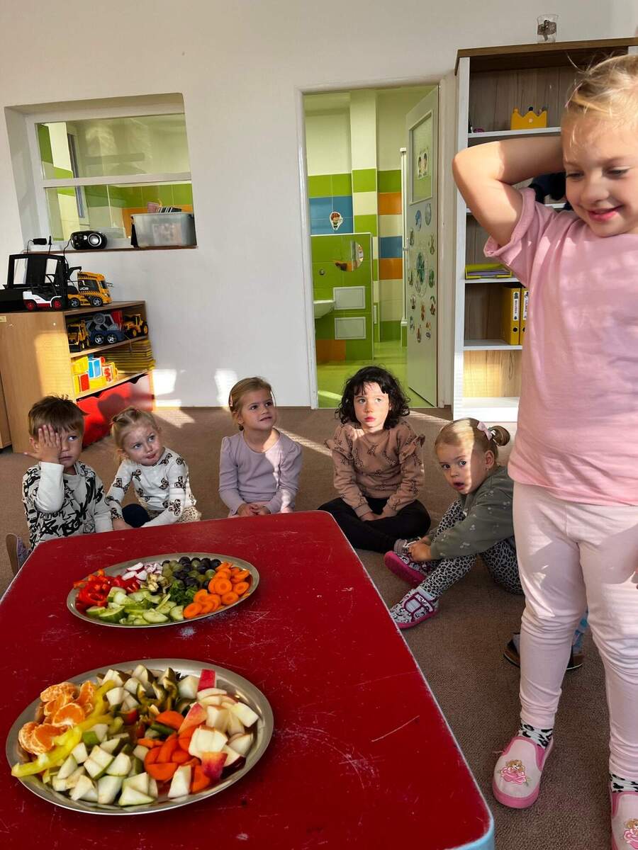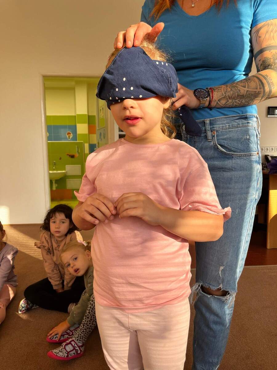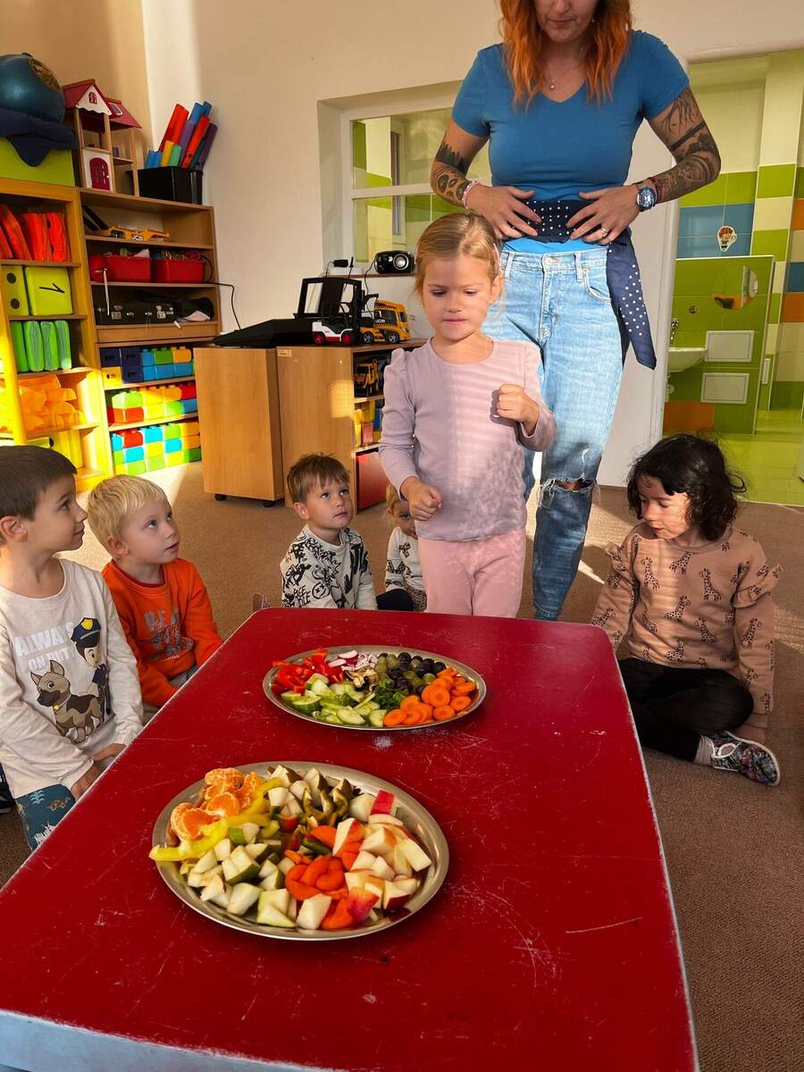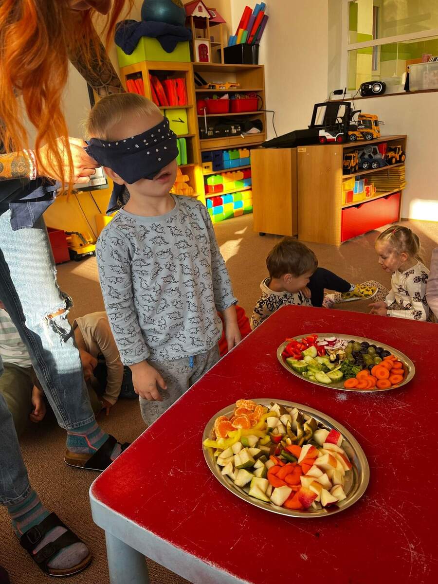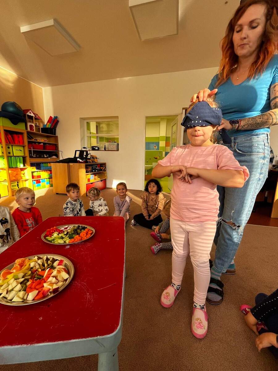 Děti si nejprve za pomocí paní učitelky nakrájely různé druhy ovoce a zeleniny. Pak jsme dětem zavázali oči a každé z nich ochutnávalo jednotlivé kousky, snažily se podle chuti, vůně a konzistence poznat, co mají v puse. Hra byla plná smíchu a překvapení a děti si při ní s radostí vyzkoušely nové chutě.