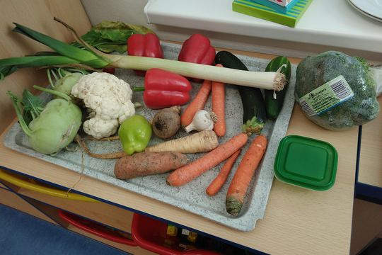 Naše výstavka zeleniny je plná a můžeme začít poznávat. Pozorujeme, očicháváme, porovnáváme velikosti a barvy, zkoušíme váhu a povrch jednotlivých druhů, povídáme si o nich ... a nakonec je taky ochutnáme! Nejen že se dozvídáme o vlastnostech, pěstování a využití zeleniny. Také se naučíme, jak zpracovat její zbytky nebo co dělat s kousky, které už nejsou vhodné k jídlu. Tak a v šatně už jsou pan a paní Paprikovi.