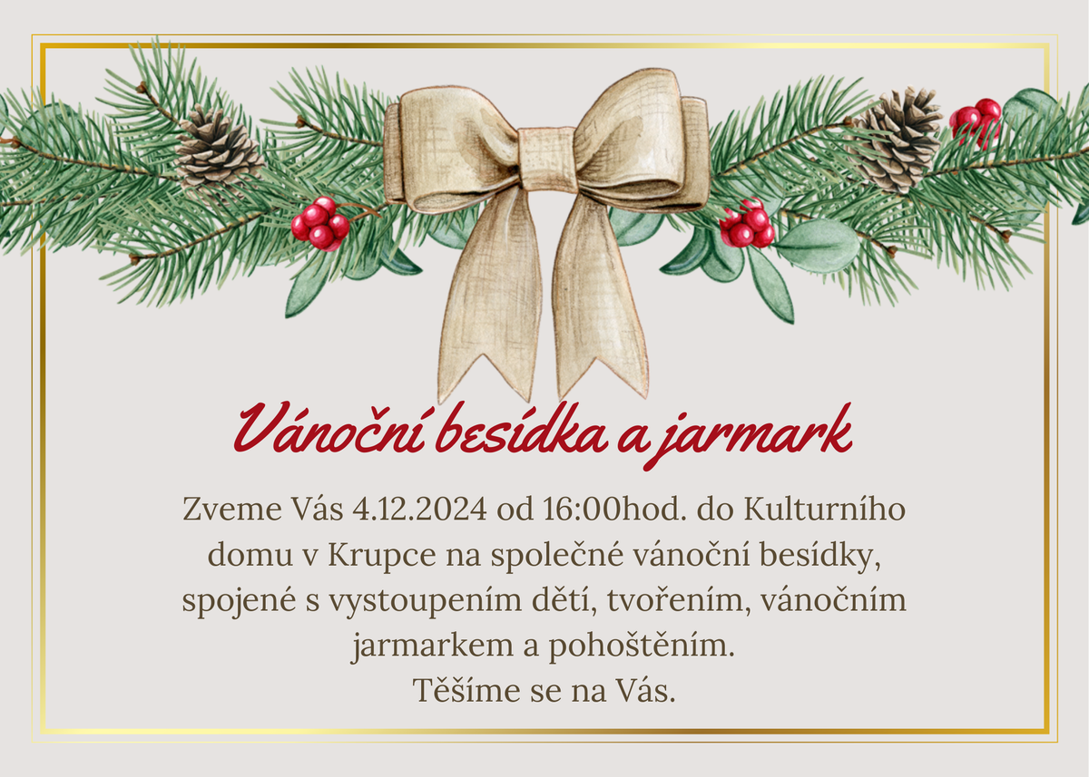 Srdečně vás zveme na vánoční jarmark, který pořádá Mateřská škola Sluníčko Krupka. Přijďte si užít kouzelnou předvánoční atmosféru a strávit příjemný čas s rodinou a přáteli. Akce se koná v Kulturním domě v Krupce a nabízí pestrý program pro děti i dospělé.