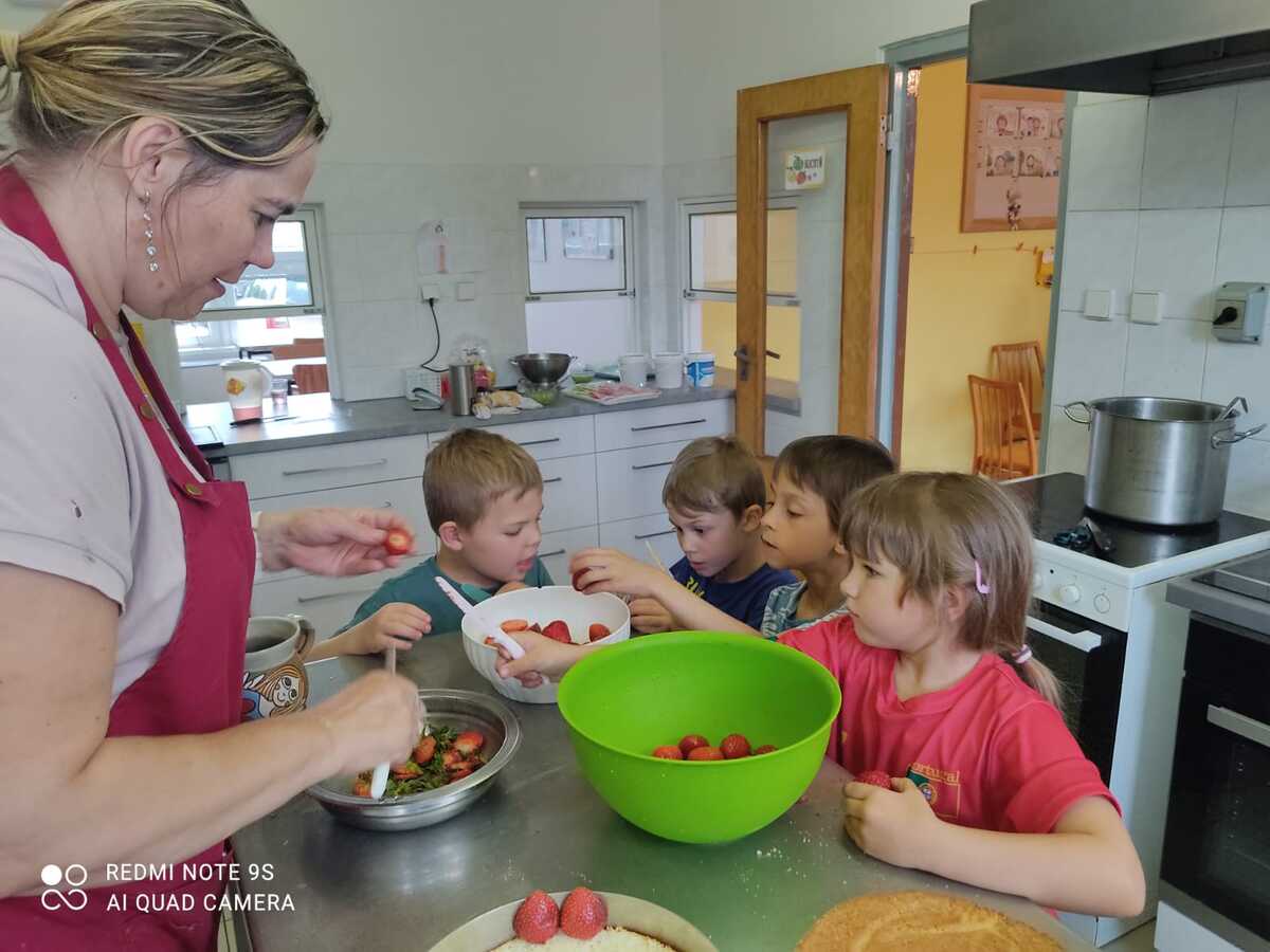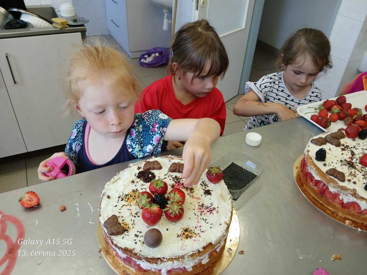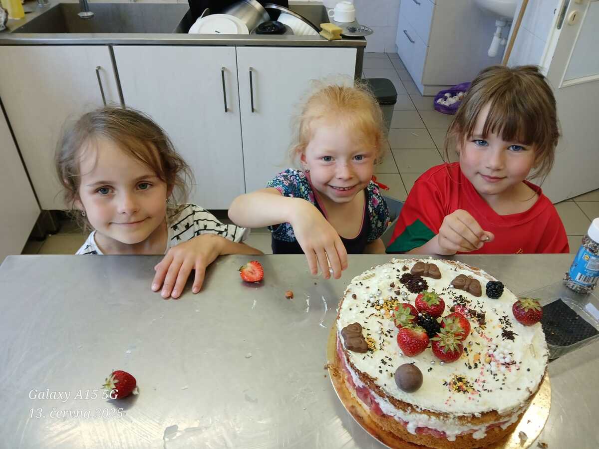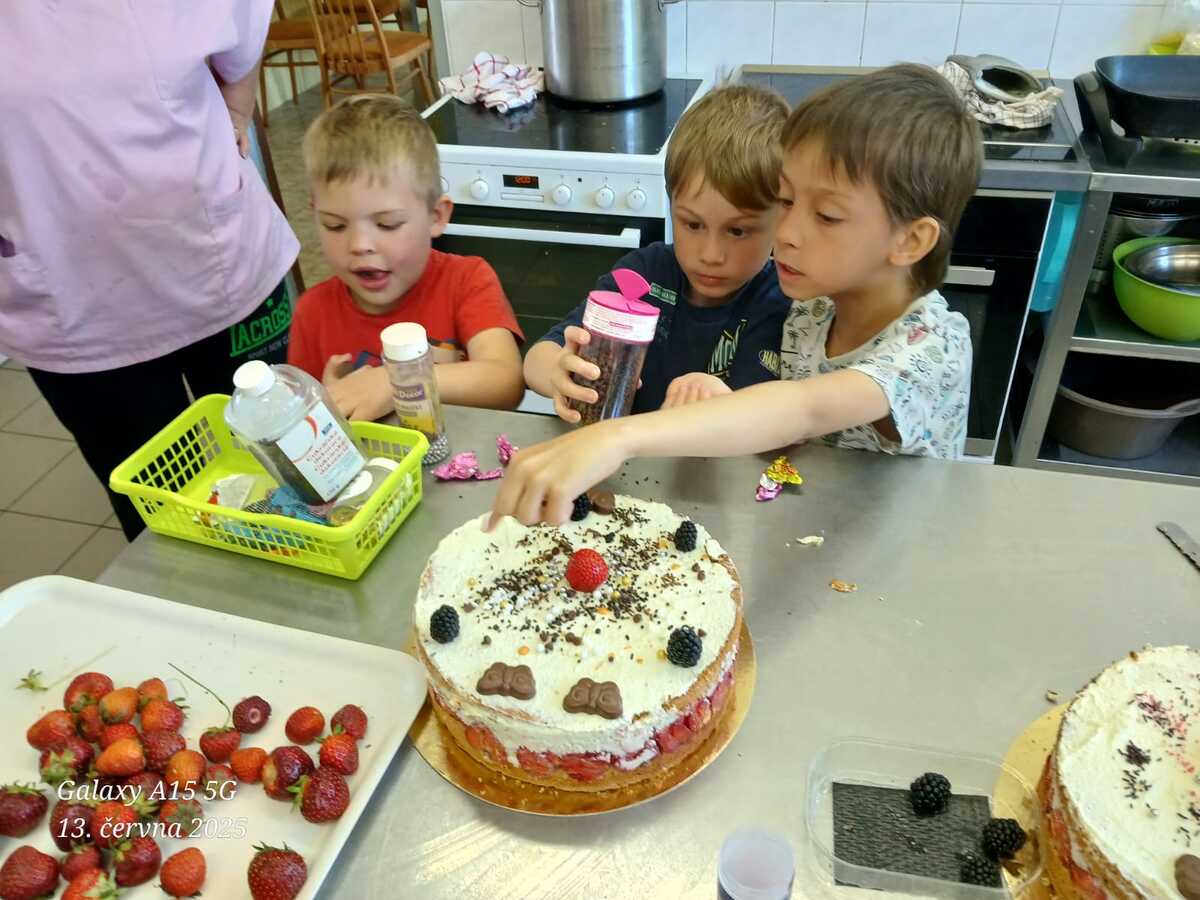 Každý rok si naši předškoláci pečou na rozloučenou vlastní dort. Sami si vyberou, čím ho chtějí ozdobit, a s velkou radostí se pustí do zdobení. Na závěr se o dort podělí se všemi kamarády ve školce – je to naše milá tradice, na kterou se děti vždy těší.