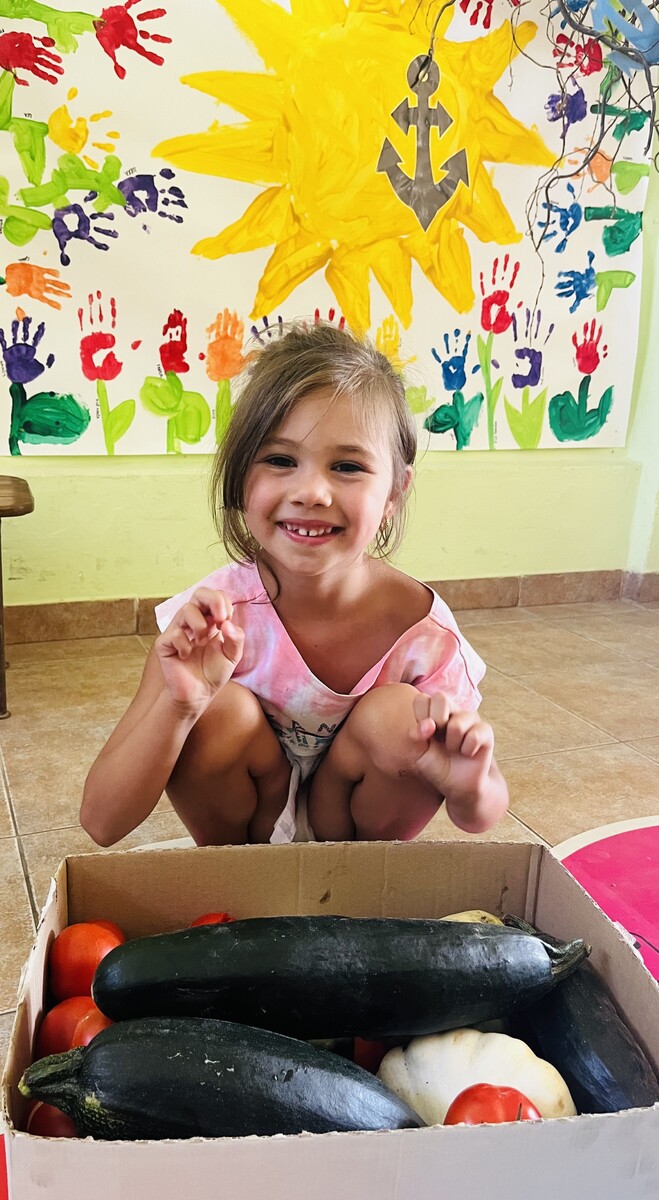Dnes paní kuchařku v kuchyni překvapila Týnka s maminkou, které přinesly plnou bedýnku zeleniny z jejich zahrady. Ve čtvrtek paní kuchařka upeče dětem cuketovou buchtu, kterou ochutnají i rodiče. Další cuketku přidá paní kuchařka do krémové polévky, rajčátka budou mít děti nakrájené a mohou si na nich kdykoliv během dne pochutnat.