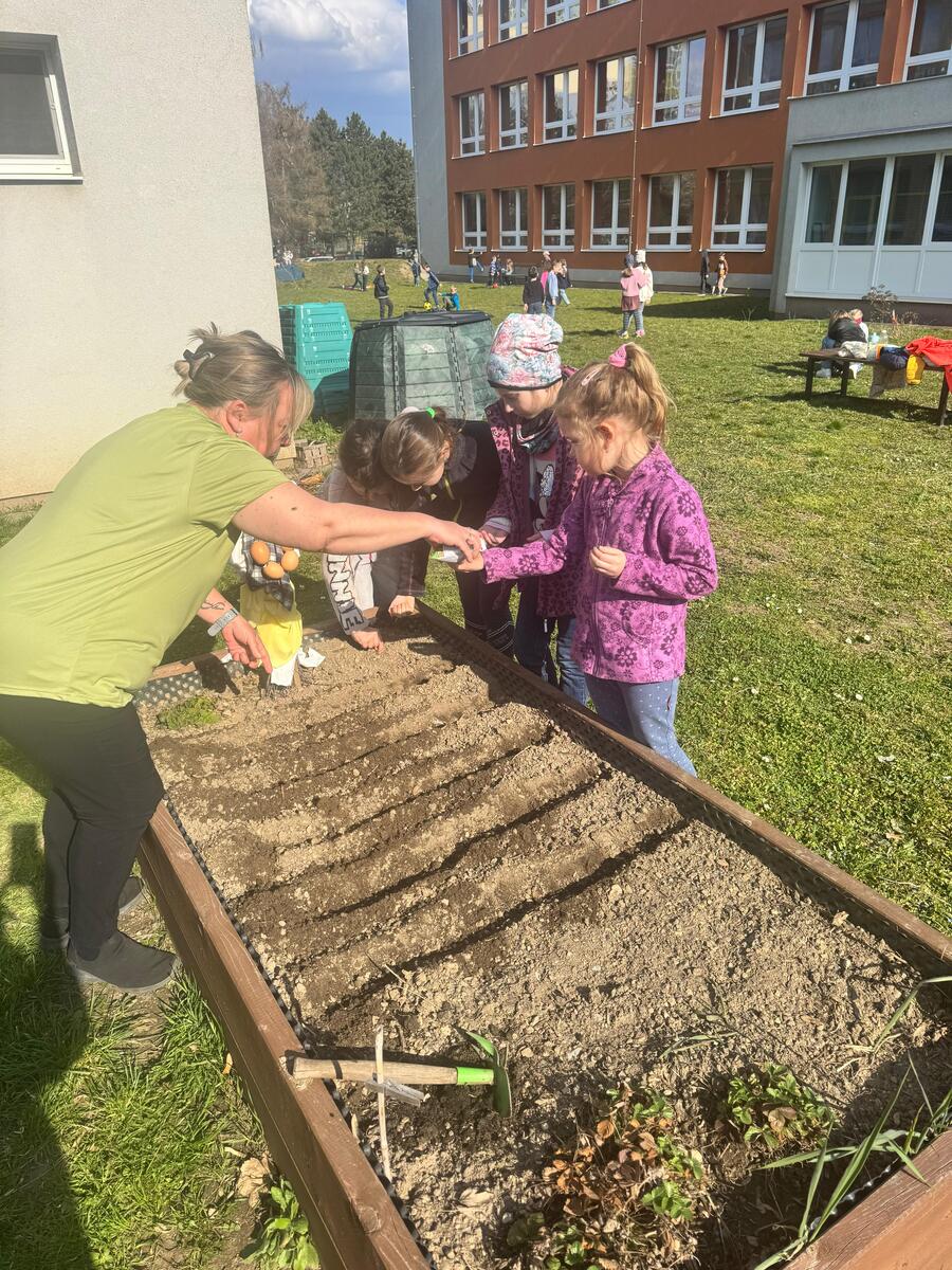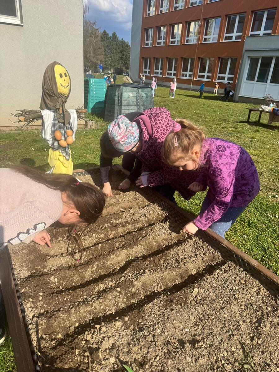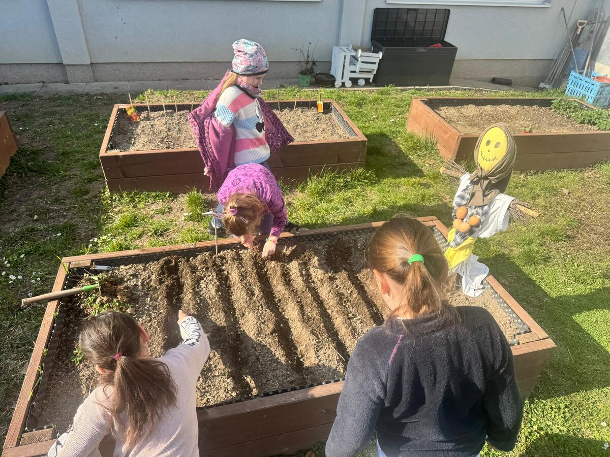 Dnes bylo na naší zahradě opravdu živo. Děti se s nadšením pustily do sázení hrášku do připravených záhonků. Malé ruce opatrně vkládaly semínka do hlíny, zasypávaly je a pečlivě zalévaly. Každý si přitom představoval, jak brzy vyrostou první zelené výhonky. Nechyběla ani fantazie – mezi dětmi se hned rozšířila pohádka o „princezně na hrášku“. Někteří se smáli, že až hrášek vyroste, určitě mezi záhonky objevíme opravdovou princeznu, která pozná každé semínko i pod vrstvou hlíny.