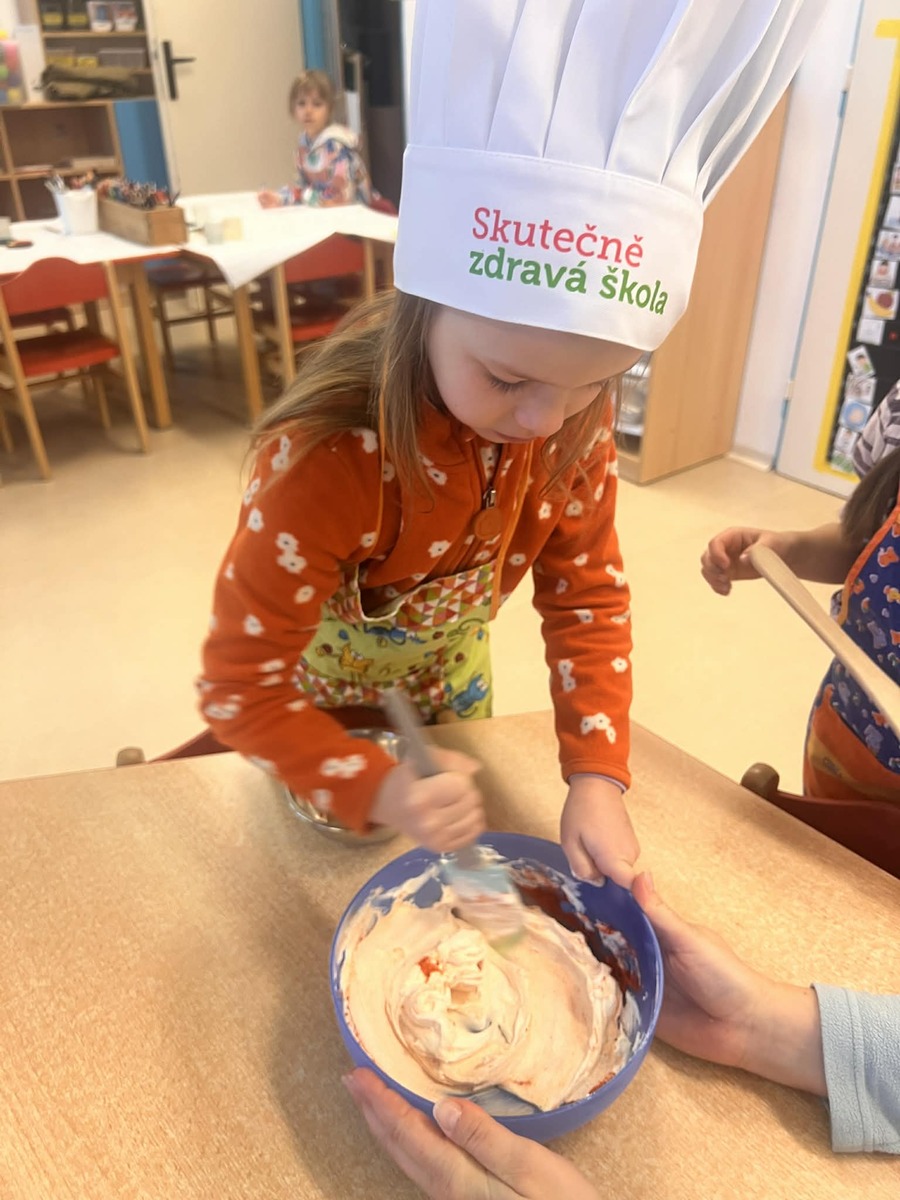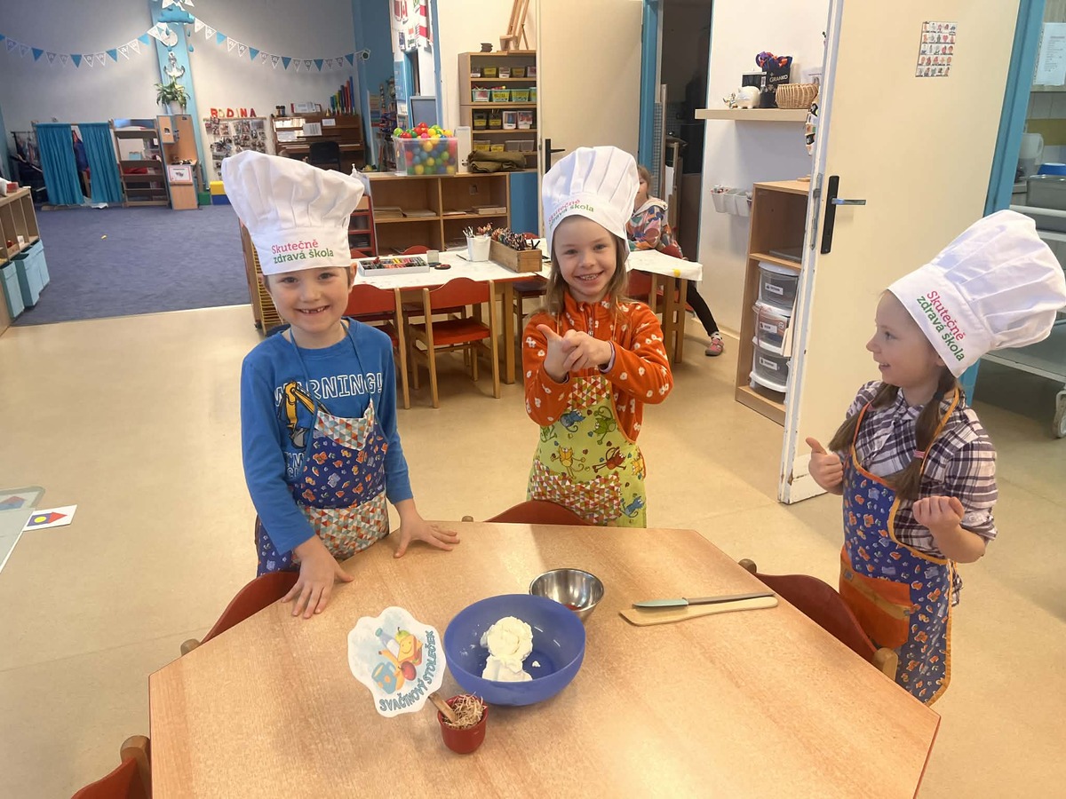 Vrcholem dopoledne bylo společné stolování. Děti si pomazánku samy naservírovaly a s hrdostí ji nabízely i kamarádům. Tato aktivita v dětské kuchyňce opět potvrdila, že praktické dovednosti a radost z vlastního úspěchu jsou pro vývoj dítěte nenahraditelné.