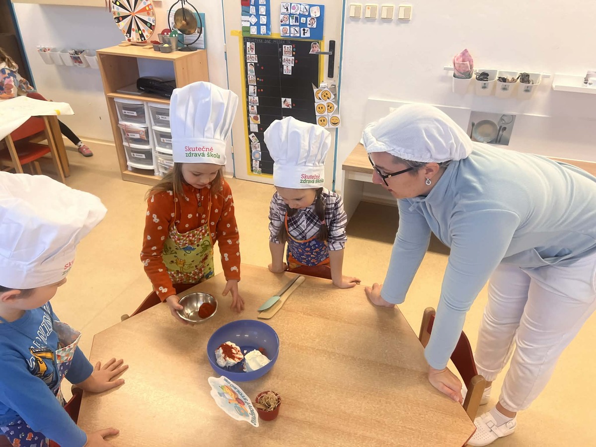HRADEC NAD MORAVICÍ – V naší mateřské škole razíme heslo, že nejlépe chutná to, co si člověk sám připraví. Tentokrát se naše nová dětská kuchyňka proměnila v opravdové kulinářské studio. Pod odborným dohledem paní kuchařky se děti pustily do ambiciózního úkolu – přípravy dopolední svačinky pro celou třídu.