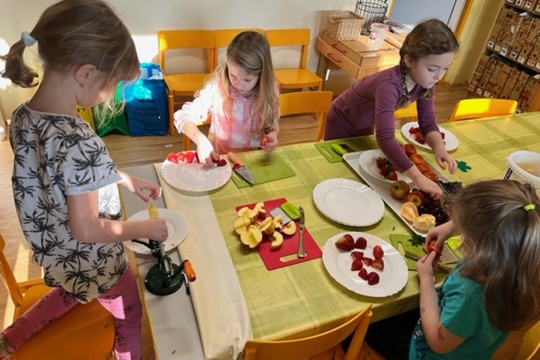 Děti opět připravovaly oslavu narozenin. Zaměřili jsme se na samostatnost celé přípravy s minimální pomocí učitelky. Příprava pomůcek, oloupání mandarinek a pomerančů, krájení ovoce a aranžování talířů. Na krájení jablíček používáme kráječ, který zároveň oddělí jádřinec a jablíčko nakrájí do tenké spirálky, kterou děti překrojí a vzniklé půlměsíčky skládají do vzorů na talíři společně s dalším ovocem. Vznikly zajímavé mandaly a skutečně žádný dospělák nezasahoval. Důraz byl kladen také na závěrečný úklid, roztřídění odpadu - bioodpad, papír, plast. Bioodpad putoval hned do vermikompostéru a na další odpad máme barevné tašky z Recyklohraní. Závěrem děti zvládly úklid, utření a úpravu stolu a pozvání kamarádů.