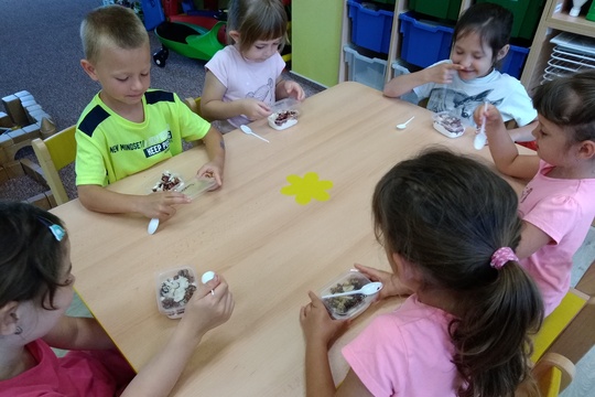 Dnes si děti připravily společně s Mgr. Andreou Hruškovou různé zdravé svačinky. Nejvíce jim chutnalo zapečené ovoce s drobenkou z ovesných vloček a zeleninové špízy. Děti se už těší, až takové dobroty připraví doma rodičům.