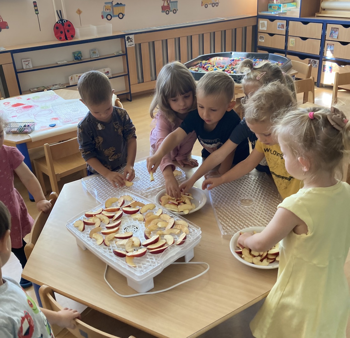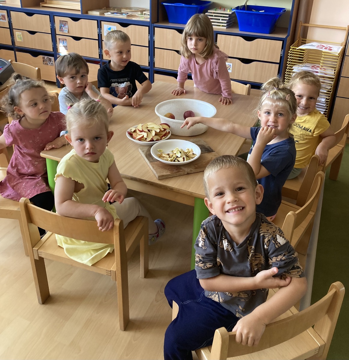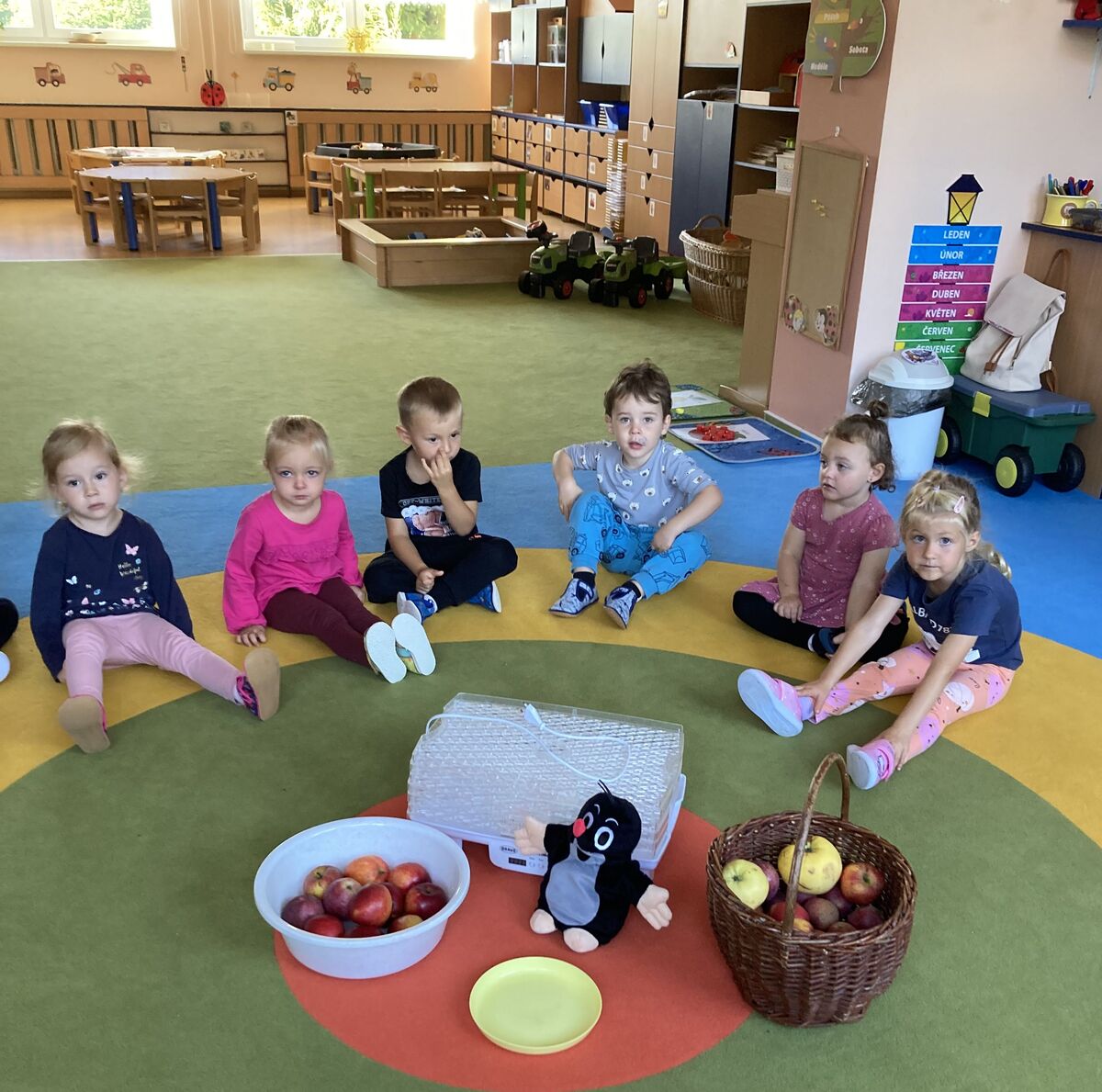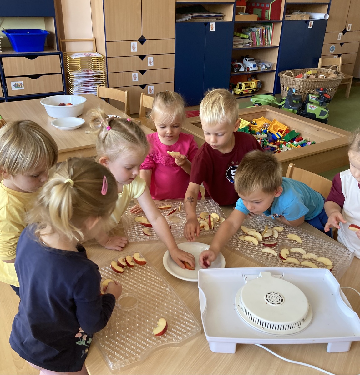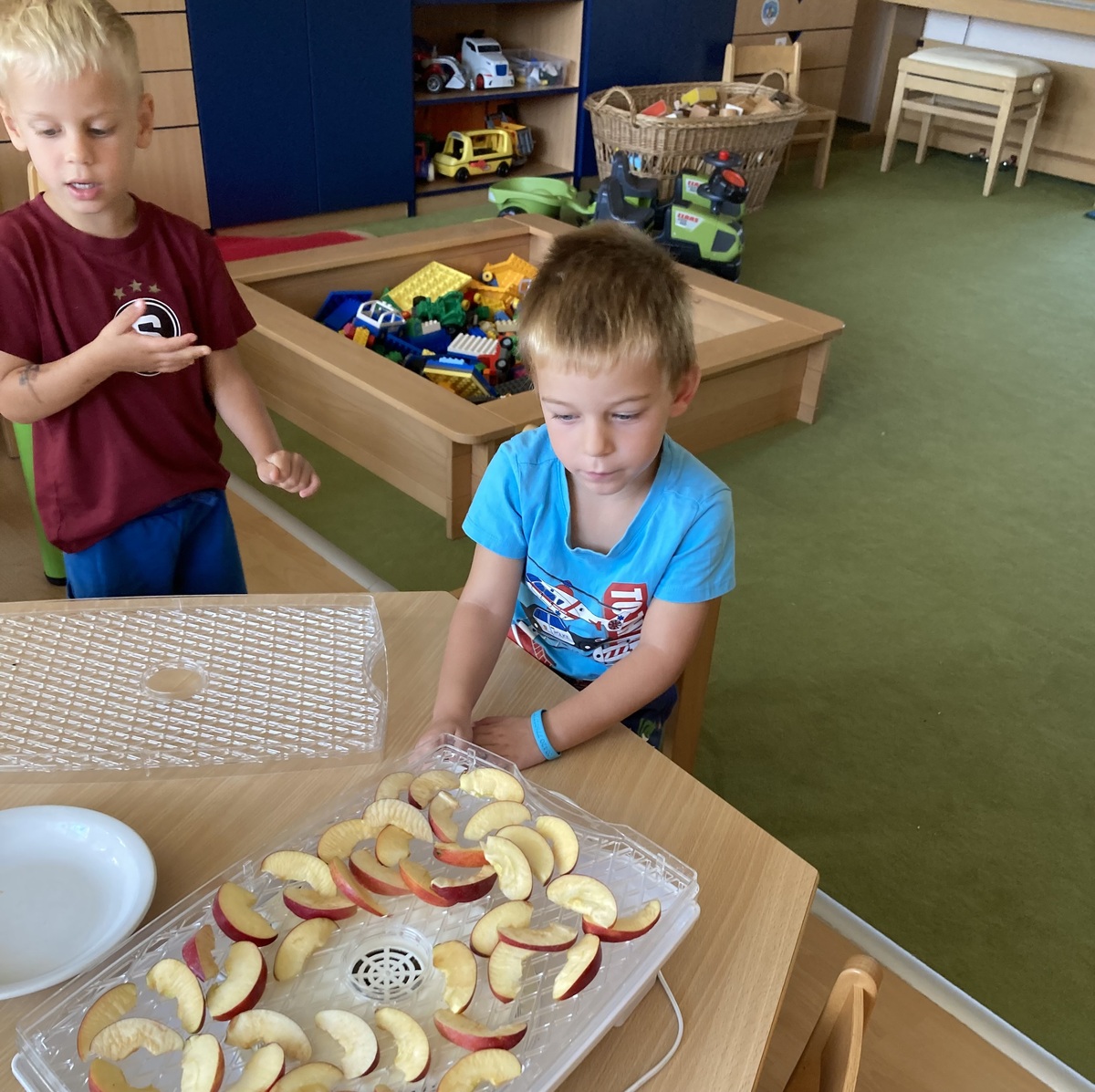 Děti se zapojily do mytí a příprav jablek na sušení. Pracovali jsme ve dvou skupinách. Pověděli jsme si o bezpečnosti při práci, u rozkrojeného jablka jsme sledovali jadřinec a pecky. Nakrájená jablka děti rovnaly na sušící pláty. Sušičku jsme zapojili v jídelně, kde nám voněla sušící se jablka. Kontrolovali jsme stav sušení a těšili se na ochutnání…