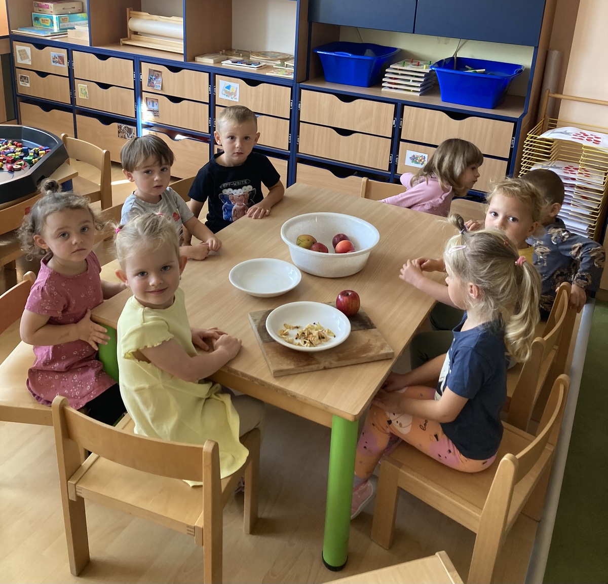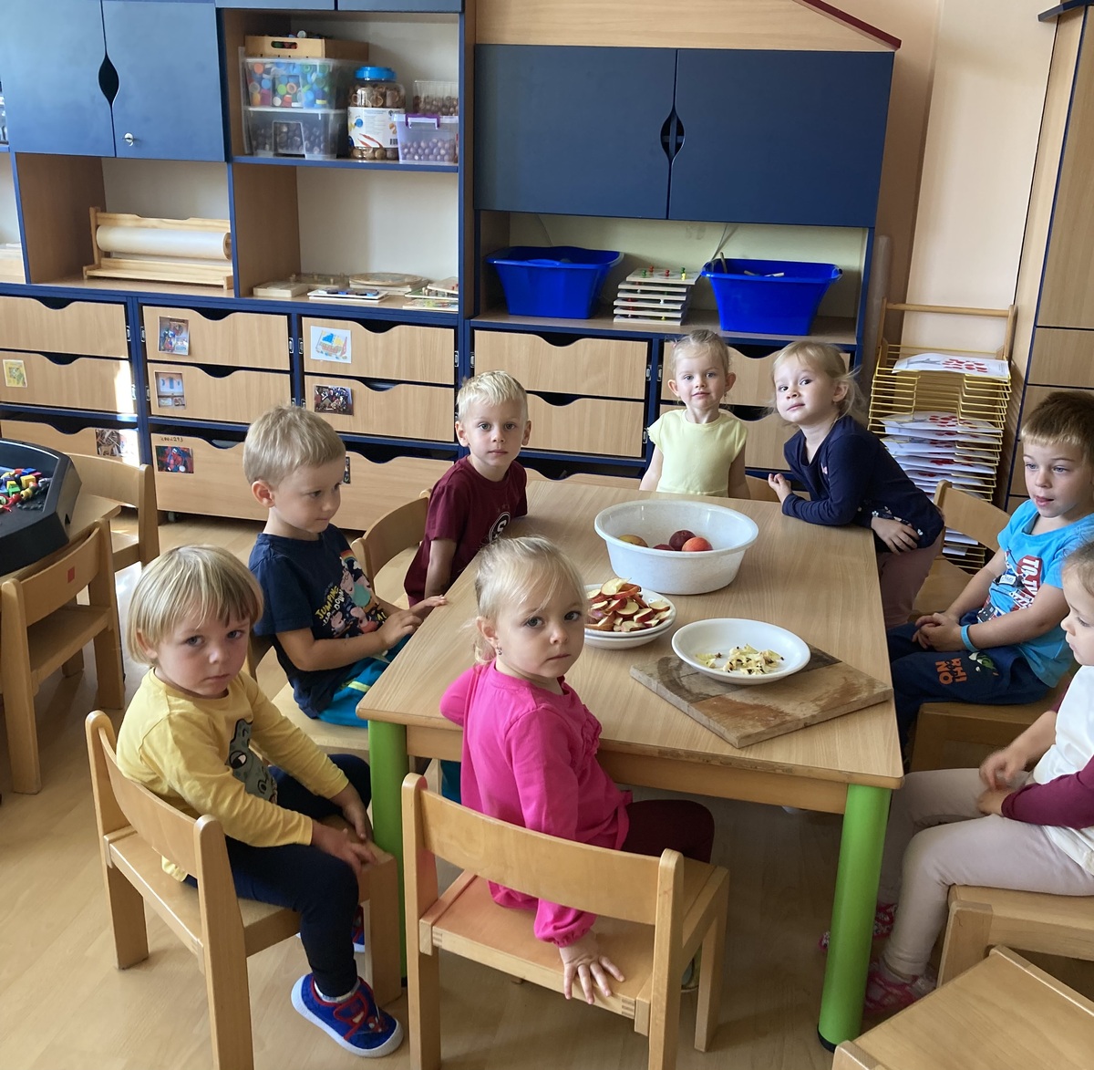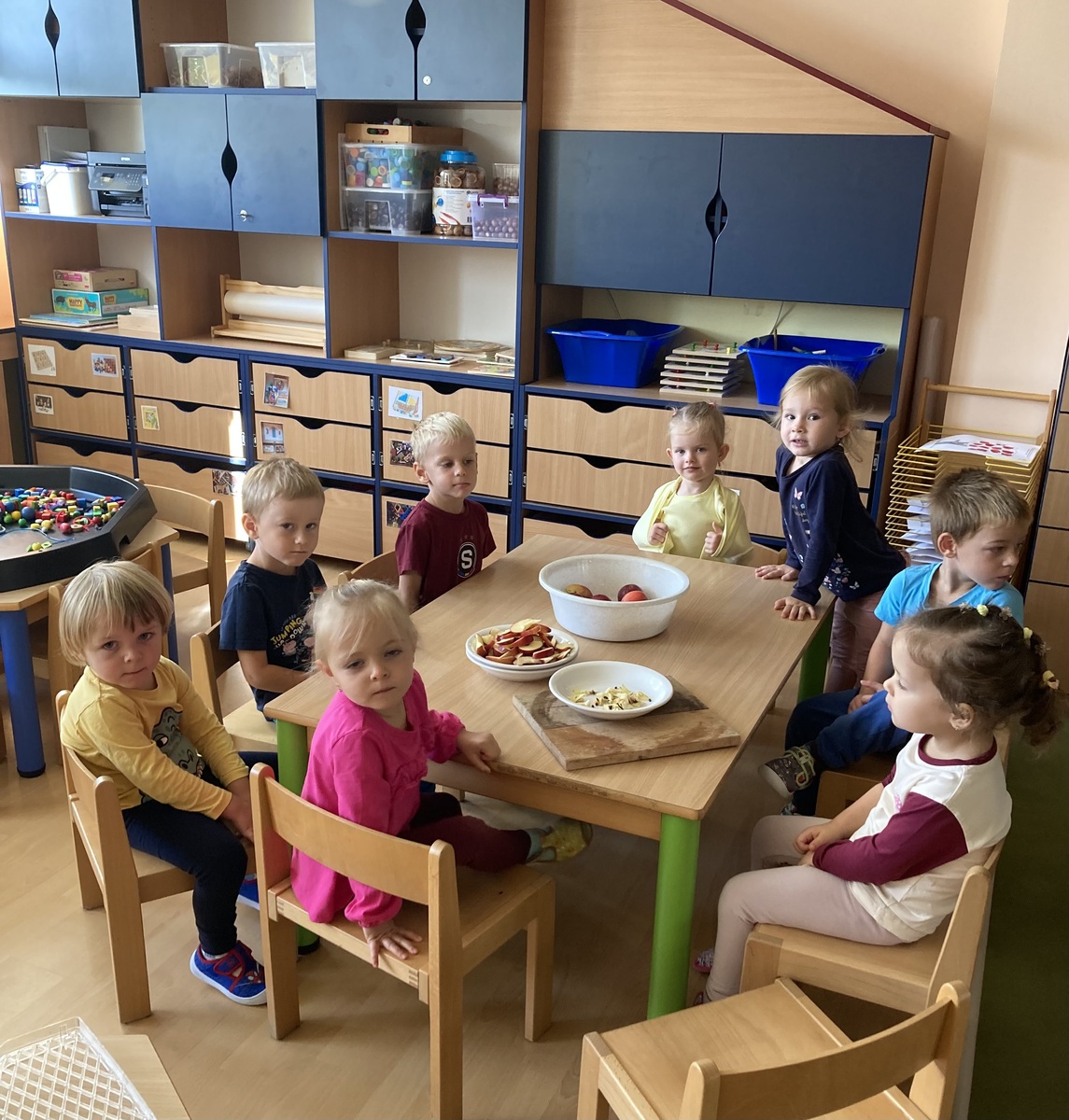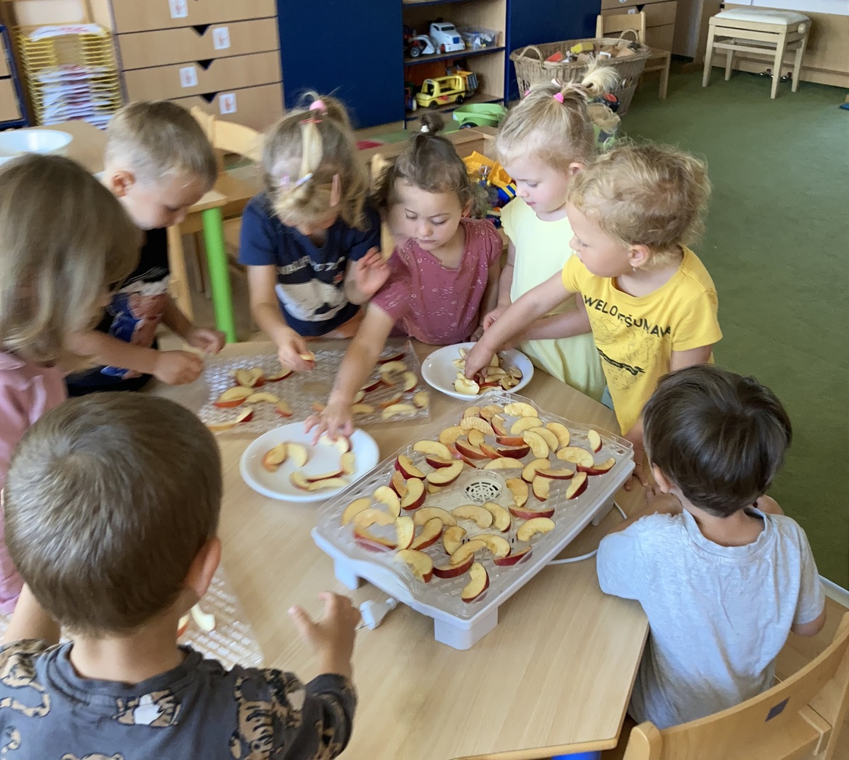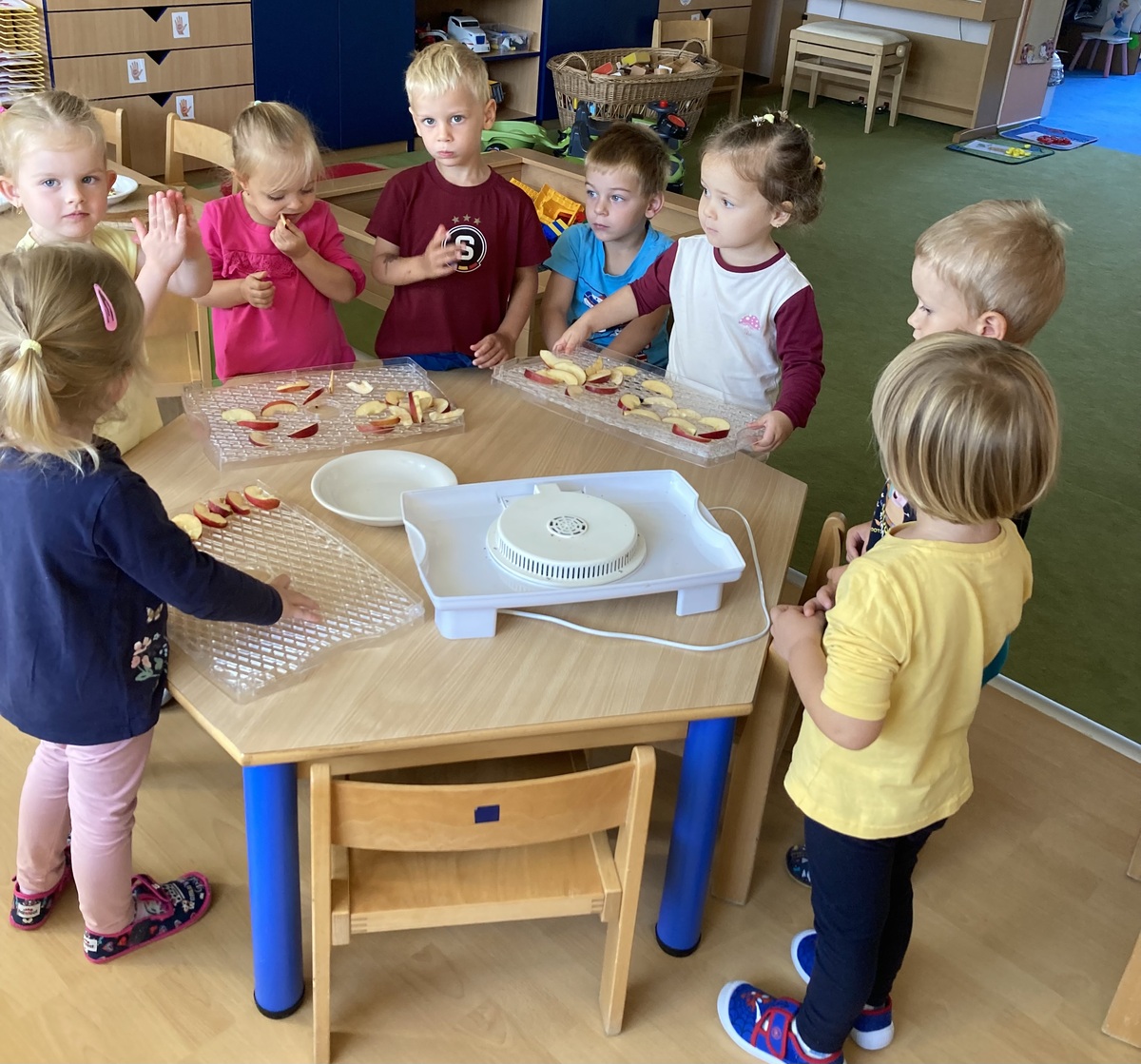 Děti se zapojily do mytí a příprav jablek na sušení. Pracovali jsme ve dvou skupinách. Pověděli jsme si o bezpečnosti při práci, u rozkrojeného jablka jsme sledovali jadřinec a pecky. Nakrájená jablka děti rovnaly na sušící pláty. Sušičku jsme zapojili v jídelně, kde nám voněla sušící se jablka. Kontrolovali jsme stav sušení a těšili se na ochutnání…