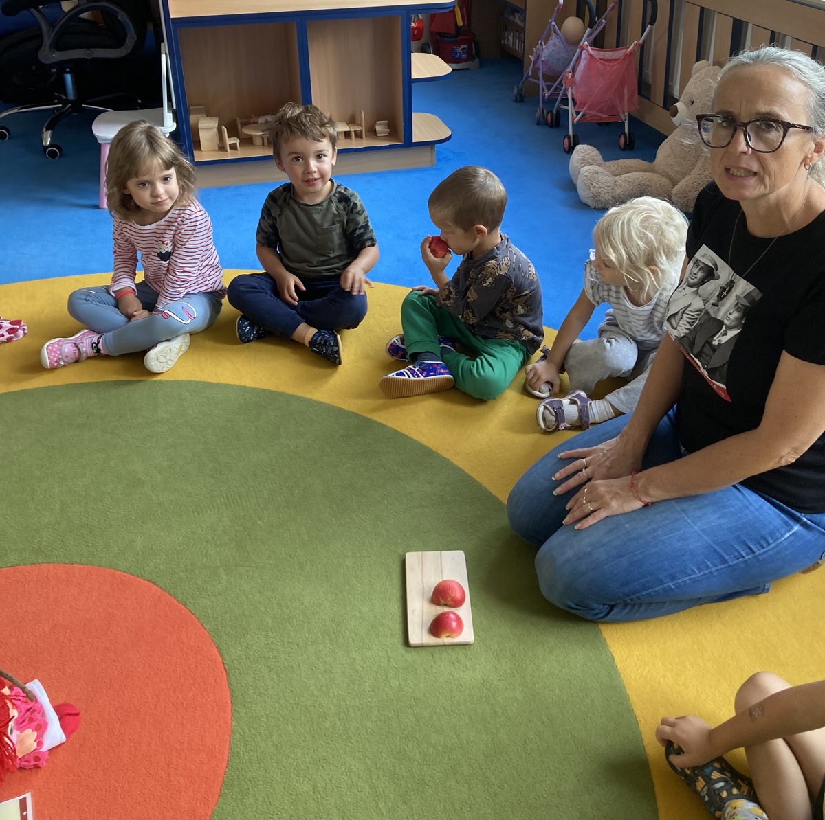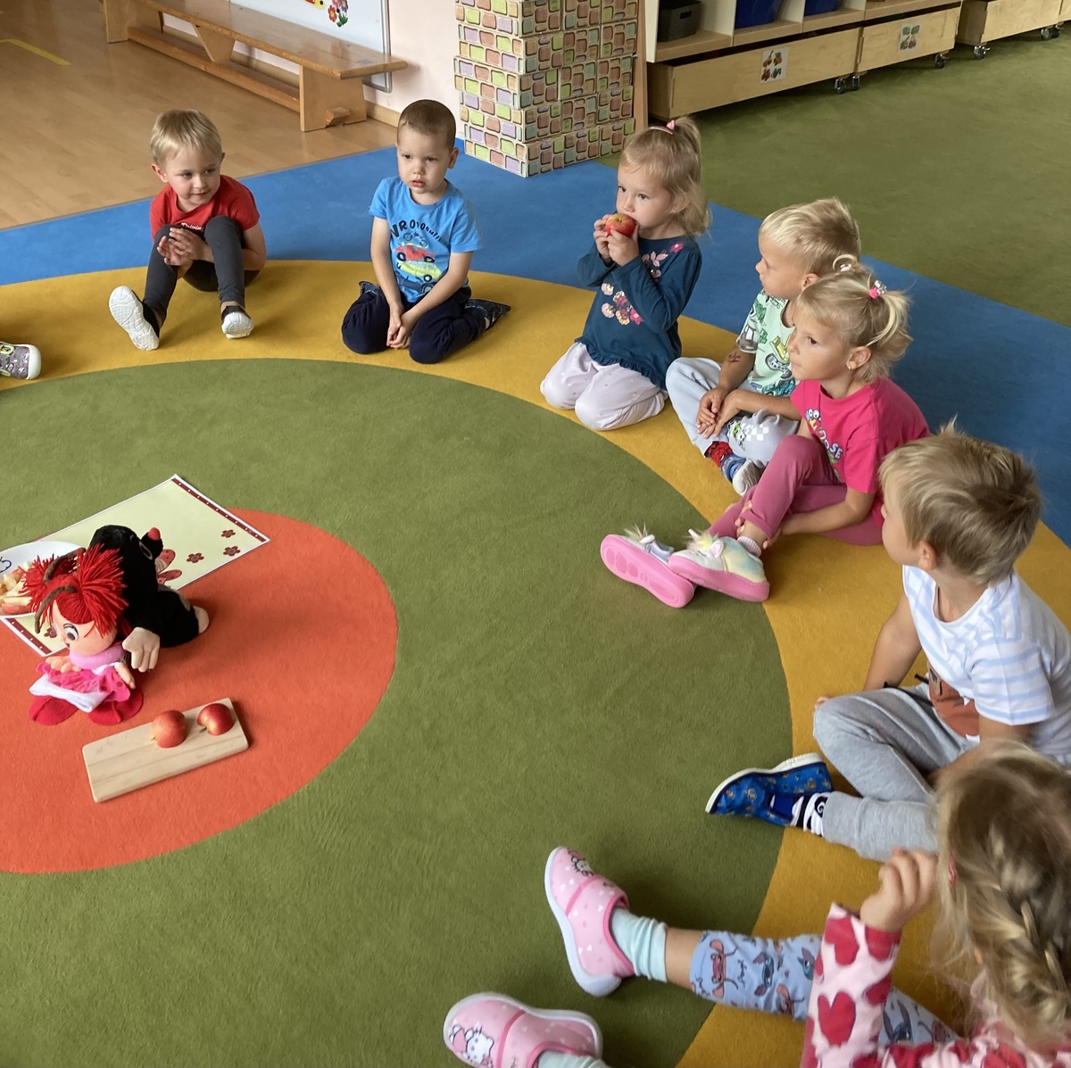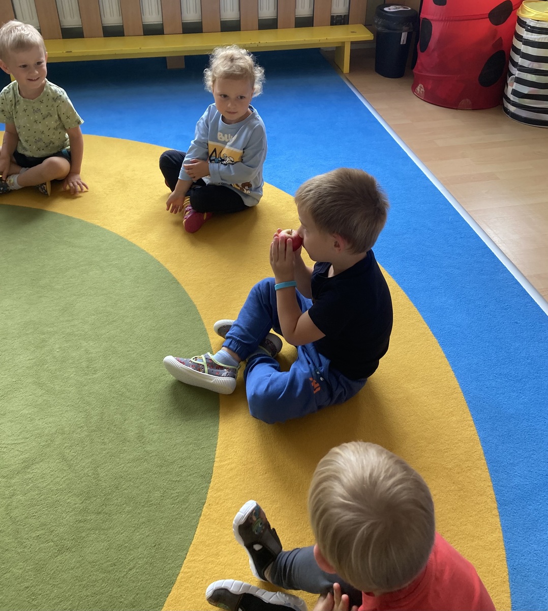 Nejdříve jsme si společně povídali o tvaru, barvě, vůni, prospěšnosti pro lidské tělo, zdroji vitamínů…. Probíhal rozhovor, kdo na své zahradě má také jabloň a kde asi jablka, která ochutnáváme, vyrostla. Dětem bylo prozrazeno, že jablka vyrostla na školní zahradě. Při pobytu venku jsme jabloň vyhledali a dohodli jsme se, že ji budeme pozorovat v různou roční dobu a budeme sledovat její změny.
