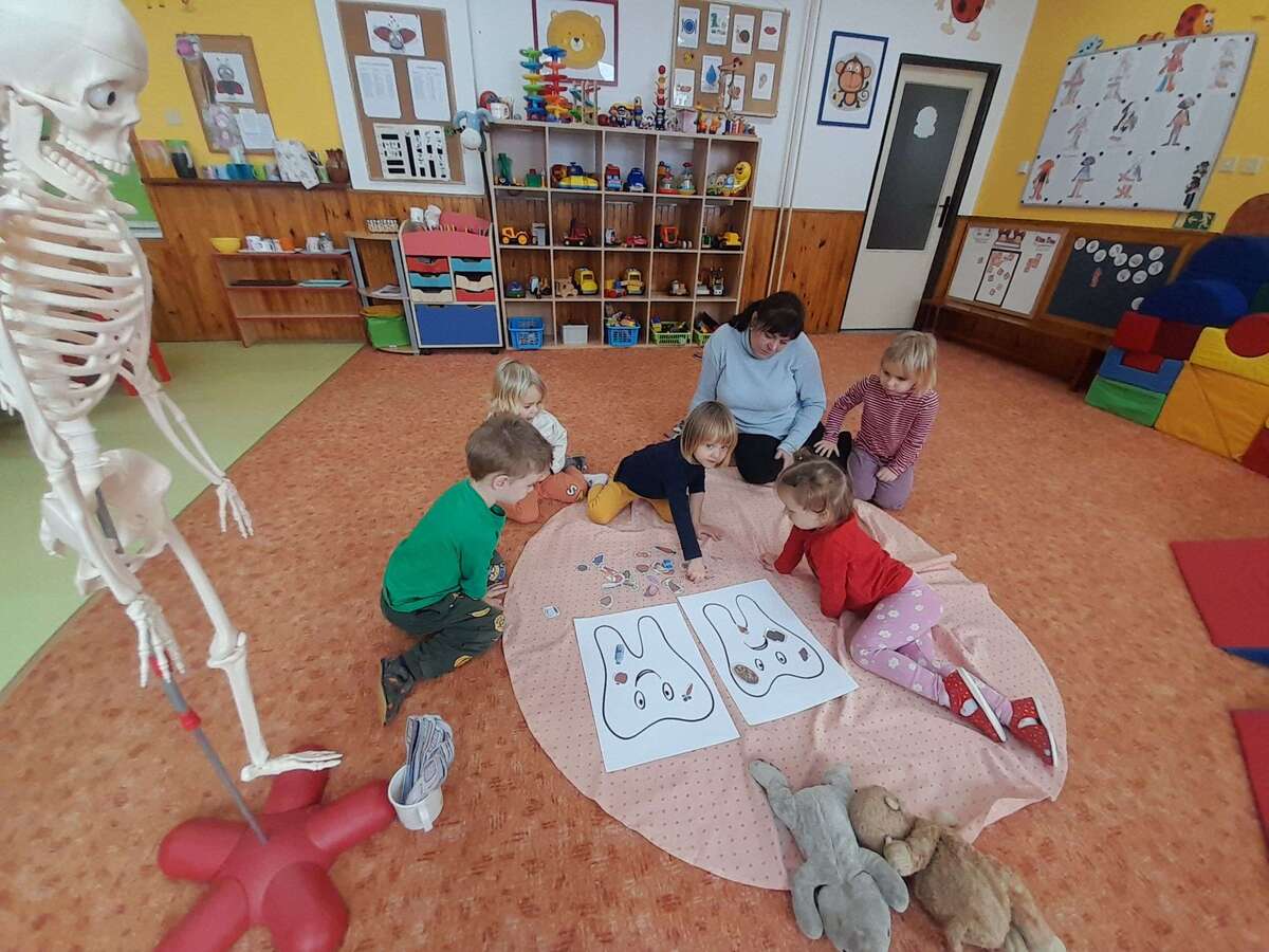 Jedním z prosincových témat v naší MŠ je Moje tělo a zdraví. To je ideální příležitost pro seznámení dětí s pojmy zdravá výživa, nebo ústní hygiena. S nejmenšími dětmi tomuto tématu věnujeme celý týden a snažíme se jim to přiblížit všemi smysly. Nejprve demonstračními obrázky, poté samotnou manipulasí s předměty a v neposlední řadě také konkrétními aktivitami. Používáme k těmto účelům zejména magnety, nebo kolíčky. Děti po seznámení s tématem už sami zkouší přiřazovat. Ukazujeme si zdravé a nezdravé jídlo fyzicky a povídáme si o chuti a dopadu na naše zdraví.